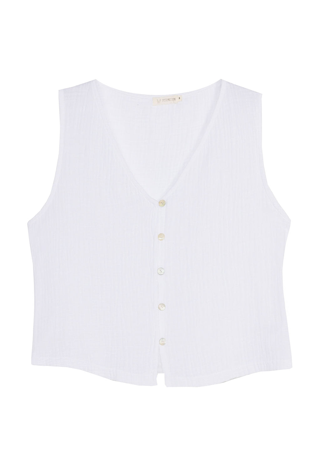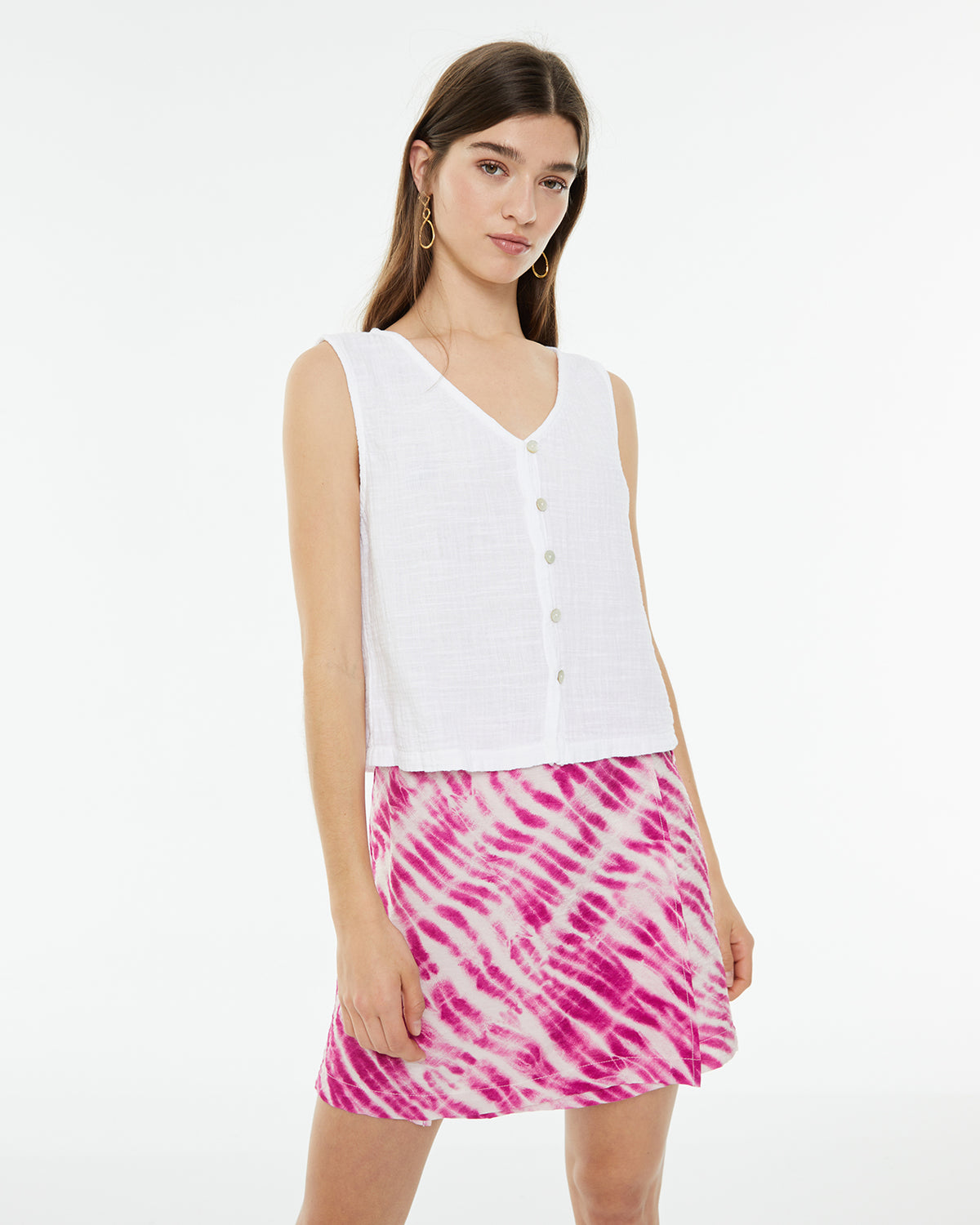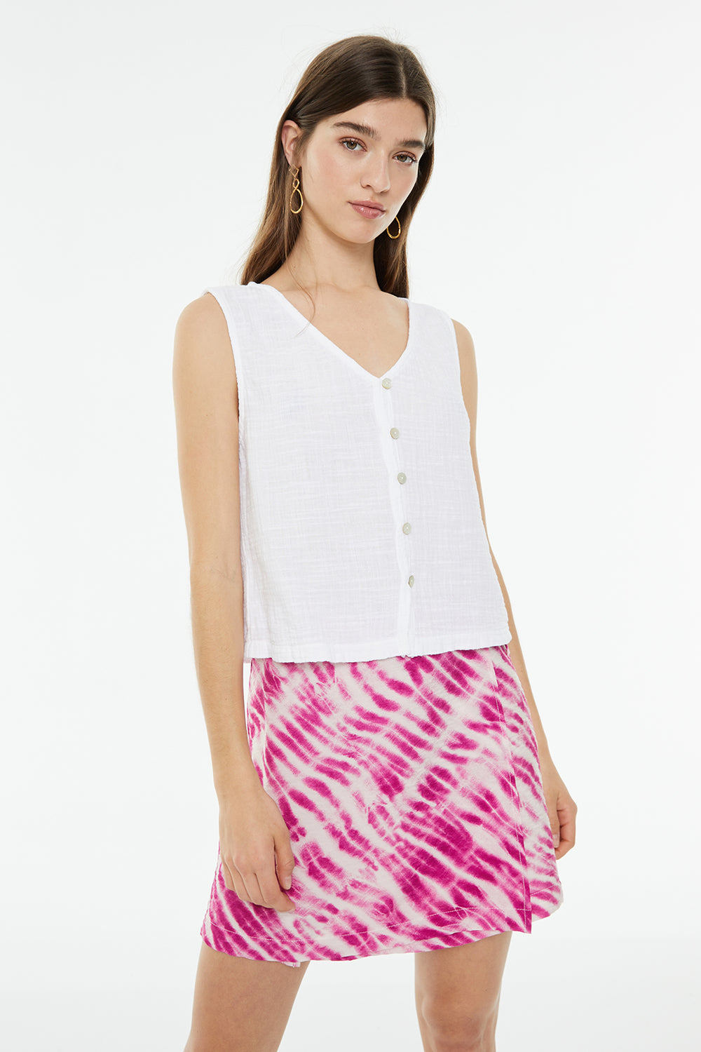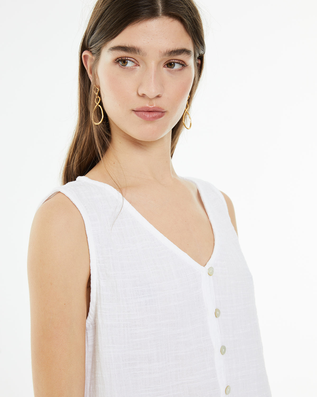 Top de mujer de tirantes, cuello pico, cierre con botones delanteros. Prenda sostenible.