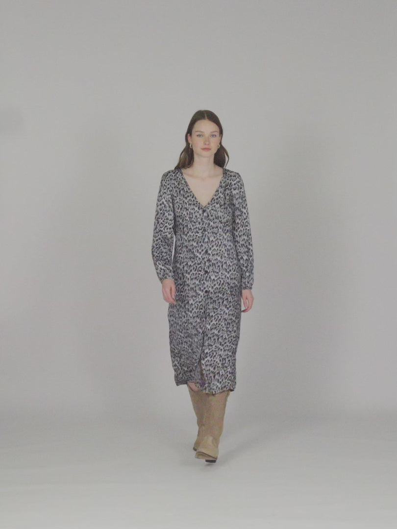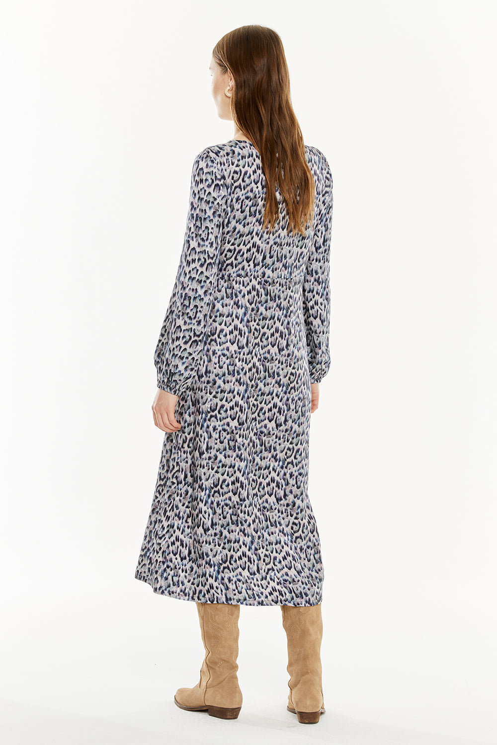 Vestido midi de mujer, con estampado animal print, escote pico y manga larga con goma en los puños. Prenda sostenible.