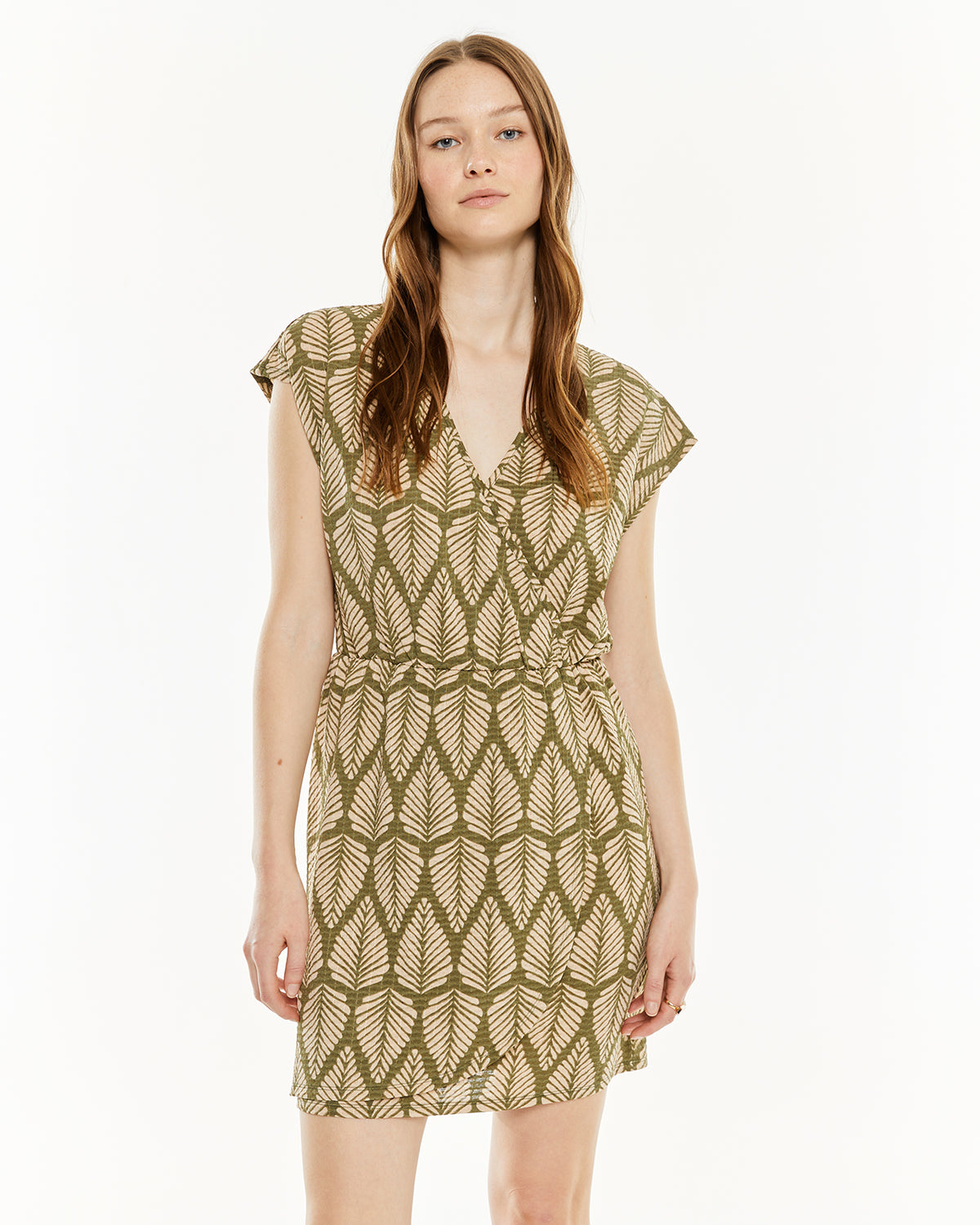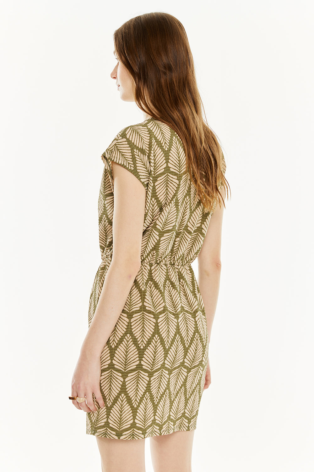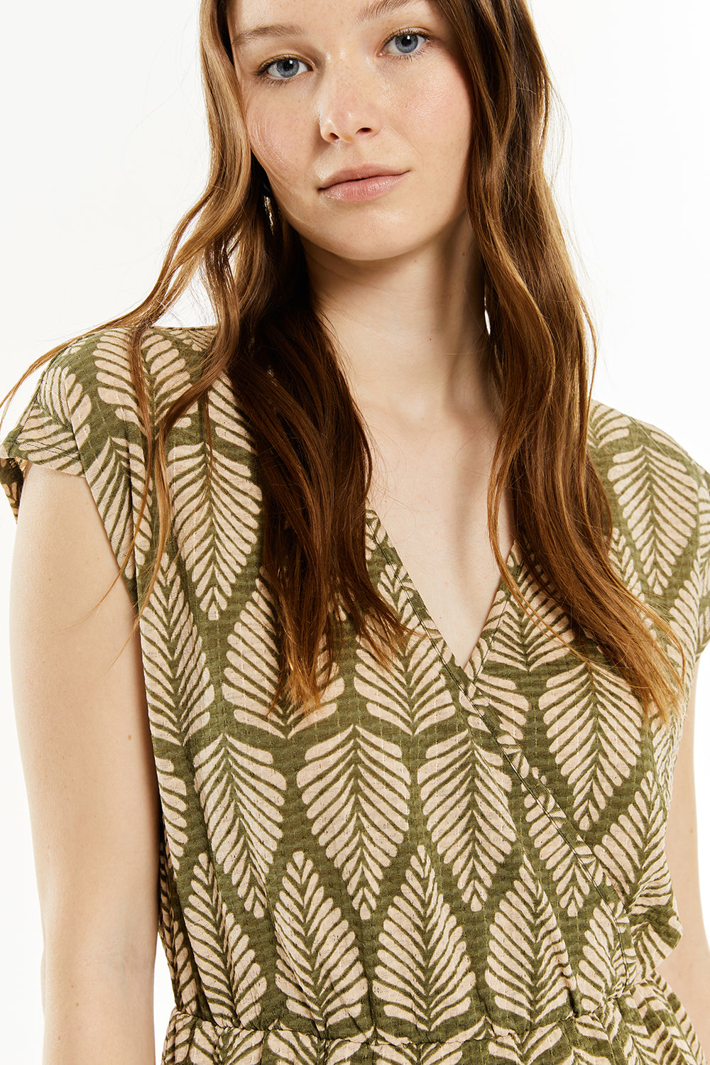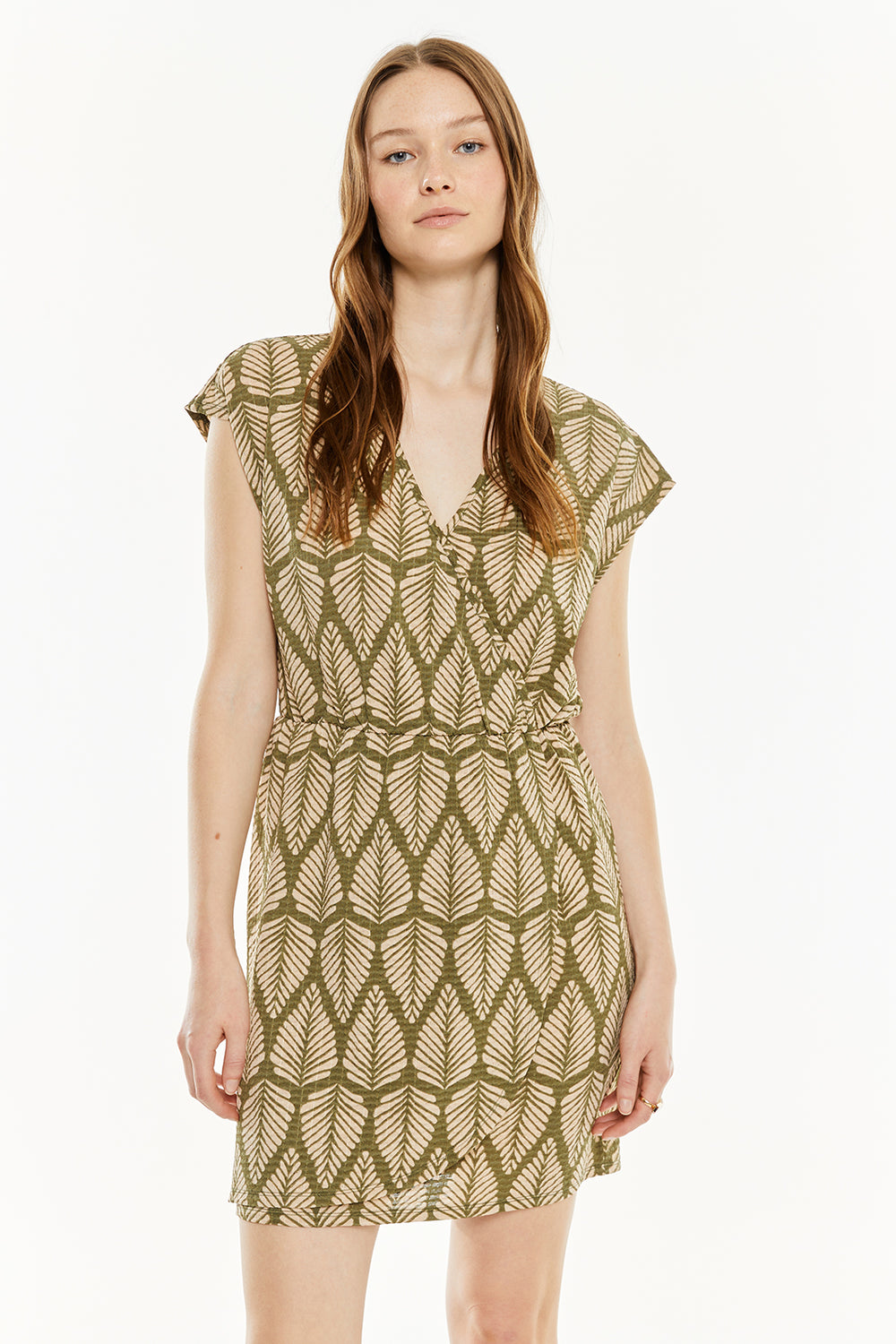 Vestido corto de mujer con escote cruzado y goma en la cintura. Prenda estampada.