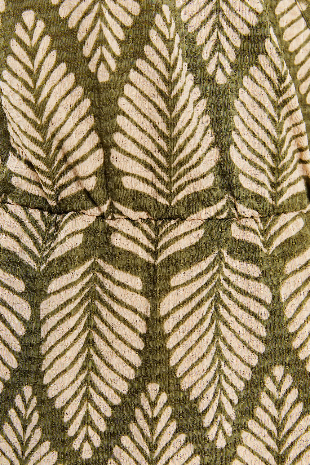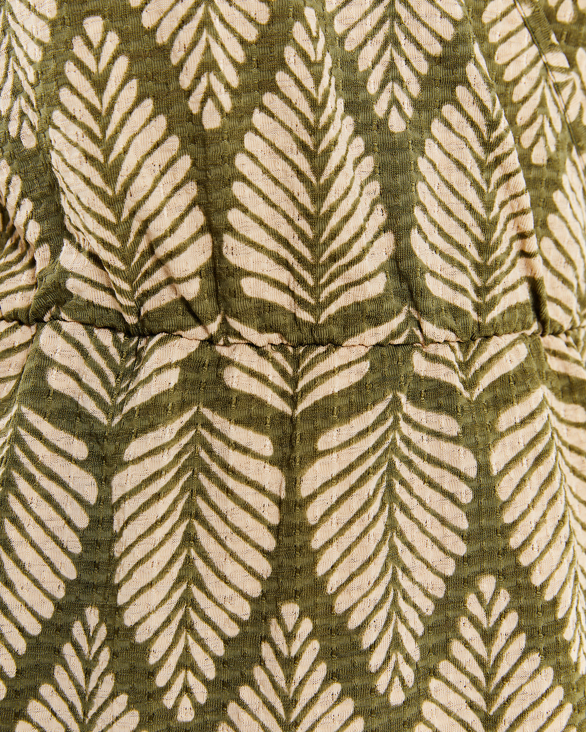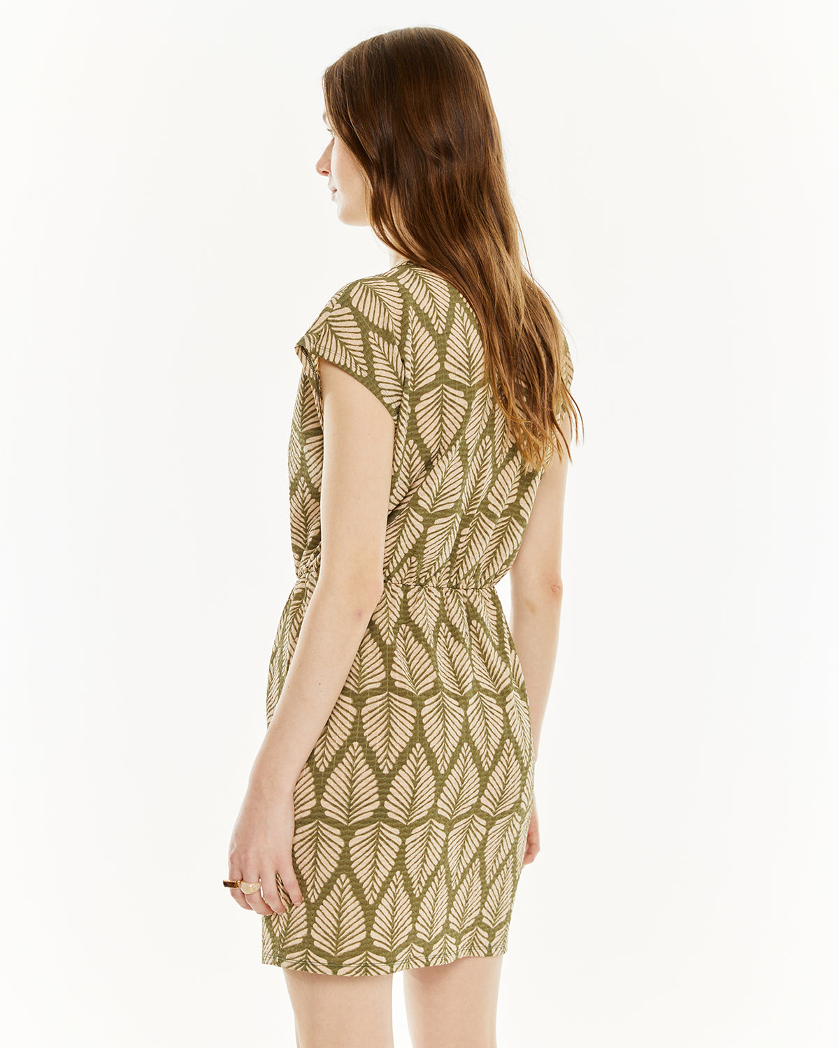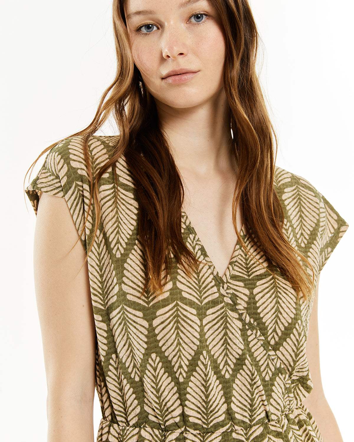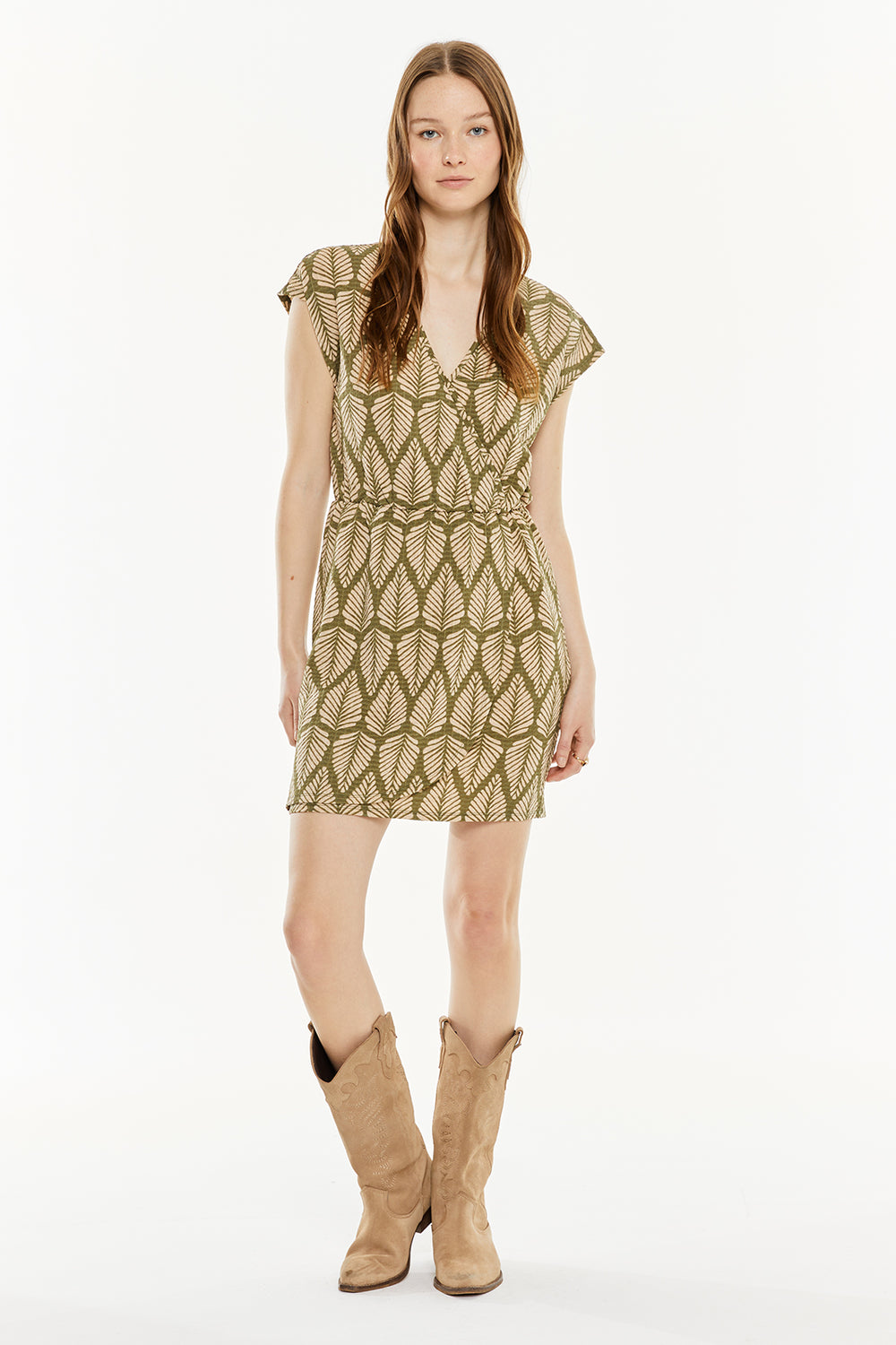 Vestido corto de mujer con escote cruzado y goma en la cintura. Prenda estampada.
