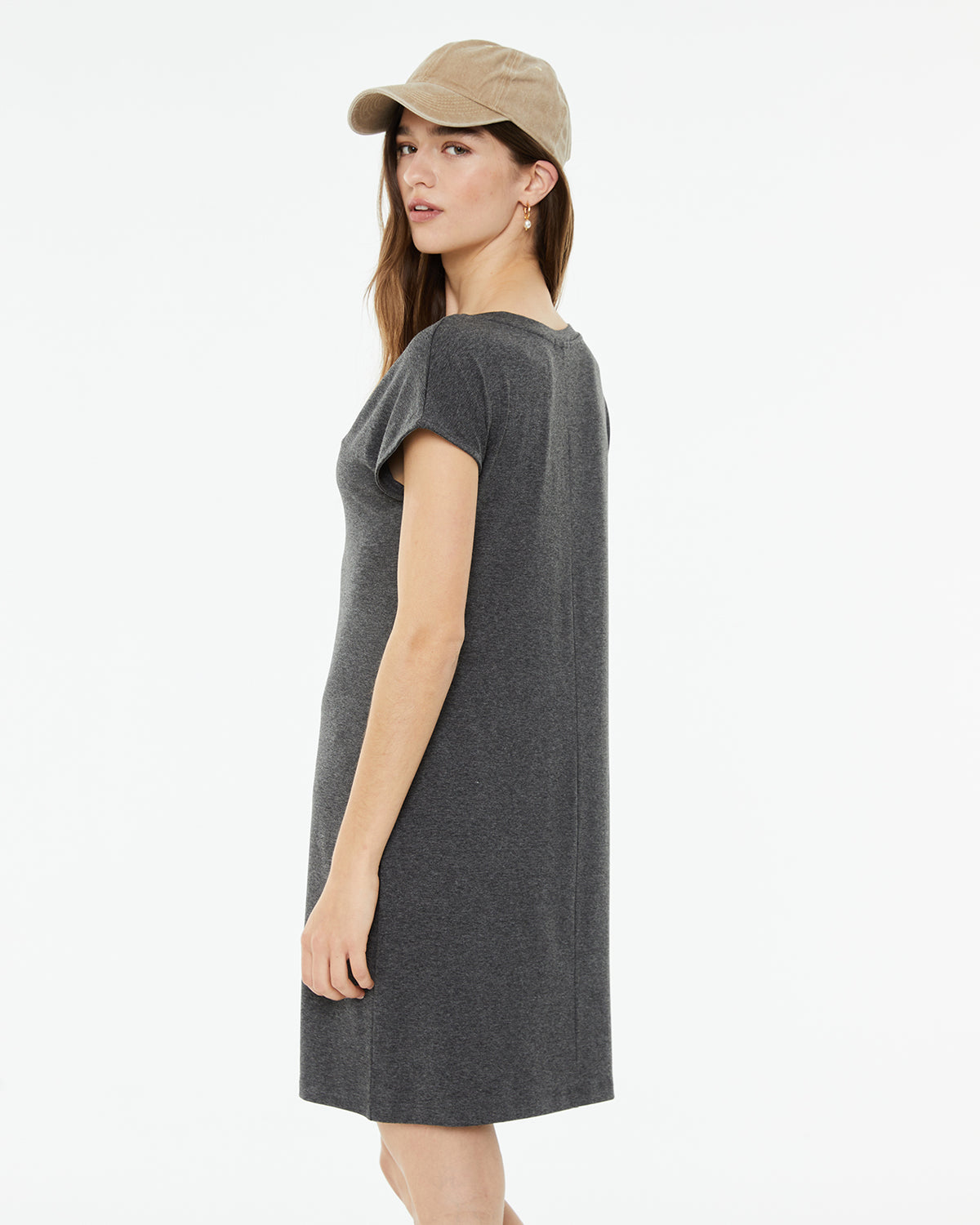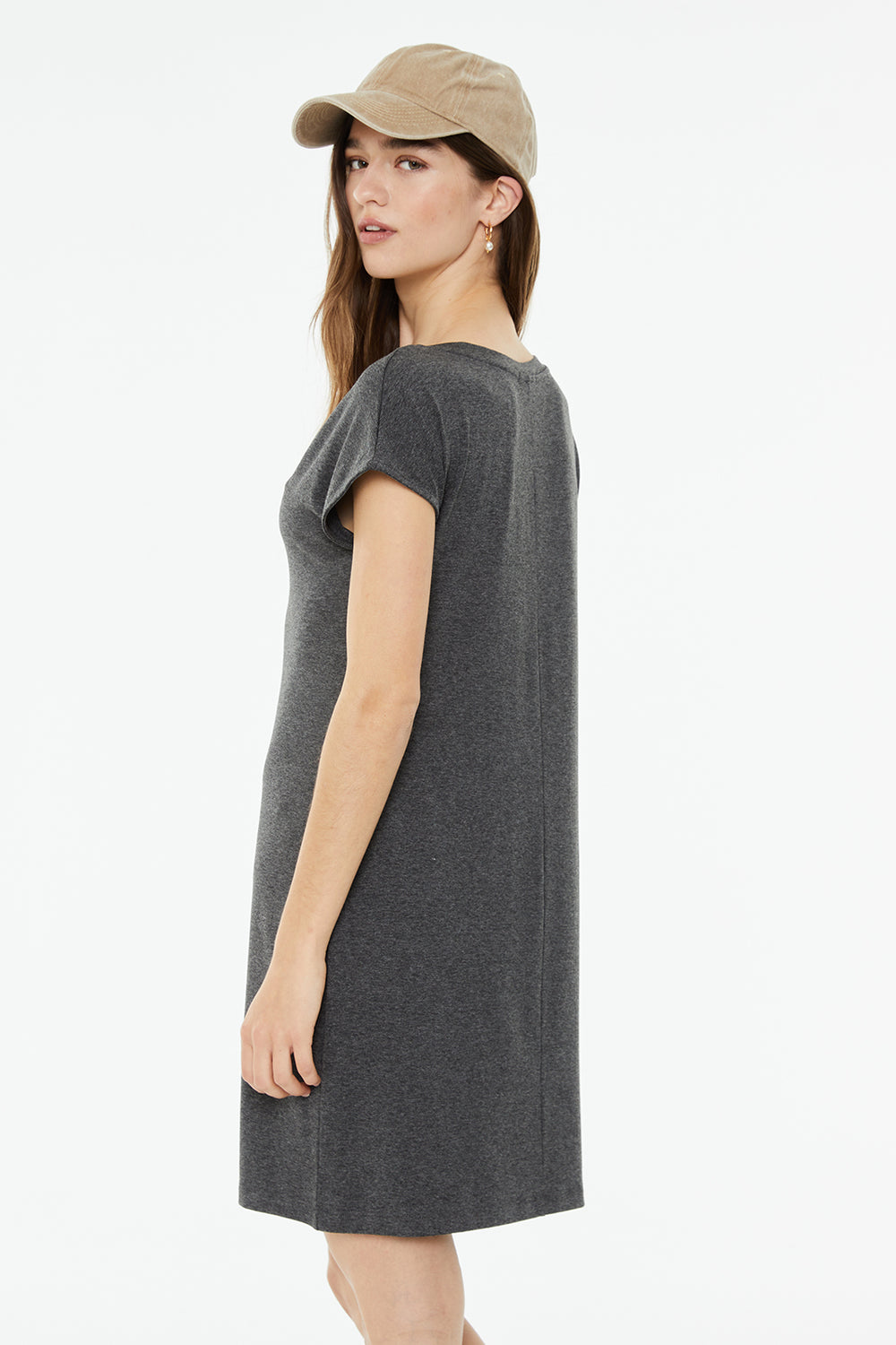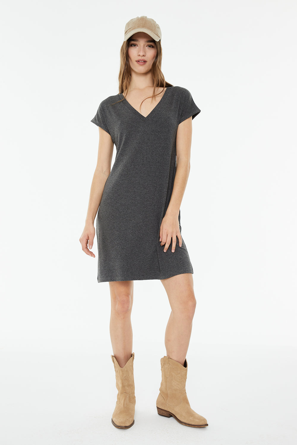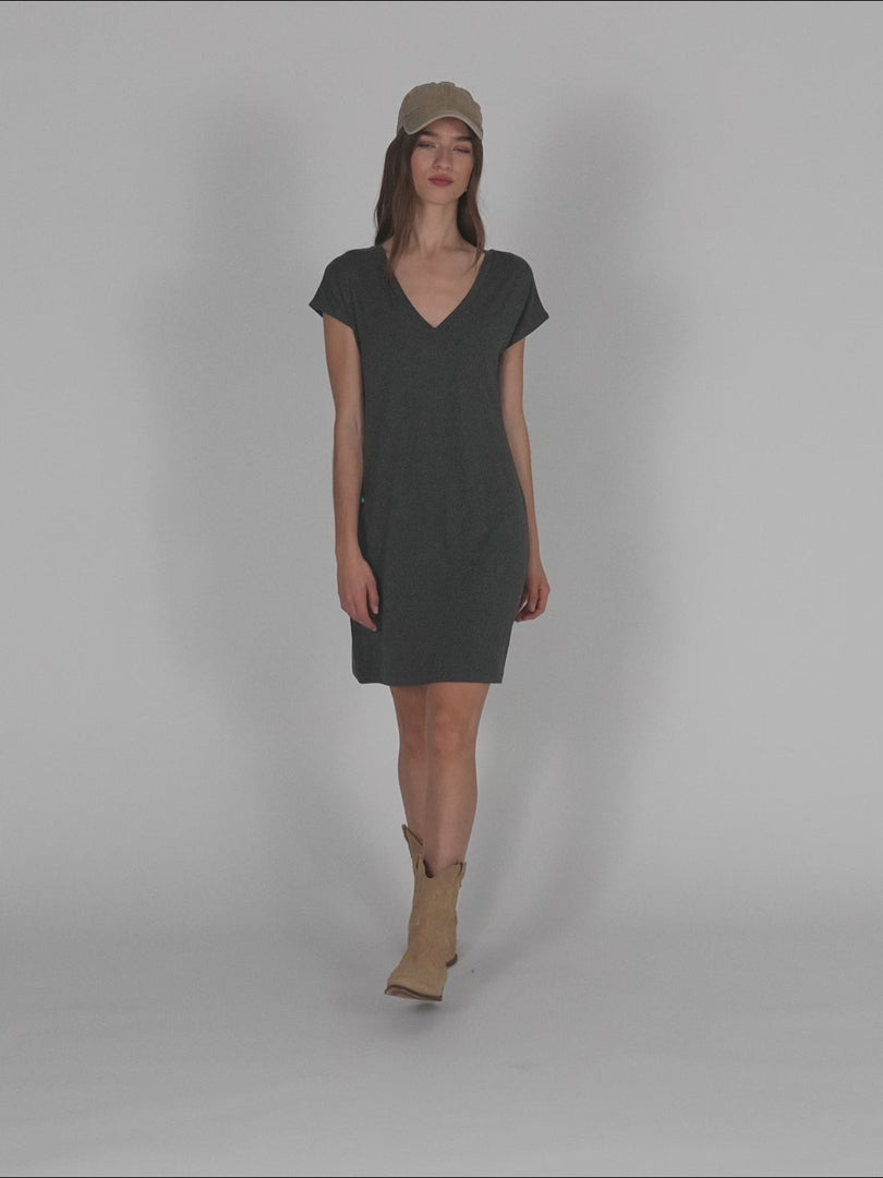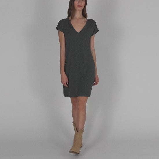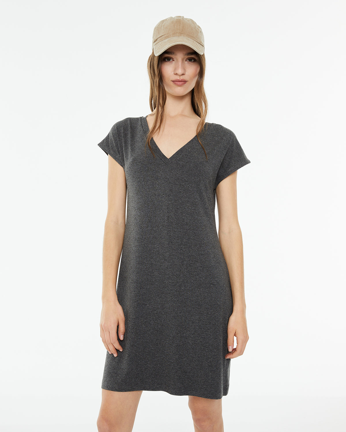 Vestido de mujer corto, escote pico, manga caída. Prenda sostenible.