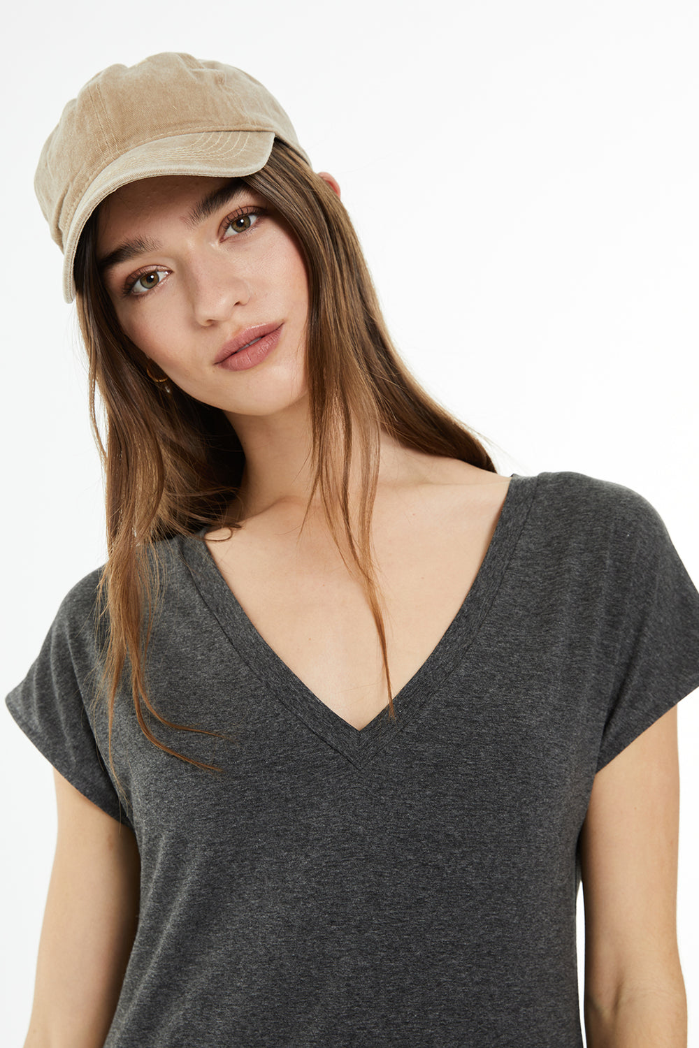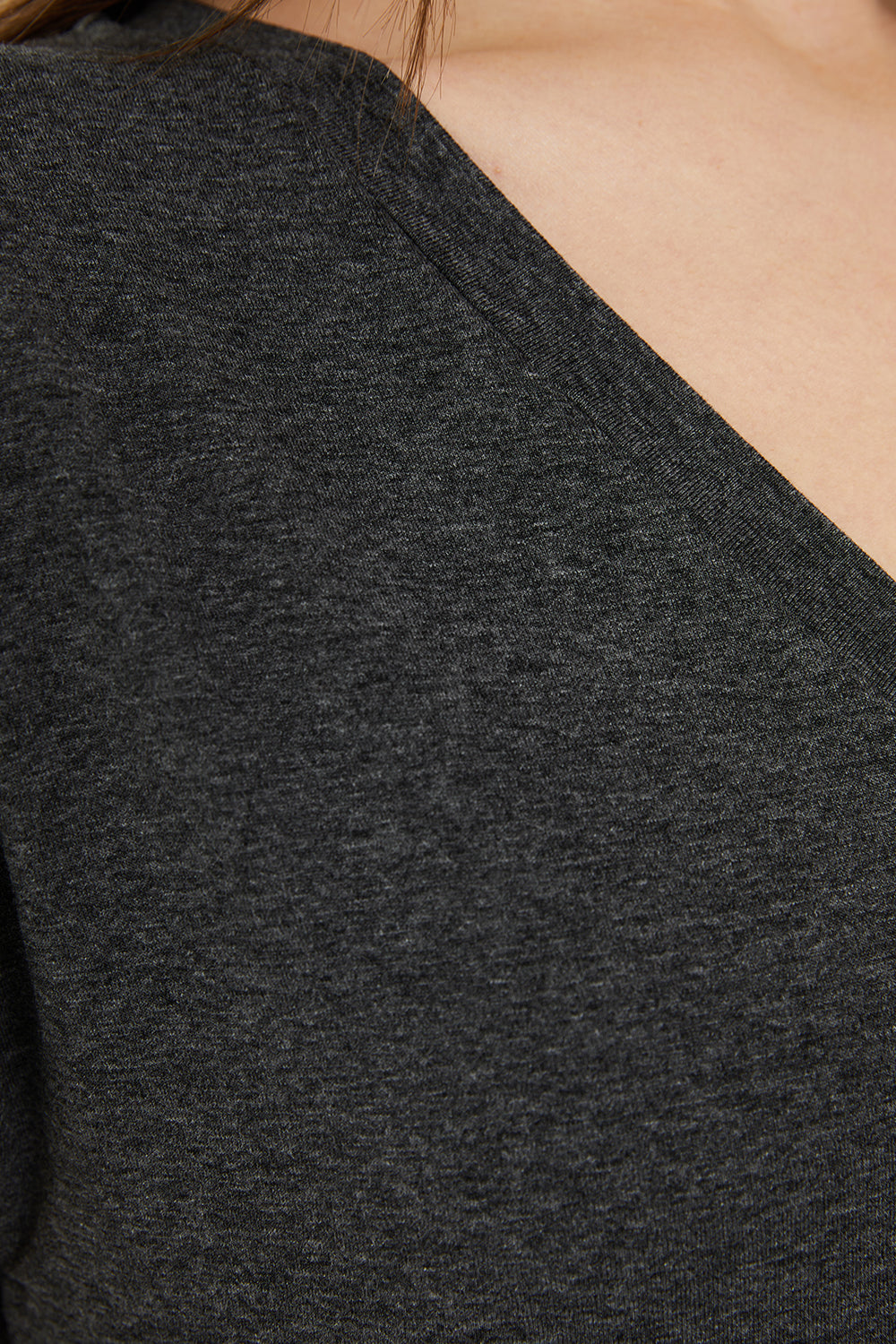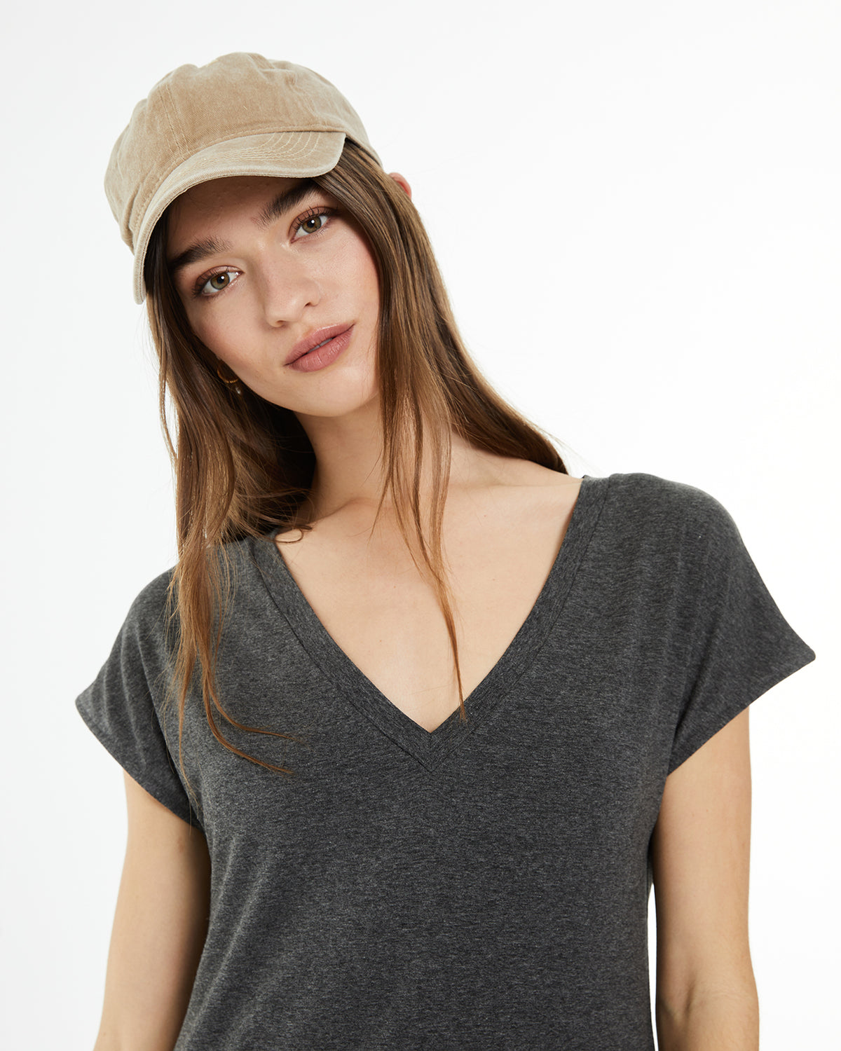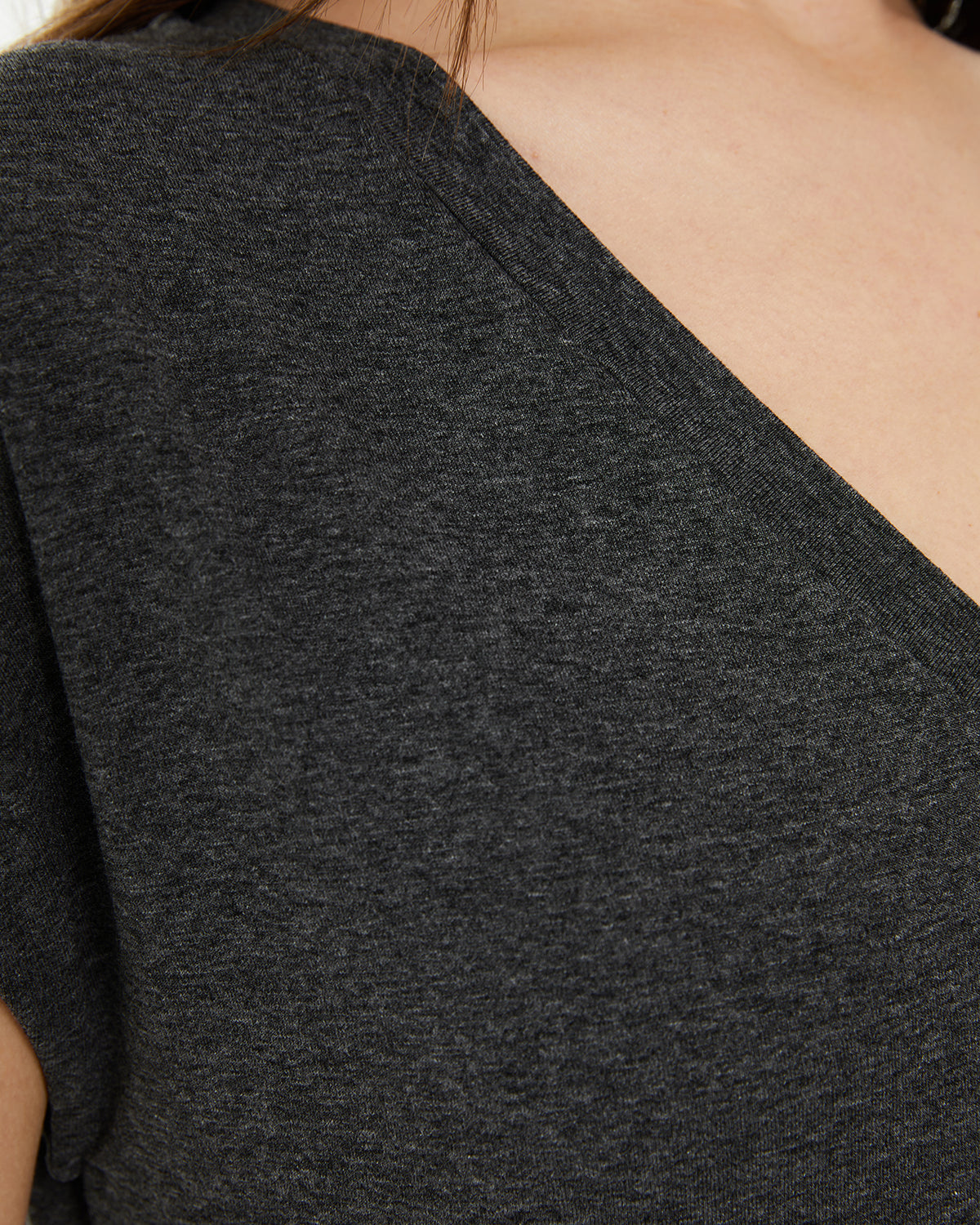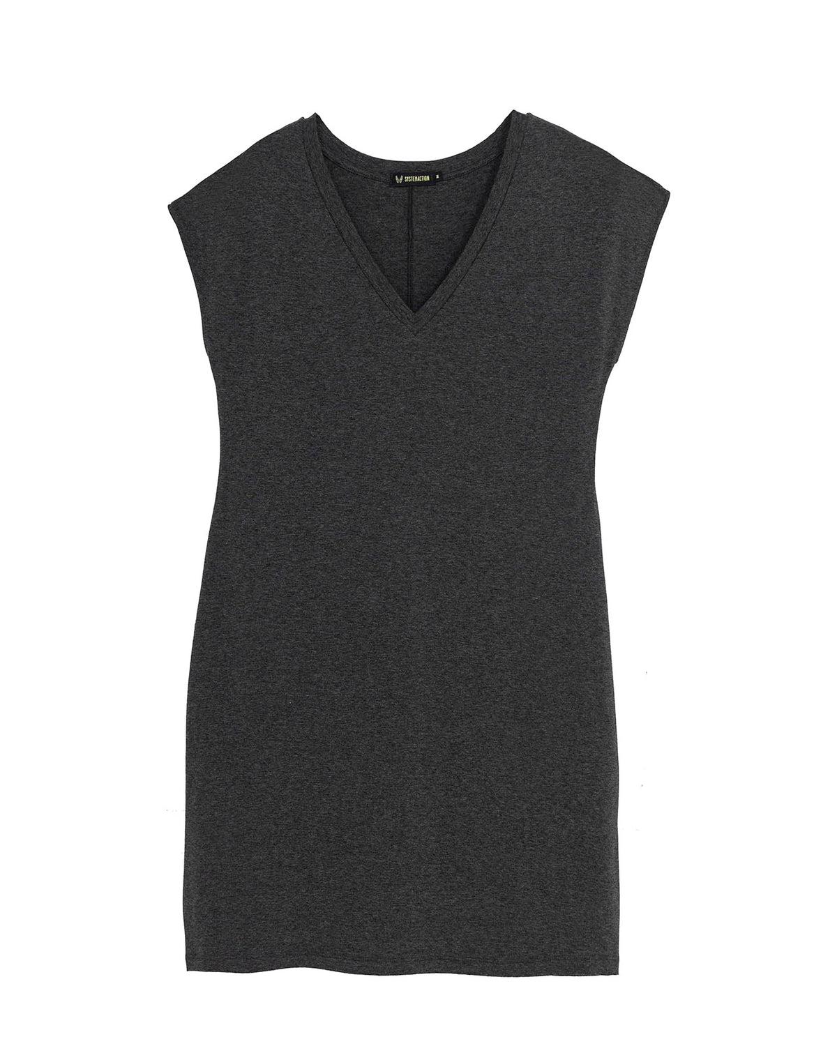 Vestido de mujer corto, escote pico, manga caída. Prenda sostenible.