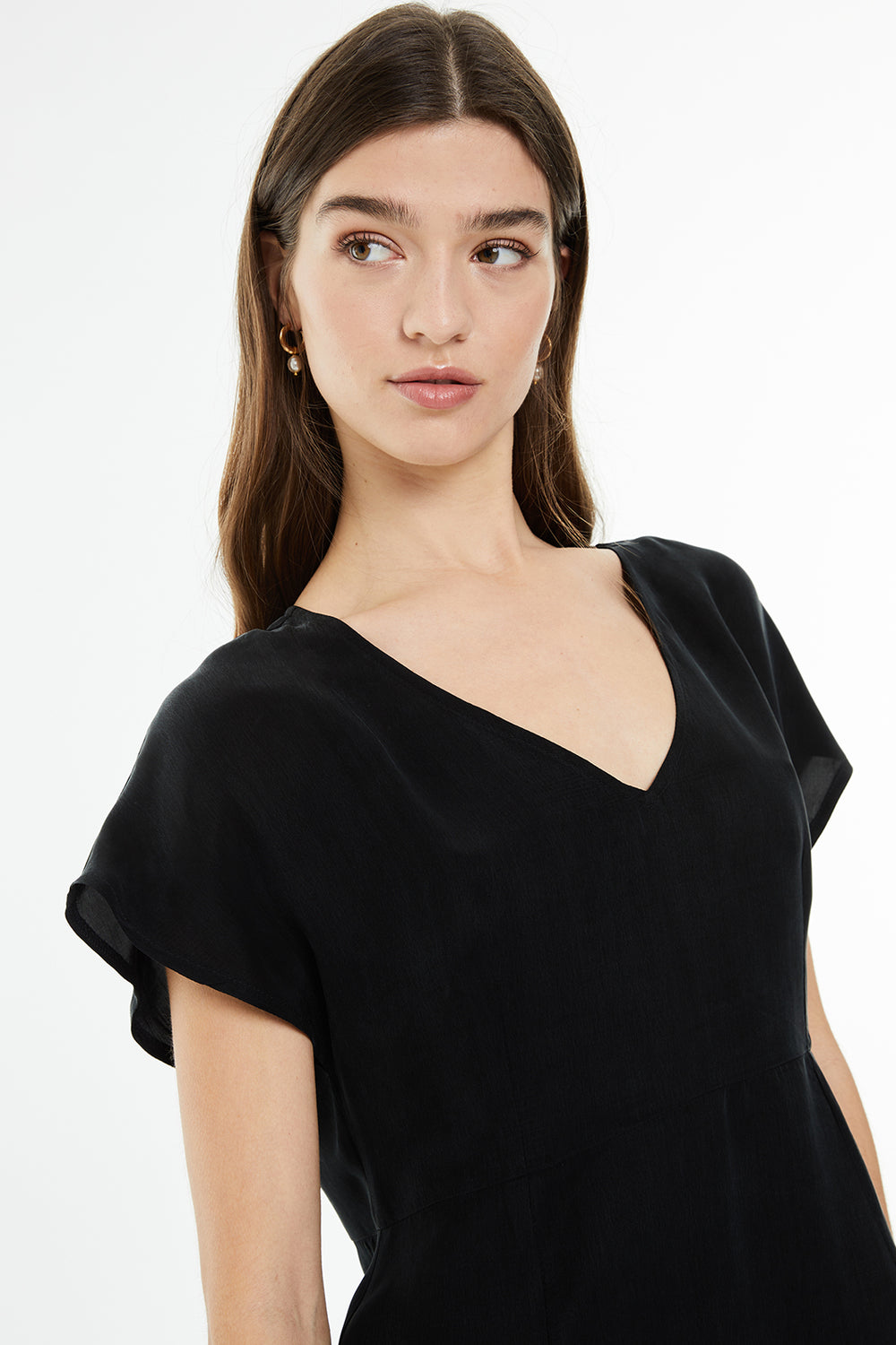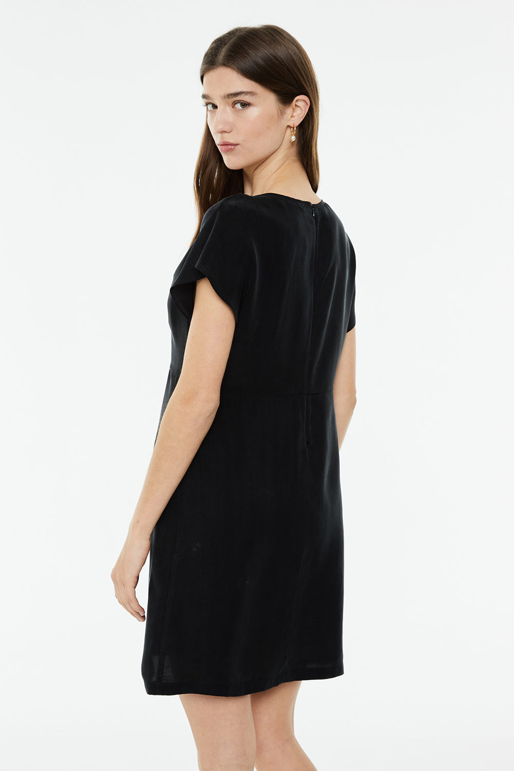 Vestido corto de cupro, con escote pico y tirante ancho.