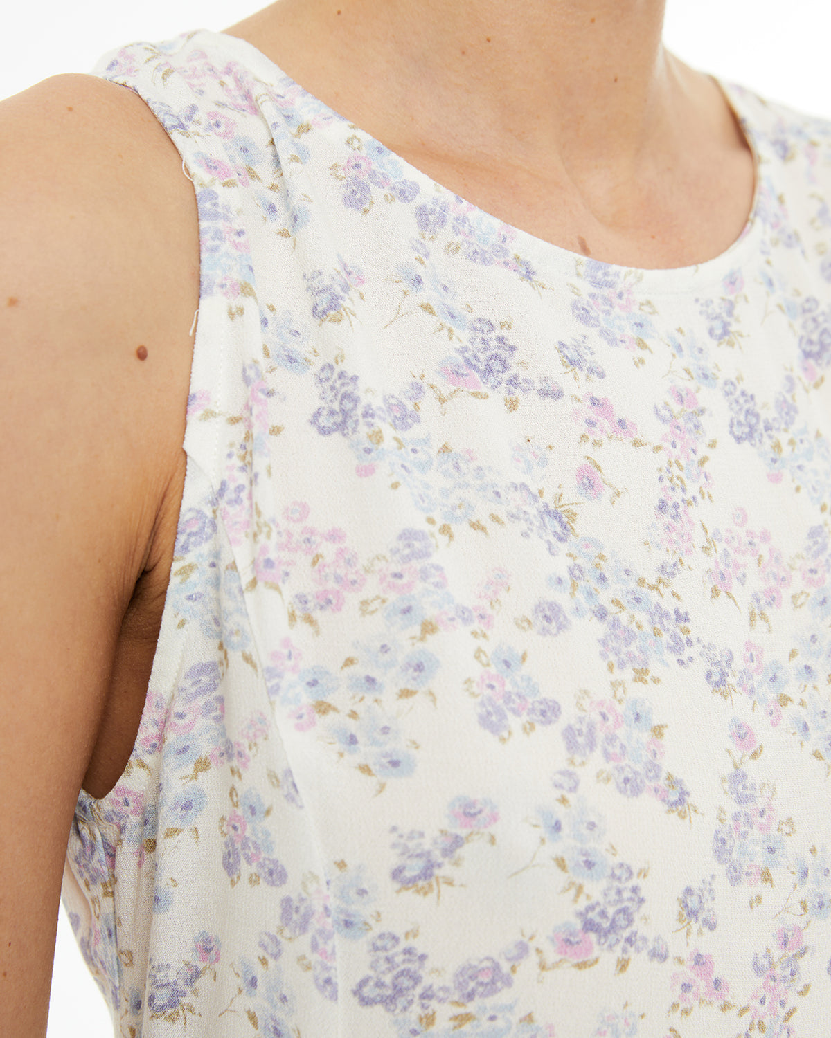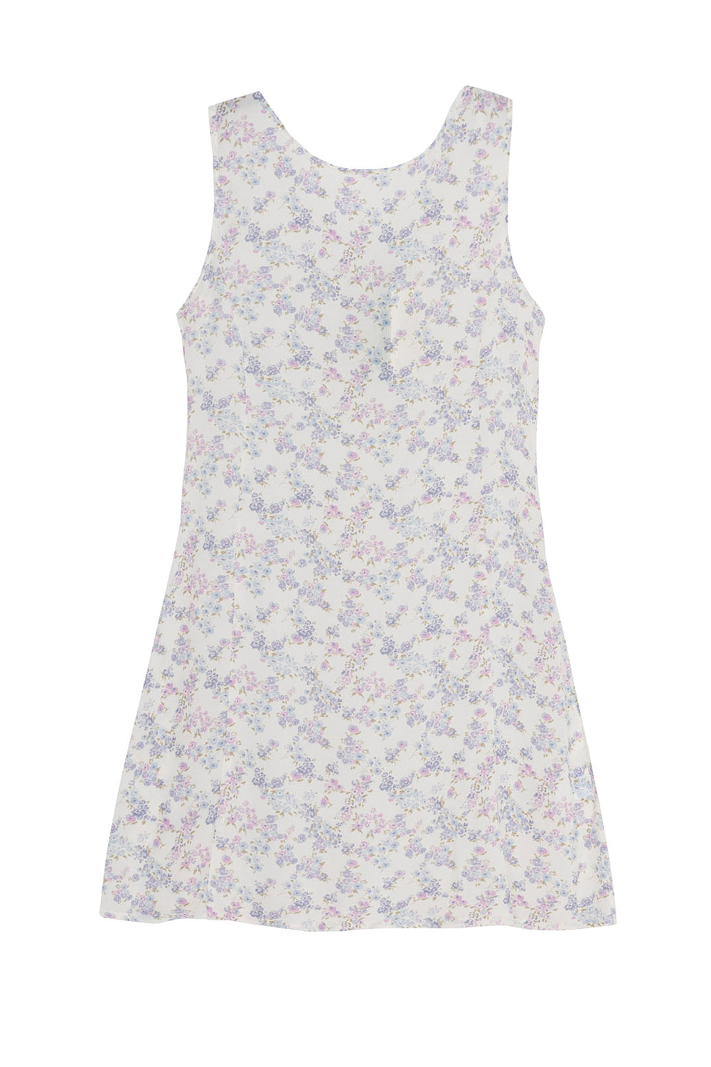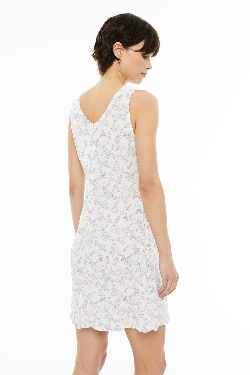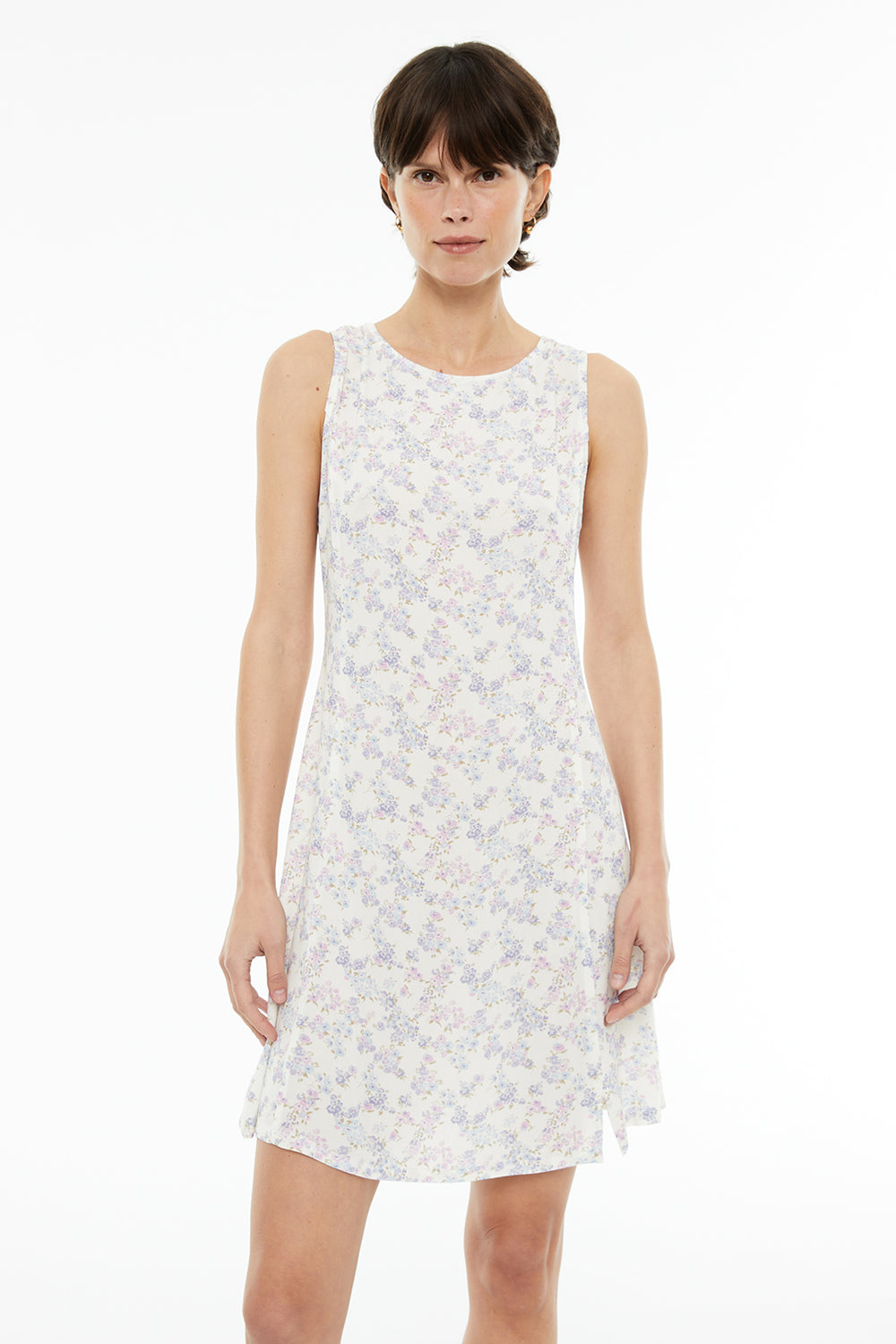 Vestido de mujer corto con estampado de flores, escote redondo a caja, costadillos en el cuerpo y detalle de abertura en el delantero. Prenda sostenible.