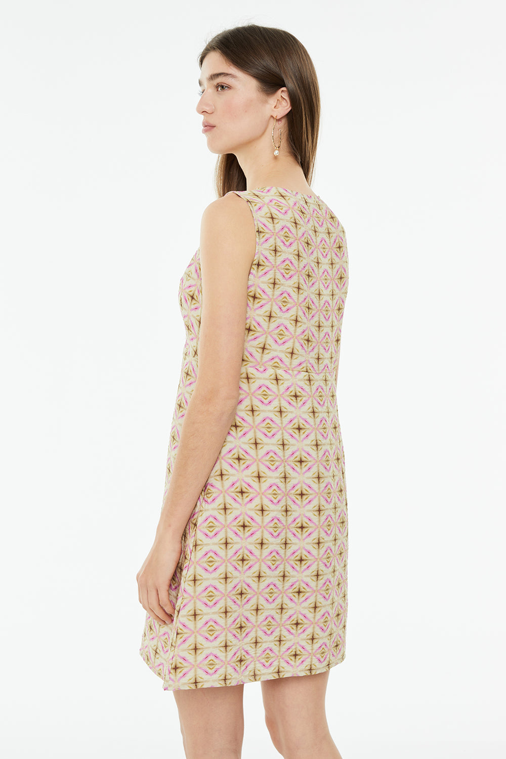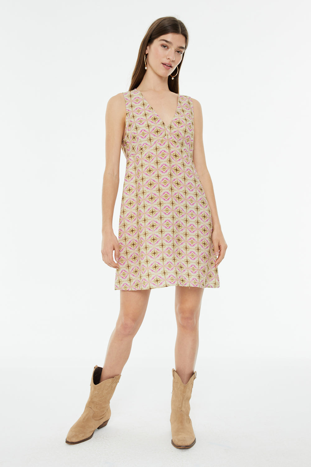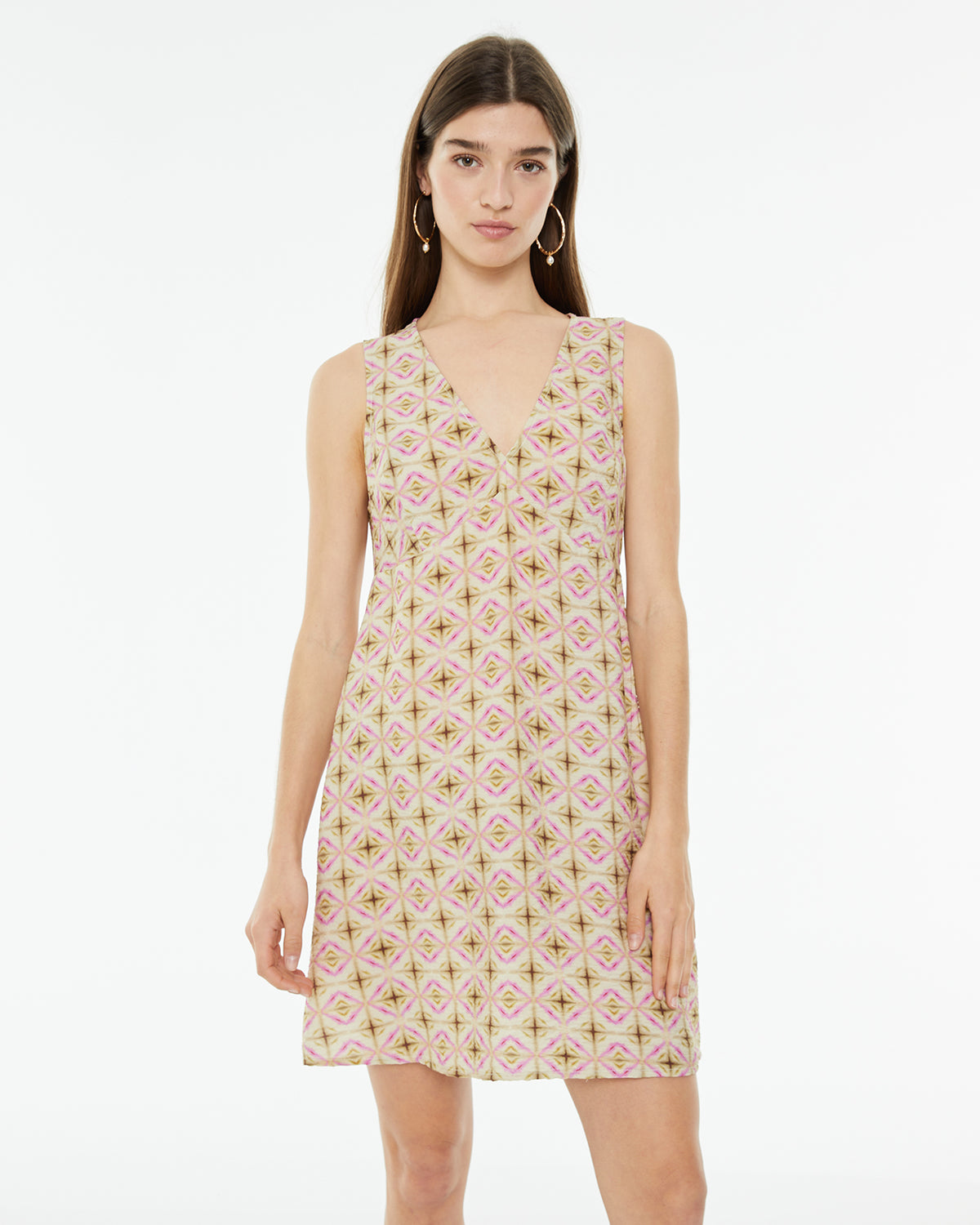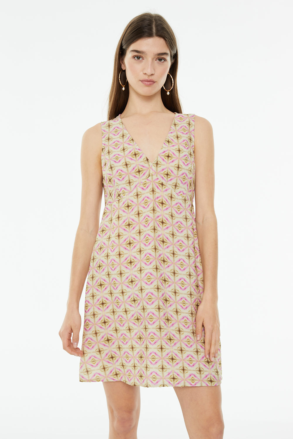 Vestido corto de mujer con un estampado geométrico, escote pico y corte bajo pecho. Cierre con cremallera lateral. Prenda sostenible.