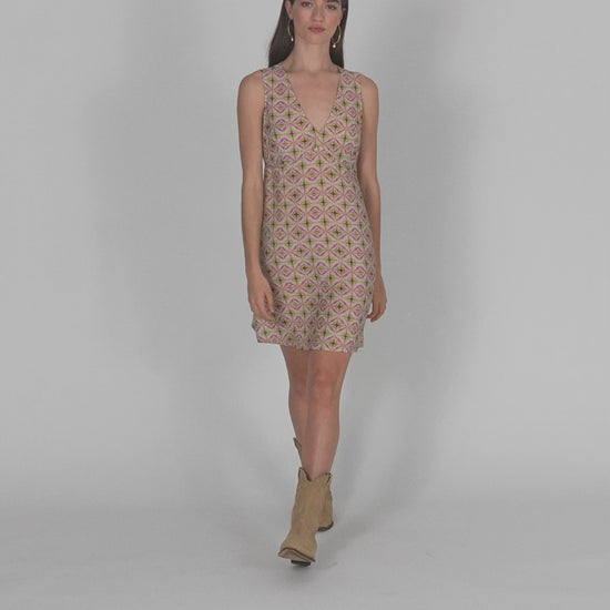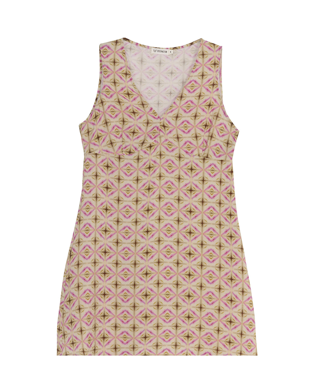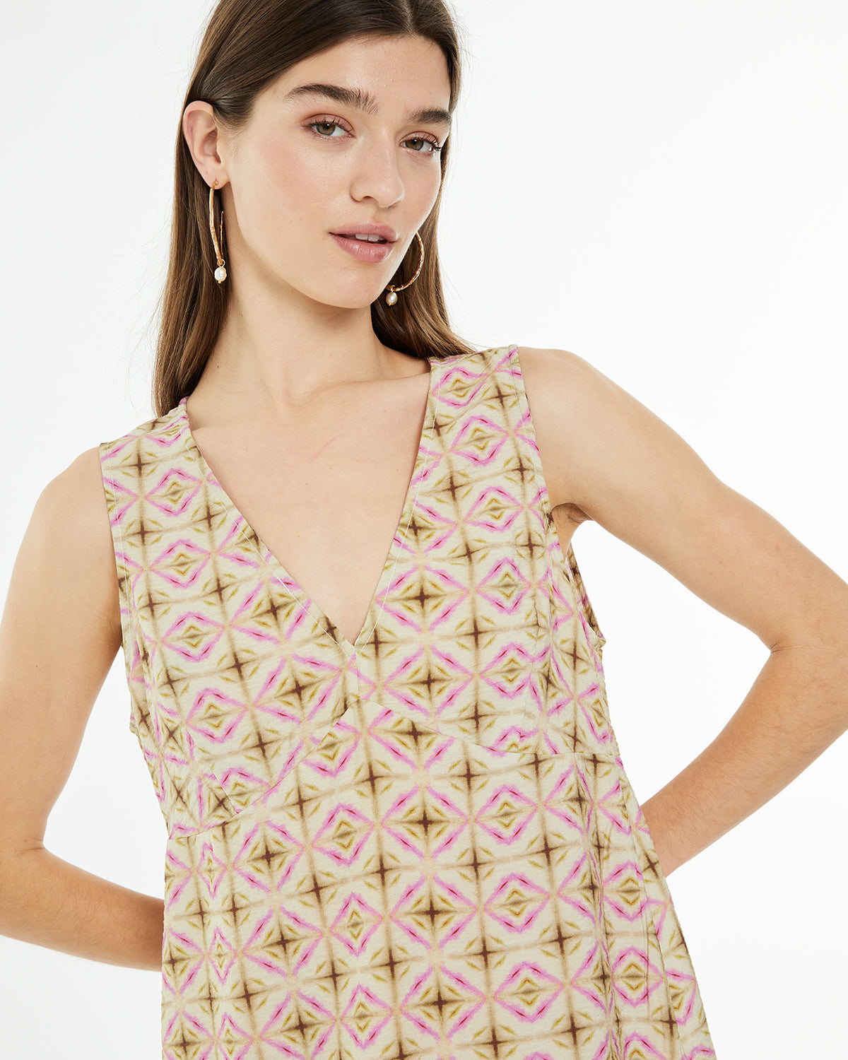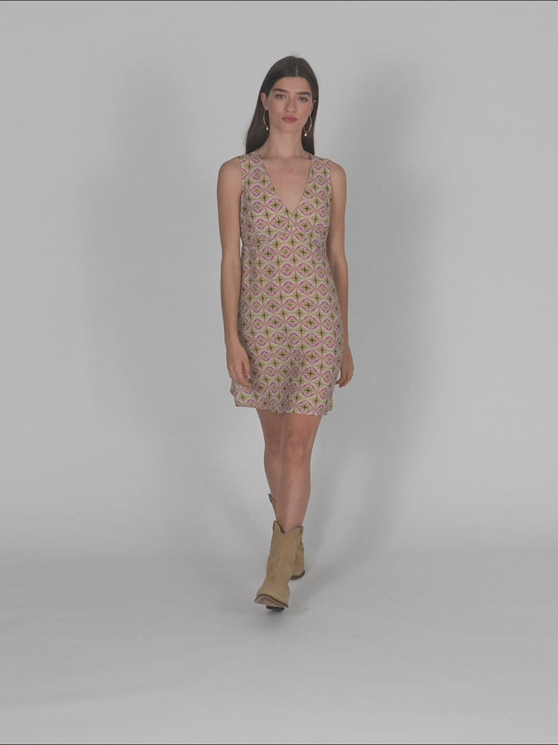 Vestido corto de mujer con un estampado geométrico, escote pico y corte bajo pecho. Cierre con cremallera lateral. Prenda sostenible.