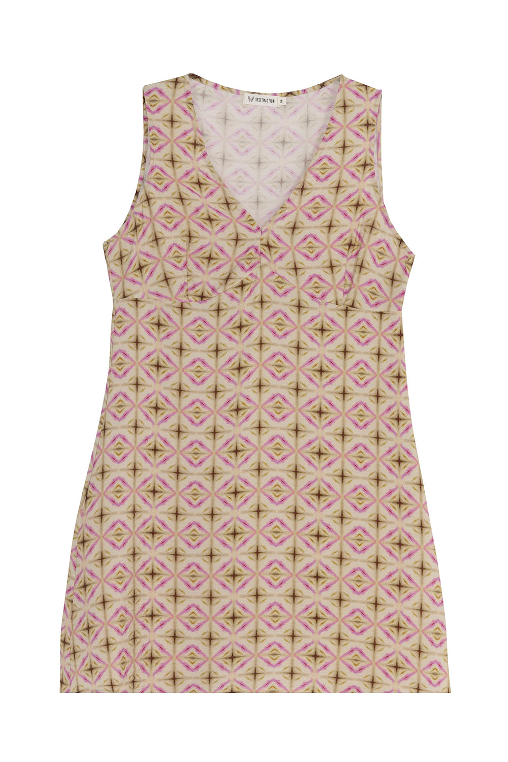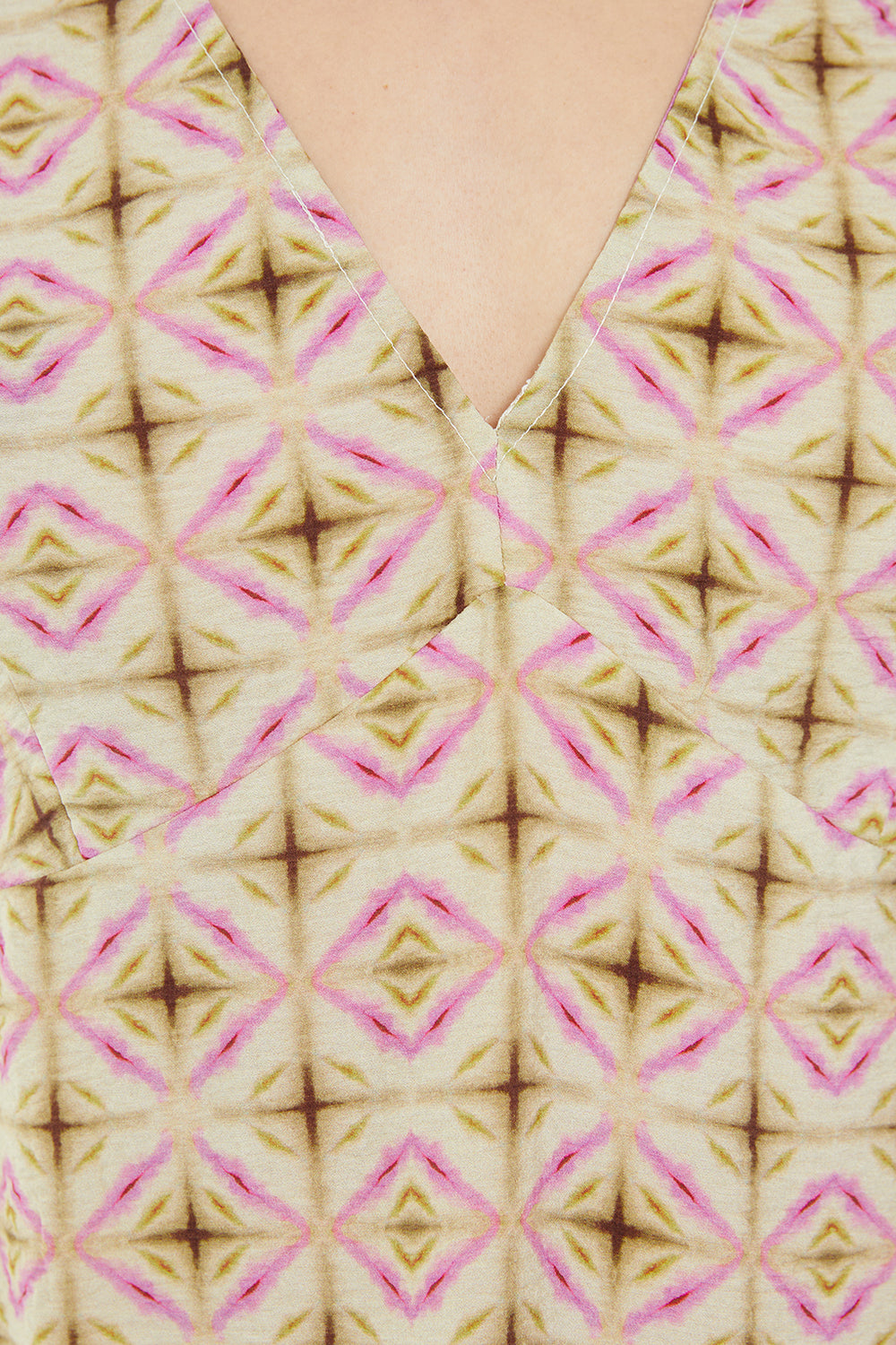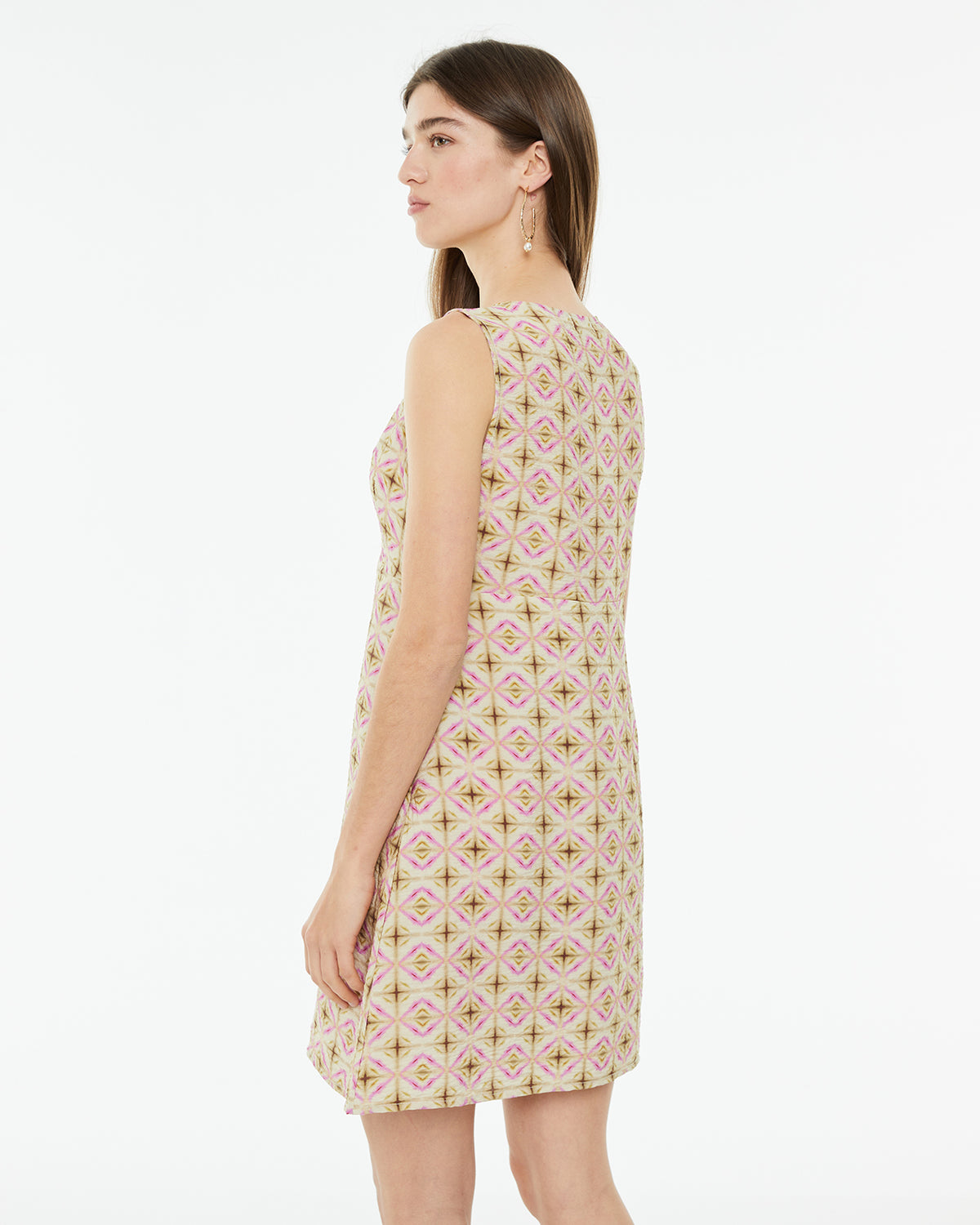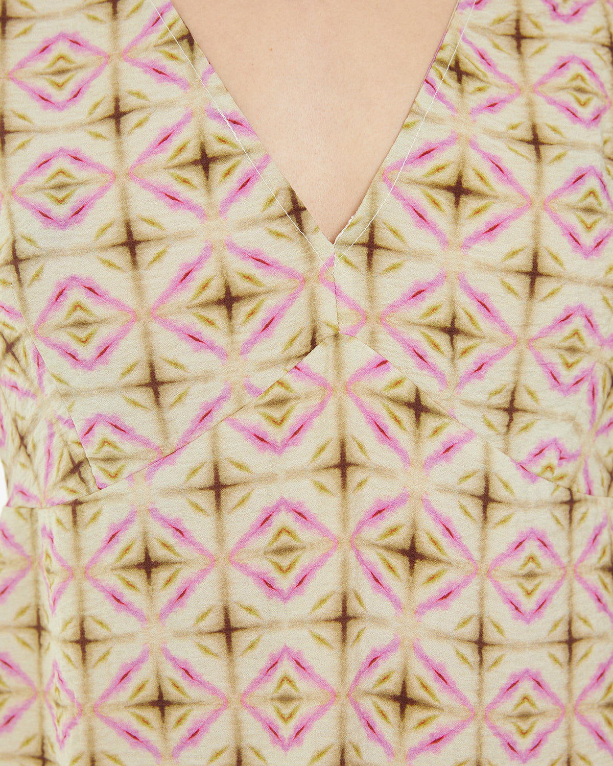 Vestido corto de mujer con un estampado geométrico, escote pico y corte bajo pecho. Cierre con cremallera lateral. Prenda sostenible.