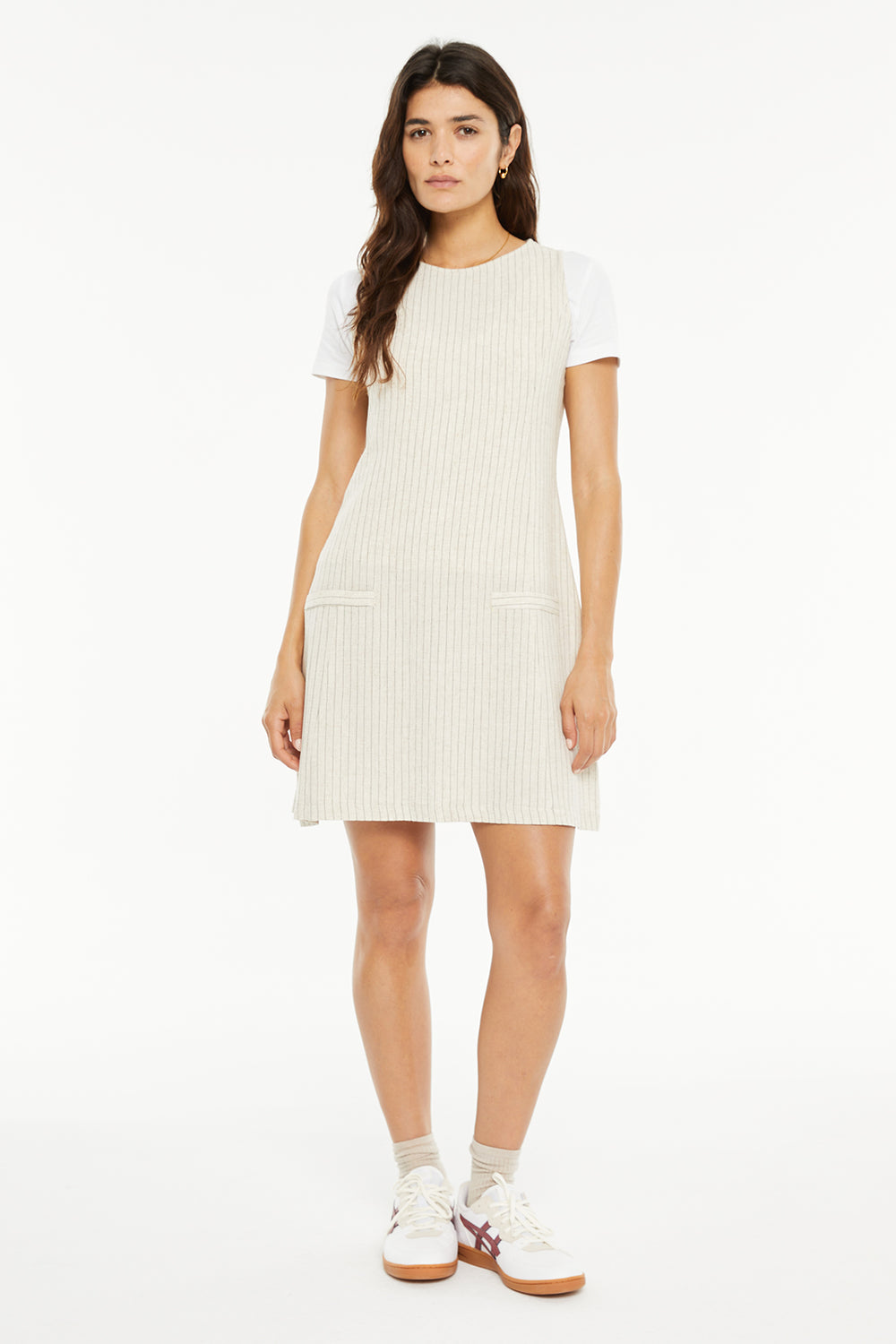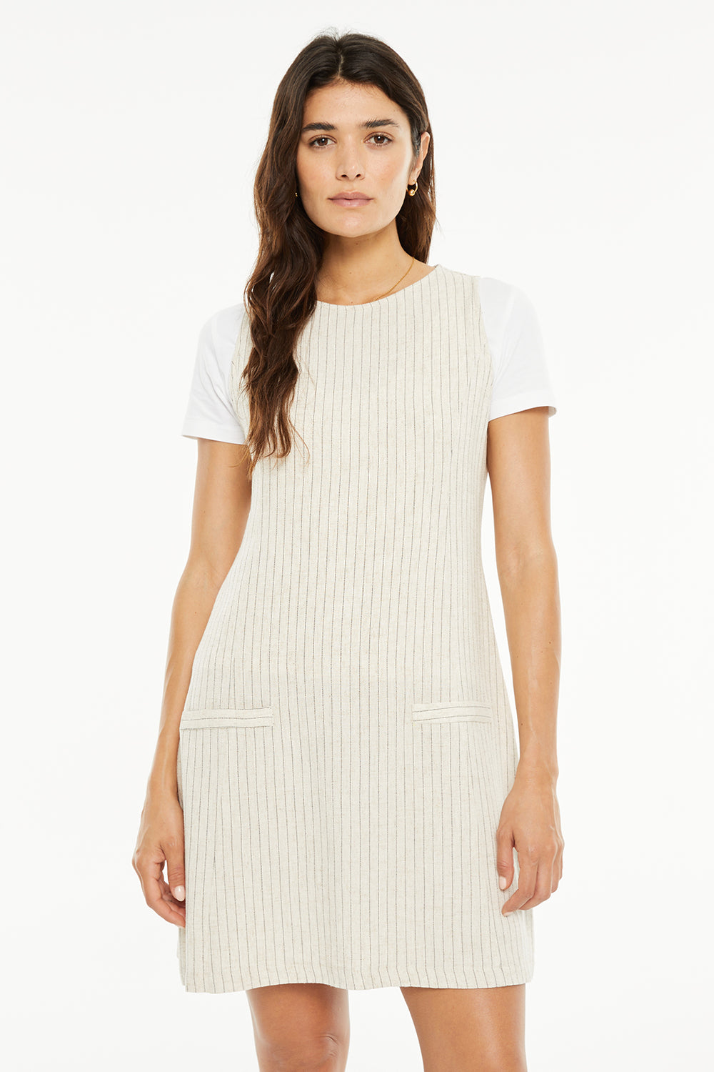 Vestido entallado y corto de mujer con raya diplomática. Prenda sostenible.