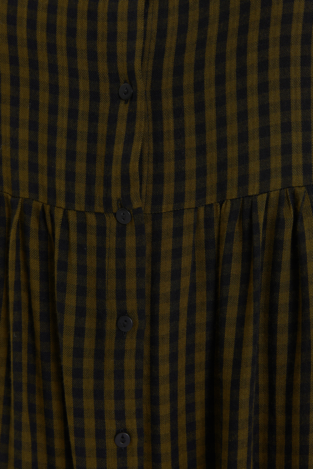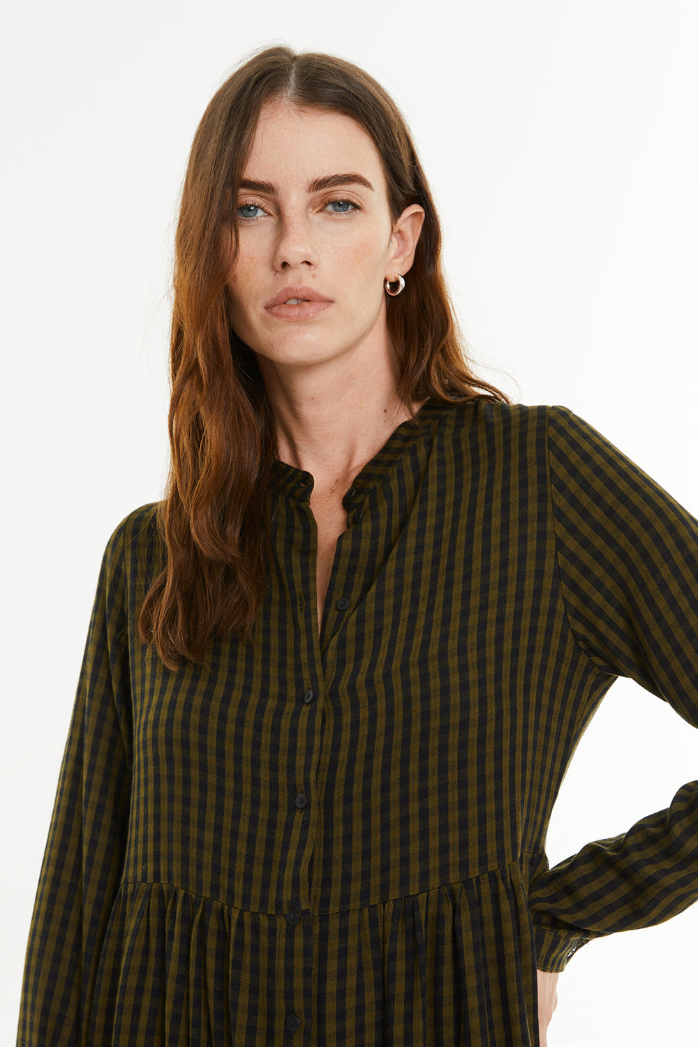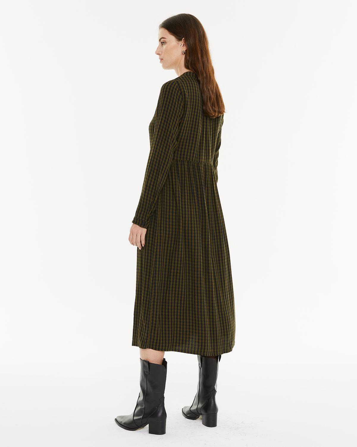 Vestido largo de mujer con tejido de cuadros, escote redondo y abotonado en el delantero. Prenda sostenible.