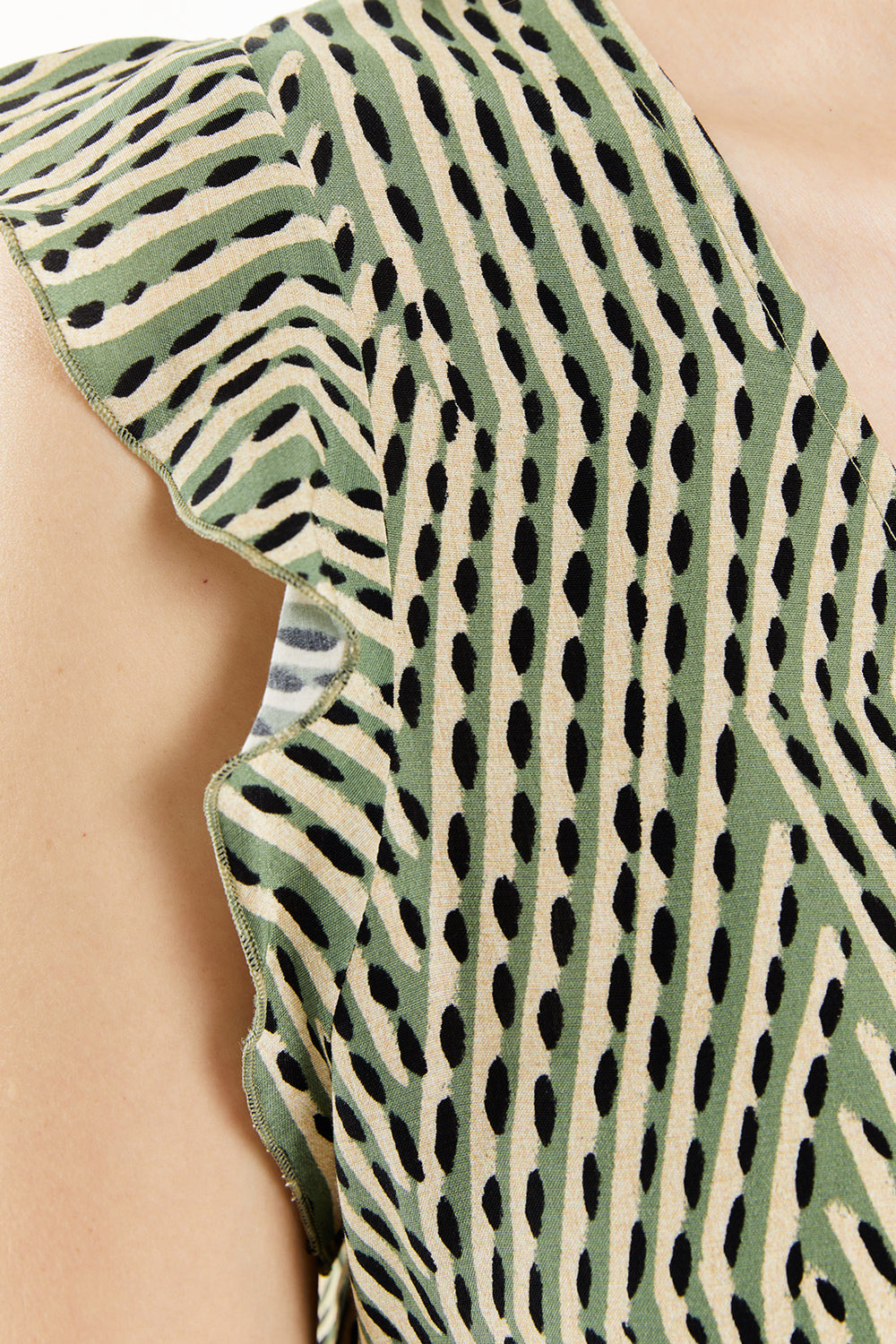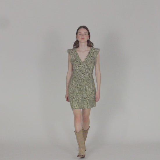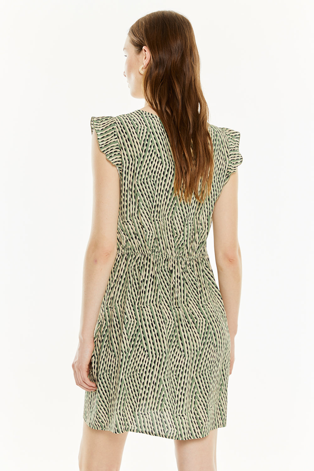 Vestido corto de mujer, estampado, escote en pico, mangas con mini volante y frunce en la parte delantera. Prenda sostenible.