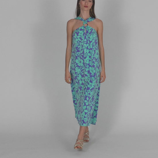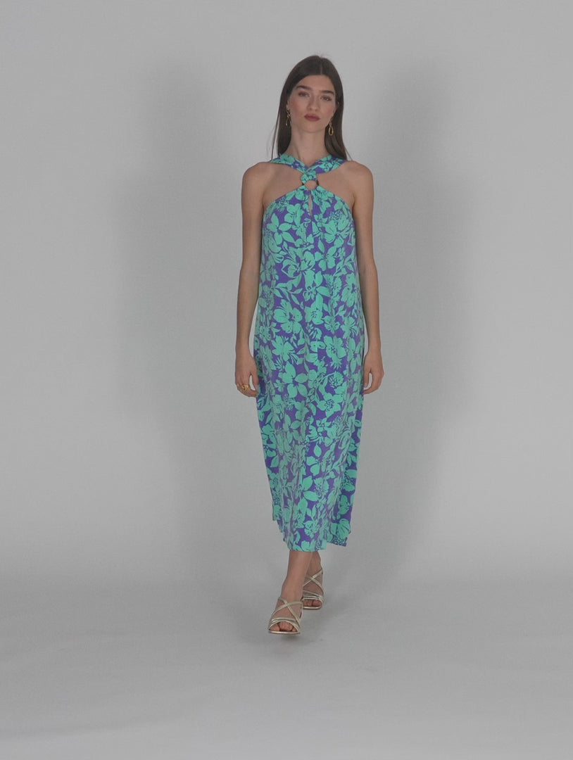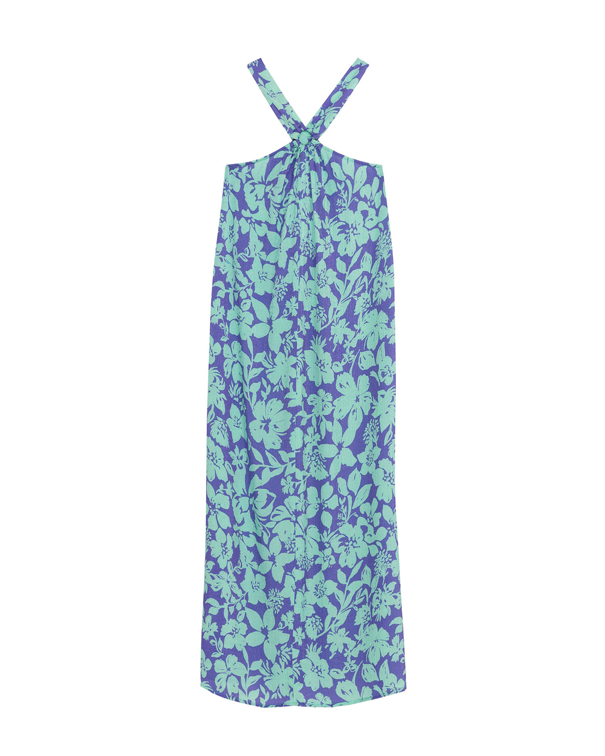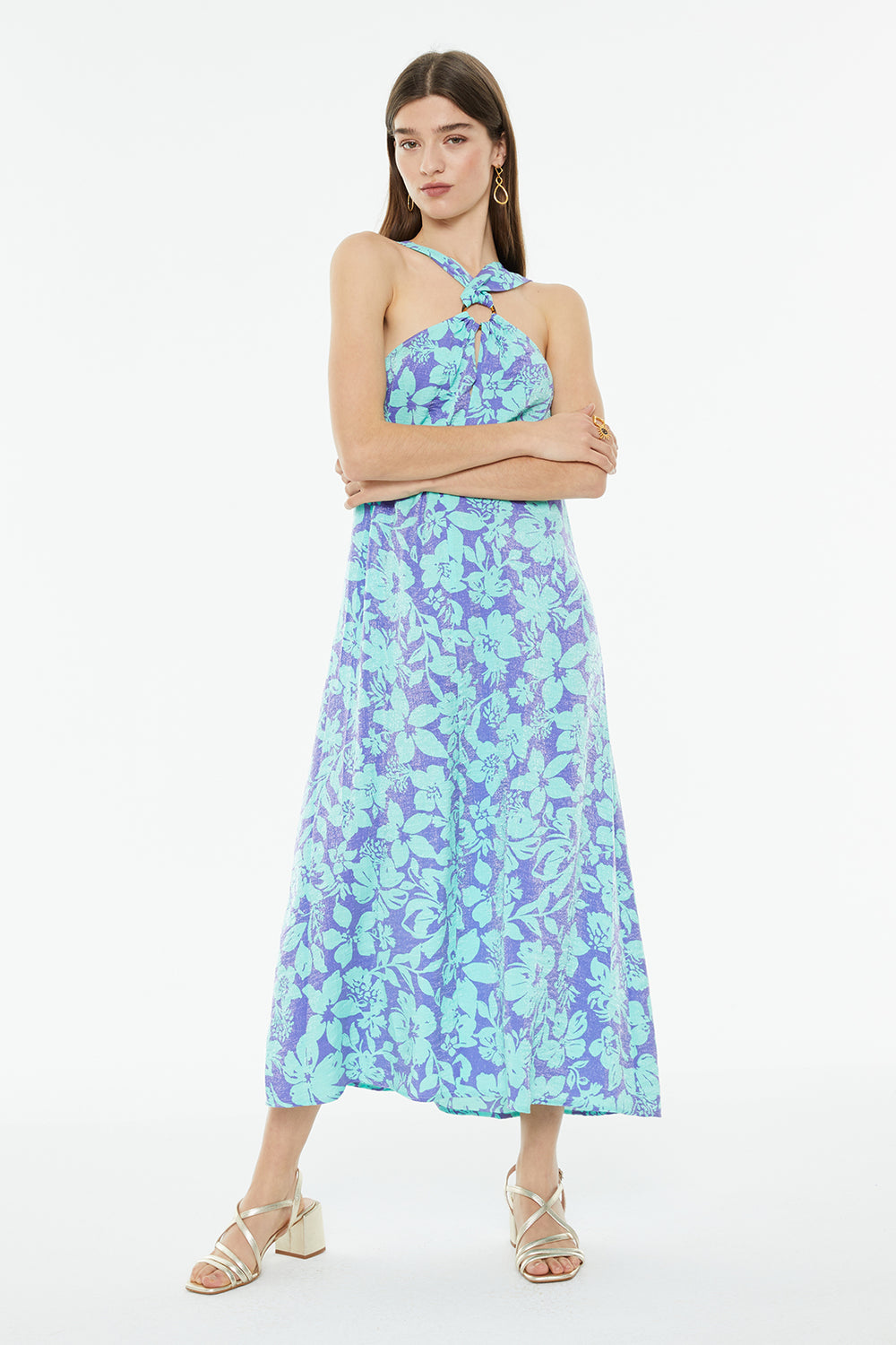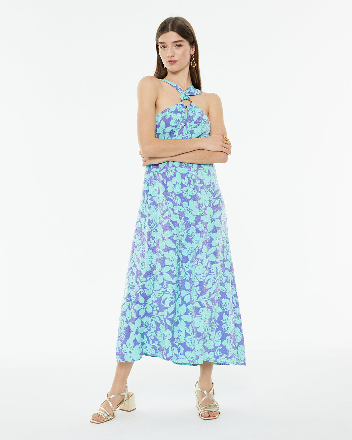 Vestido largo de mujer, con un estampado floral grande, escote halter con nudo. Bajo acabado en línea evasé. Prenda sostenible.