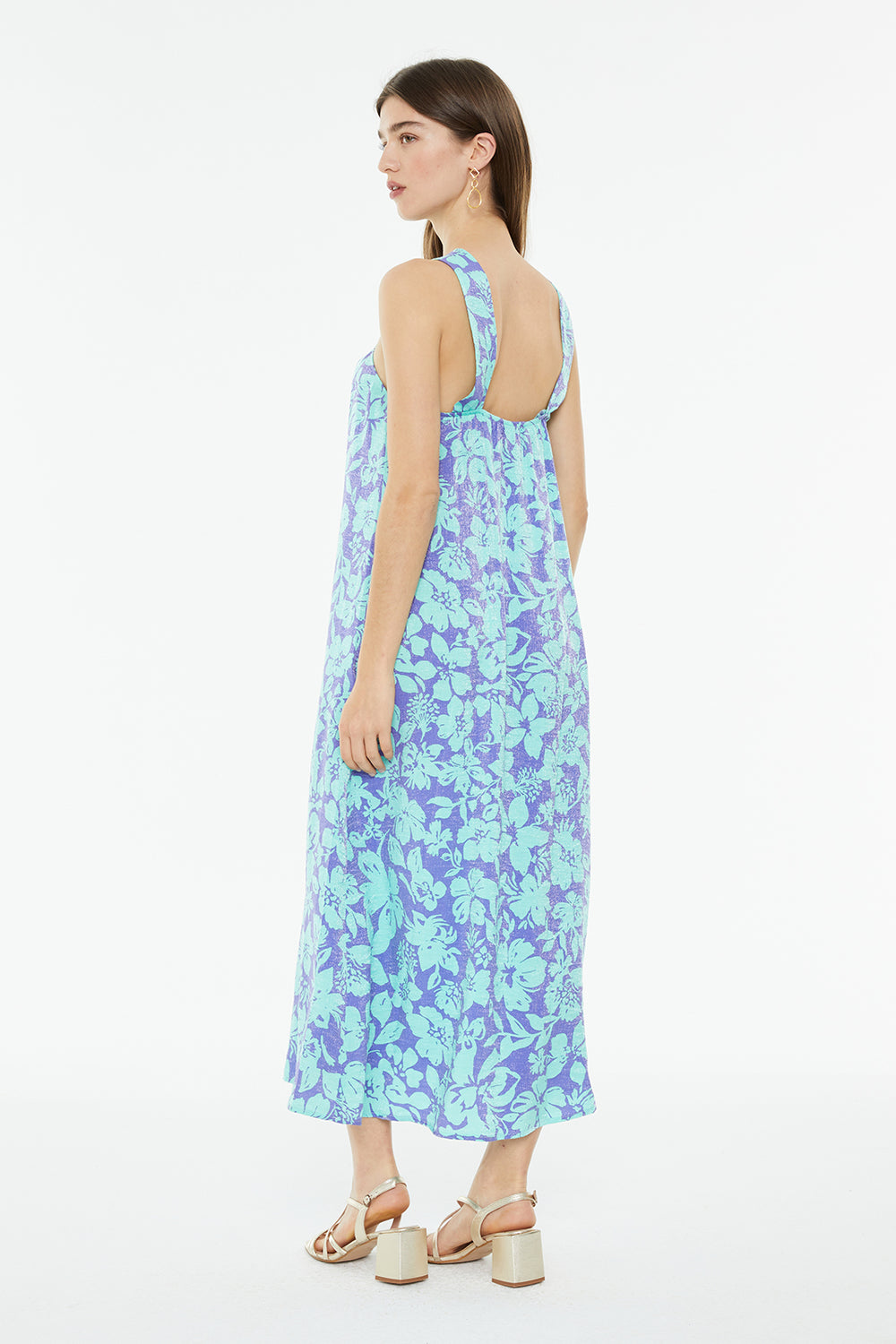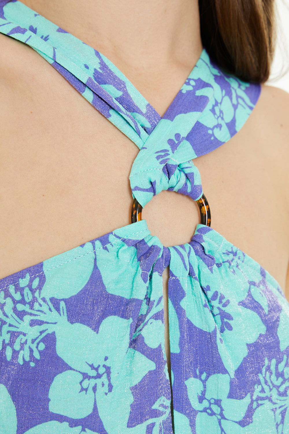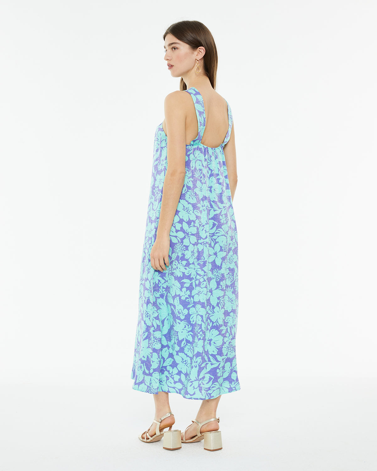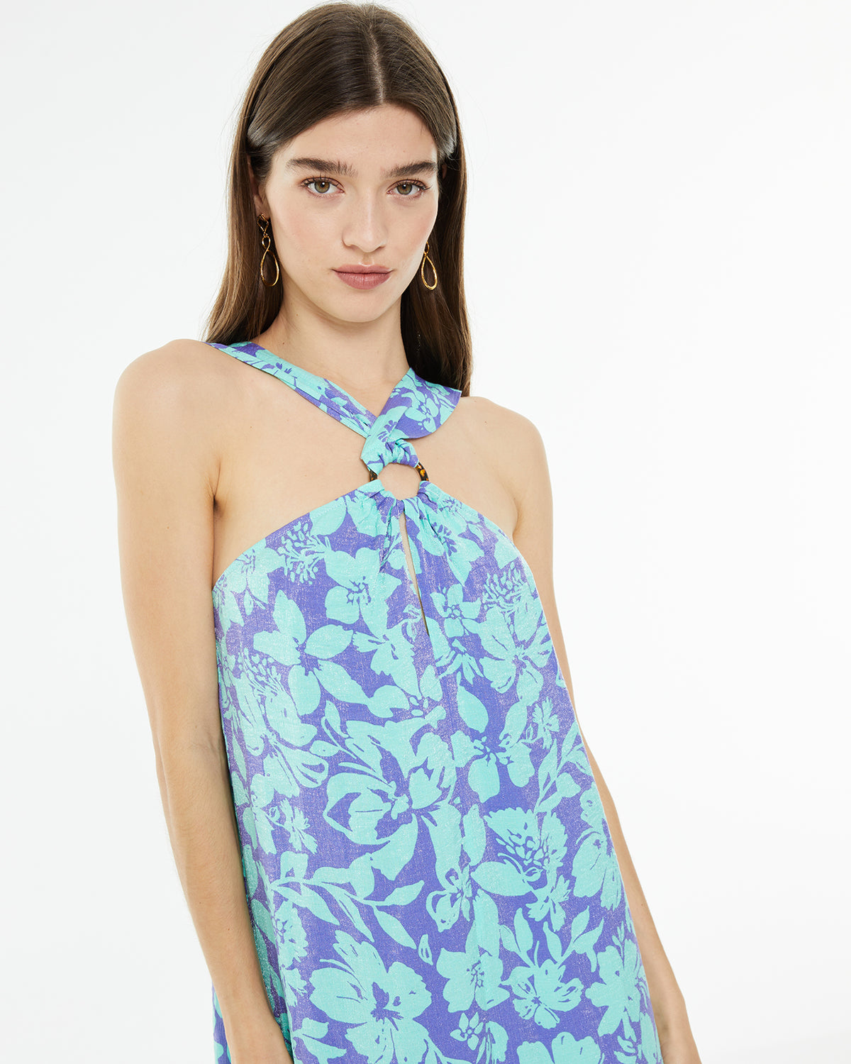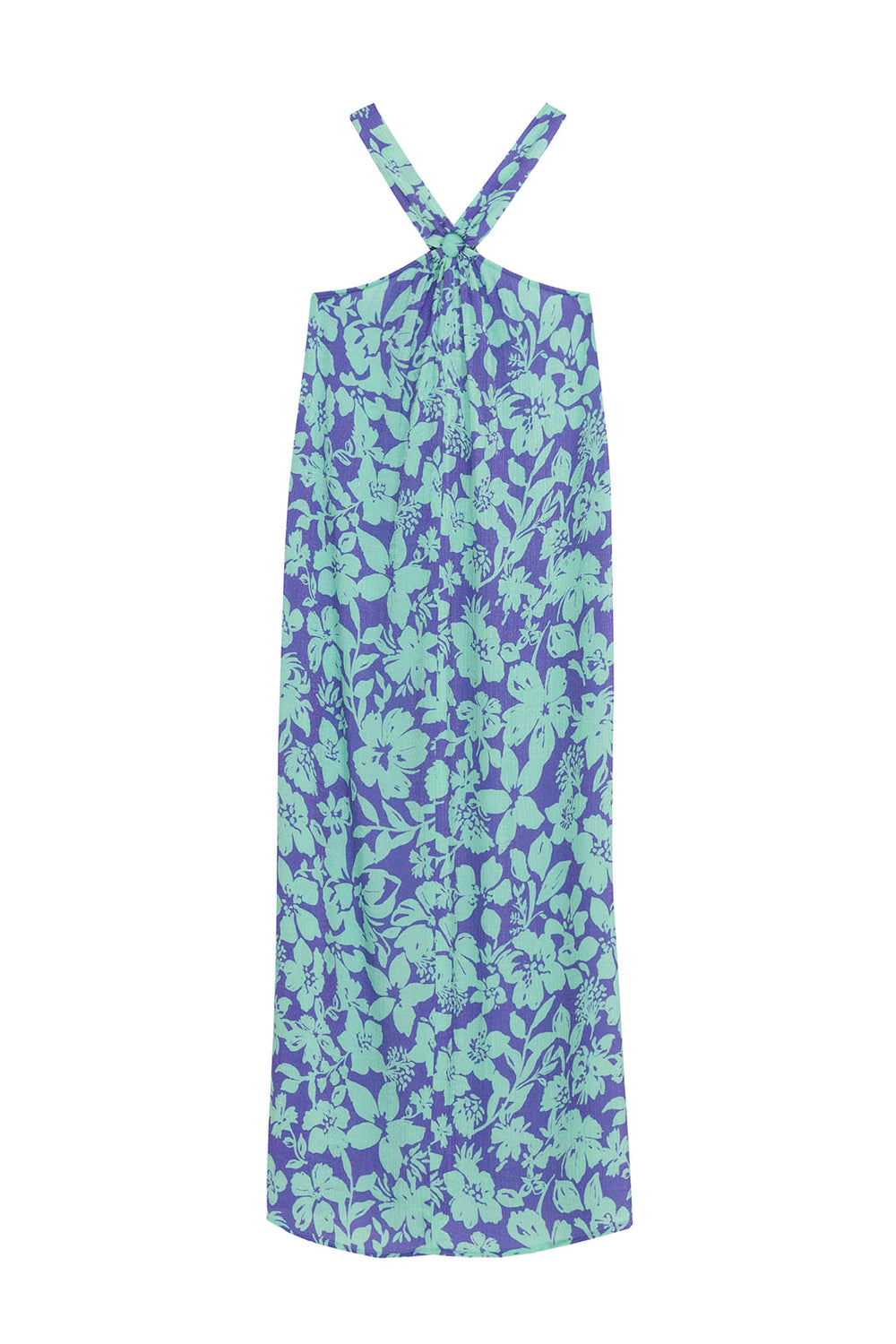 Vestido largo de mujer, con un estampado floral grande, escote halter con nudo. Bajo acabado en línea evasé. Prenda sostenible.