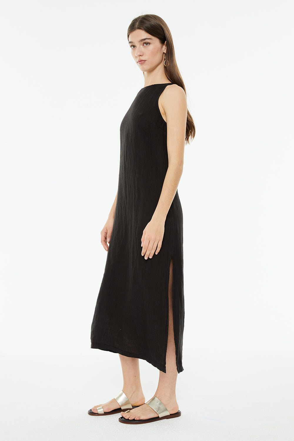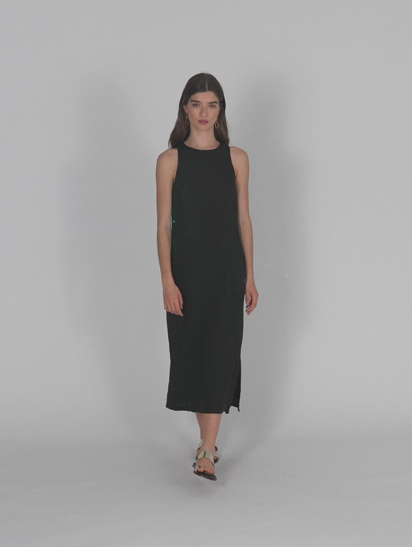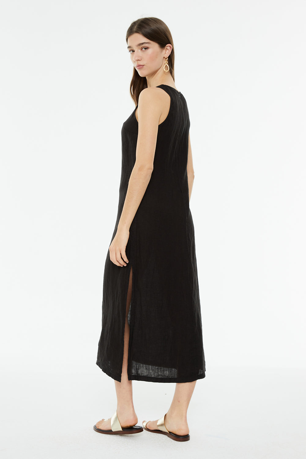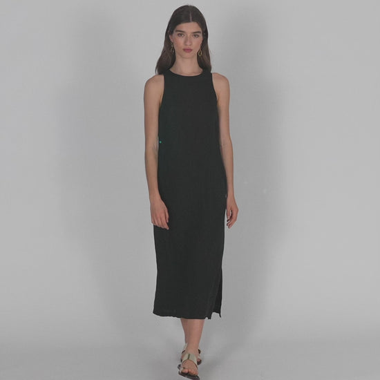 Vestido de mujer de lino, sin mangas y cuello redondo. Detalle de abertura en costura lateral. Prenda sostenible.