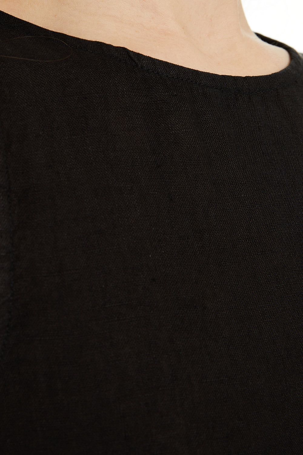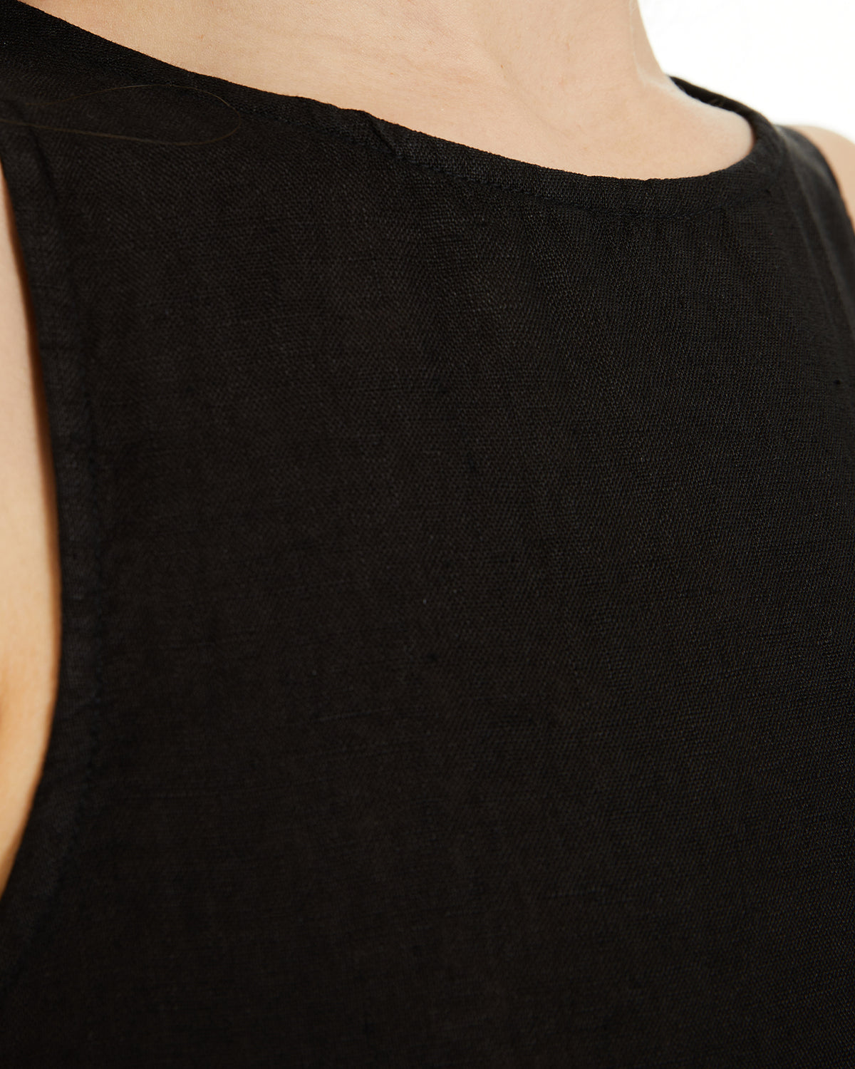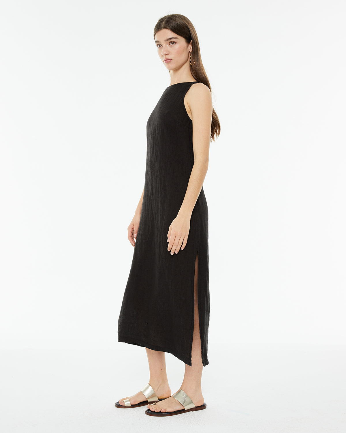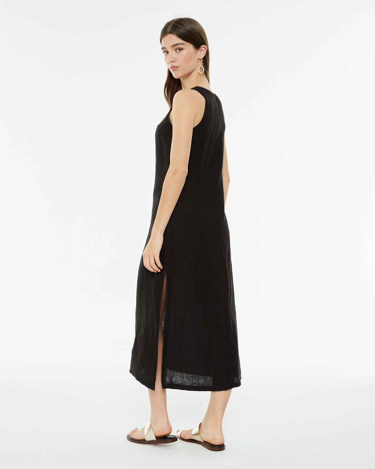Vestido de mujer de lino, sin mangas y cuello redondo. Detalle de abertura en costura lateral. Prenda sostenible.