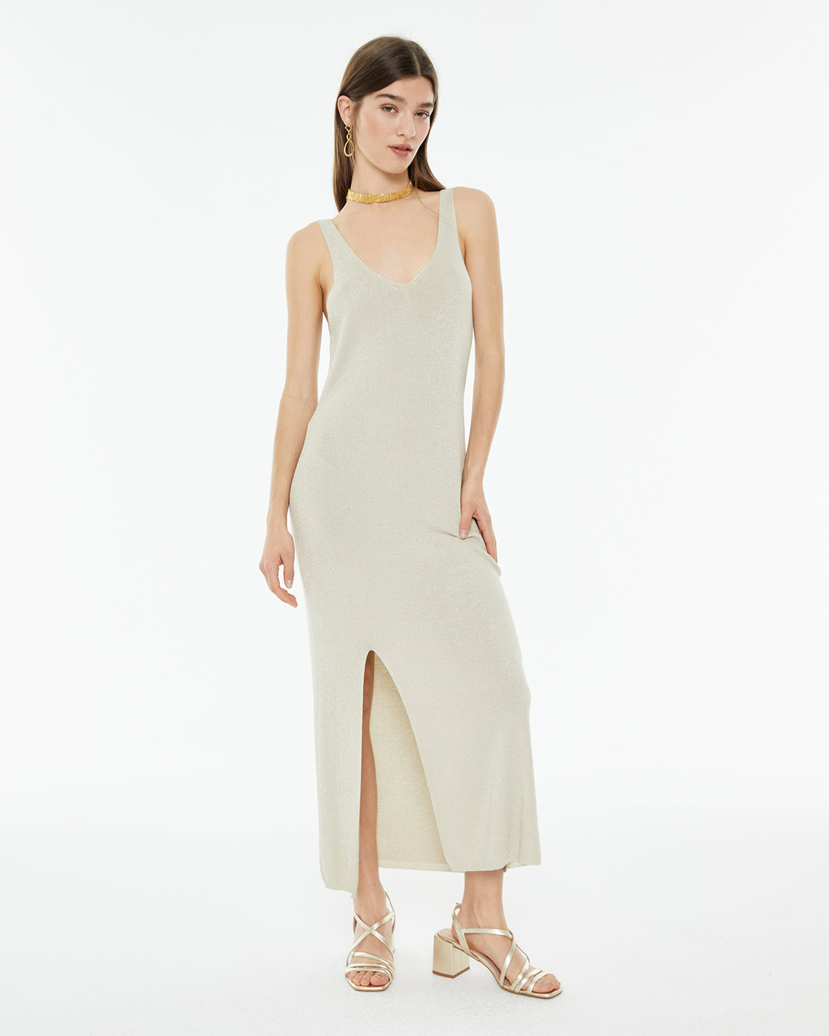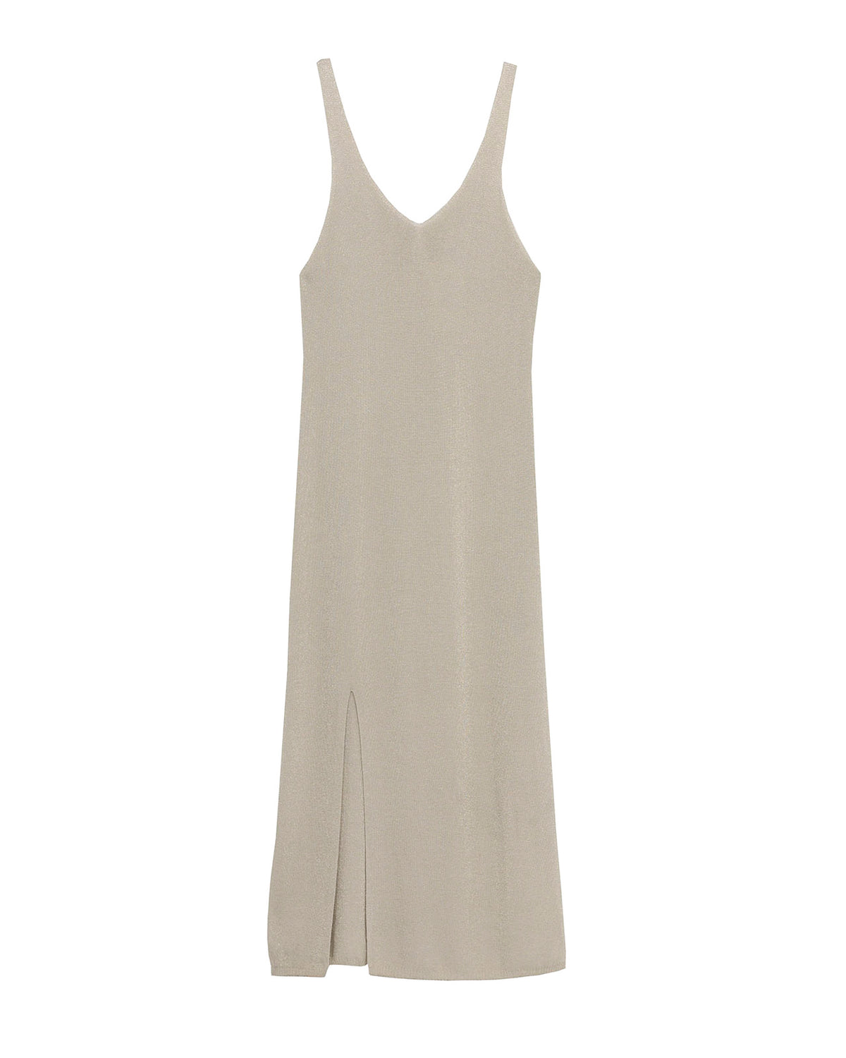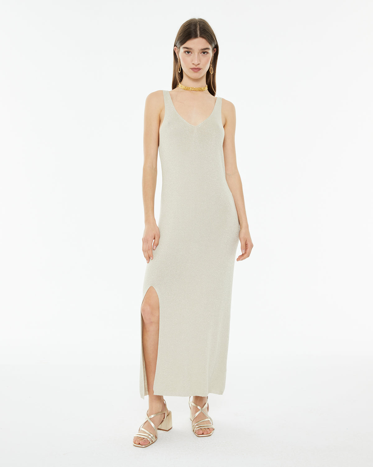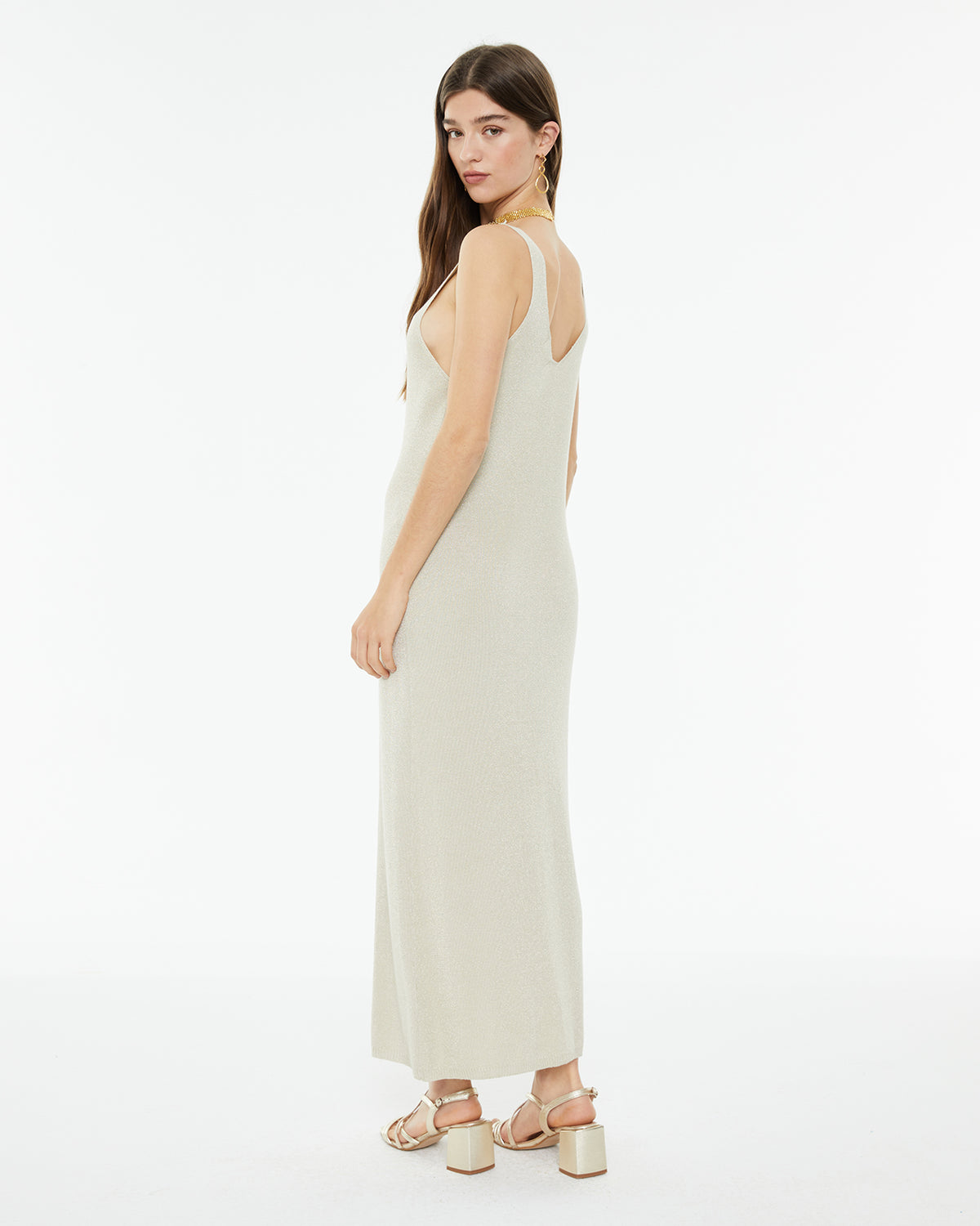 Vestido largo de mujer de punto con lúrex, ajustado a la cintura con un escote pico y tirantes. Detalle de abertura lateral.