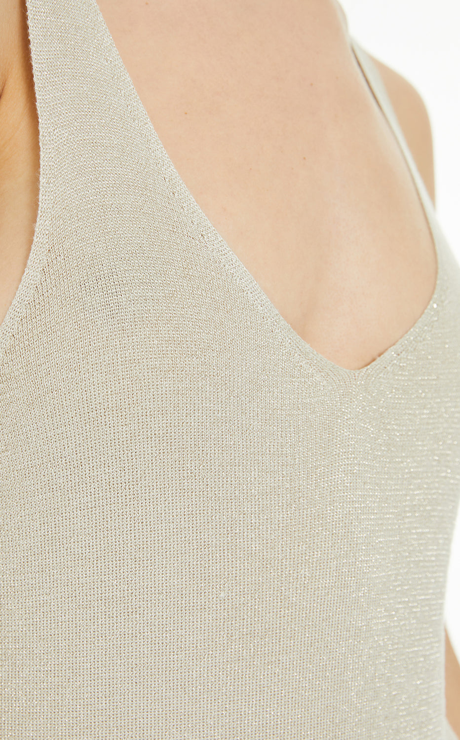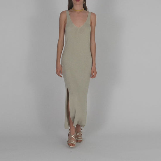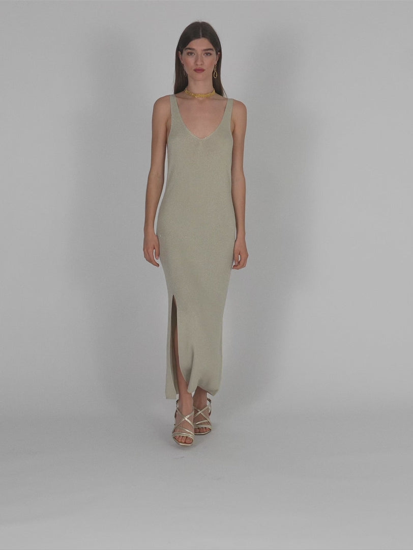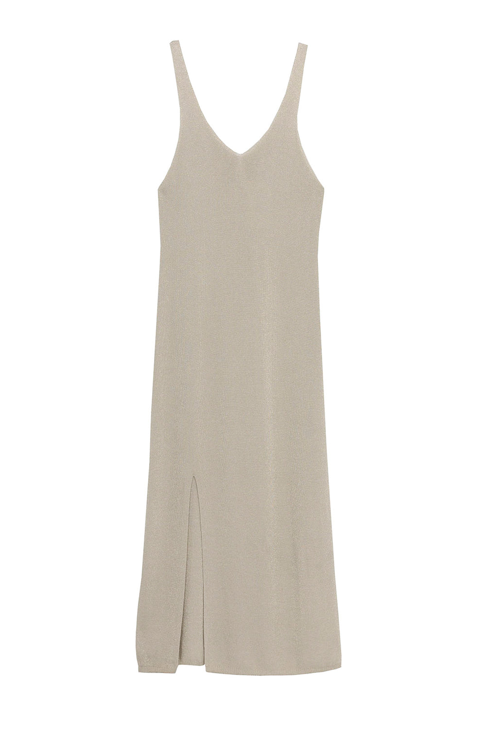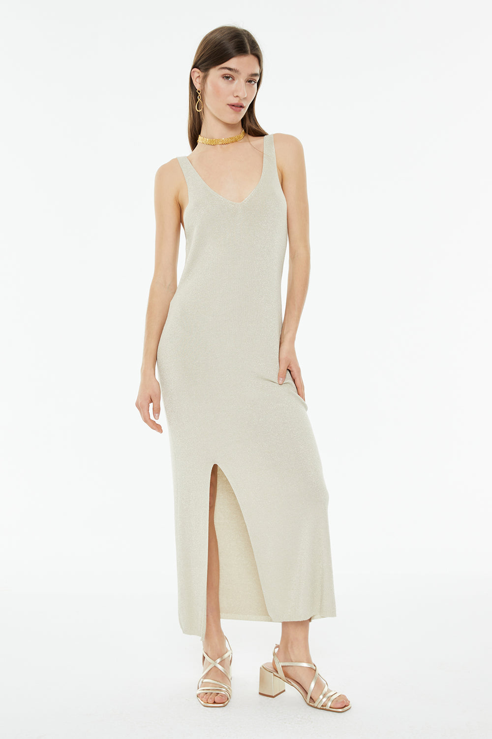 Vestido largo de mujer de punto con lúrex, ajustado a la cintura con un escote pico y tirantes. Detalle de abertura lateral.