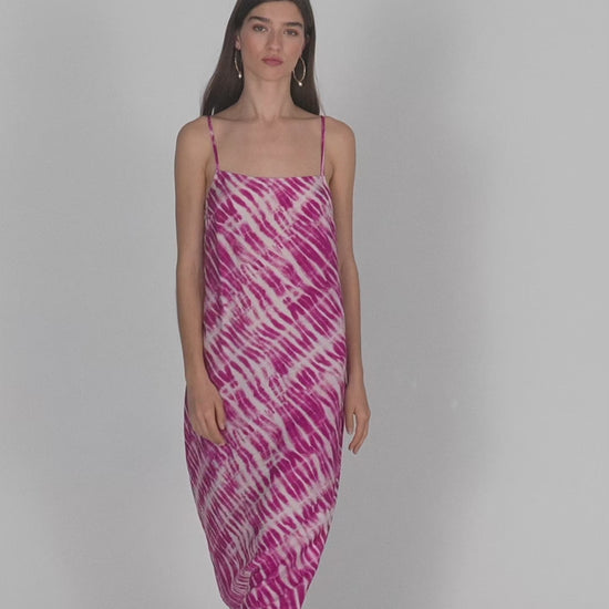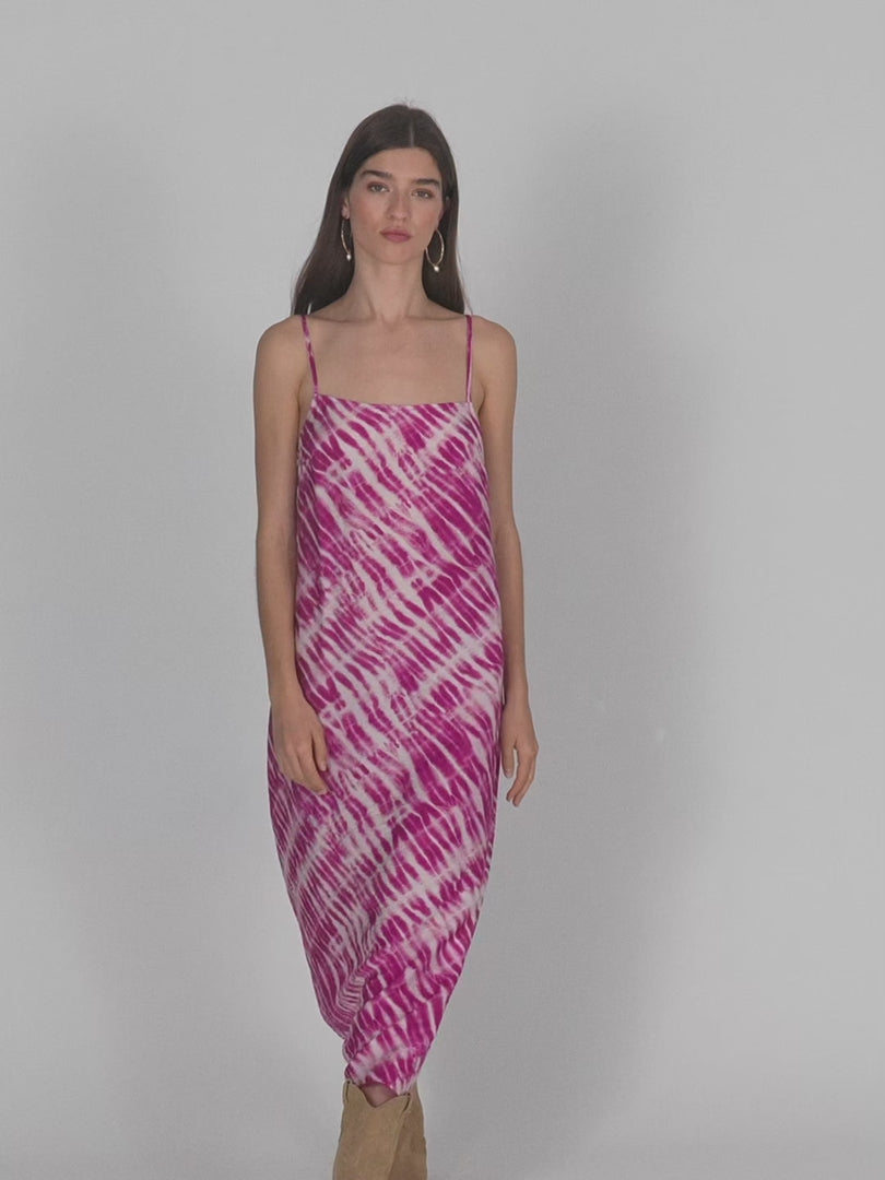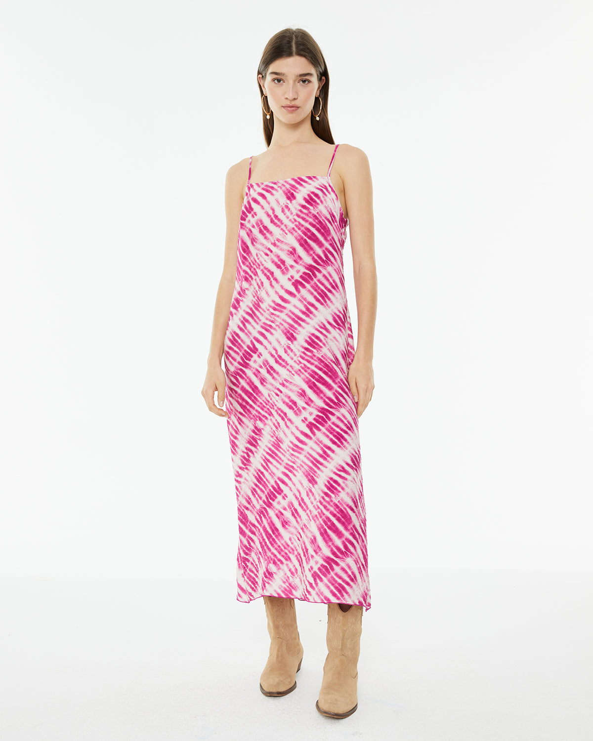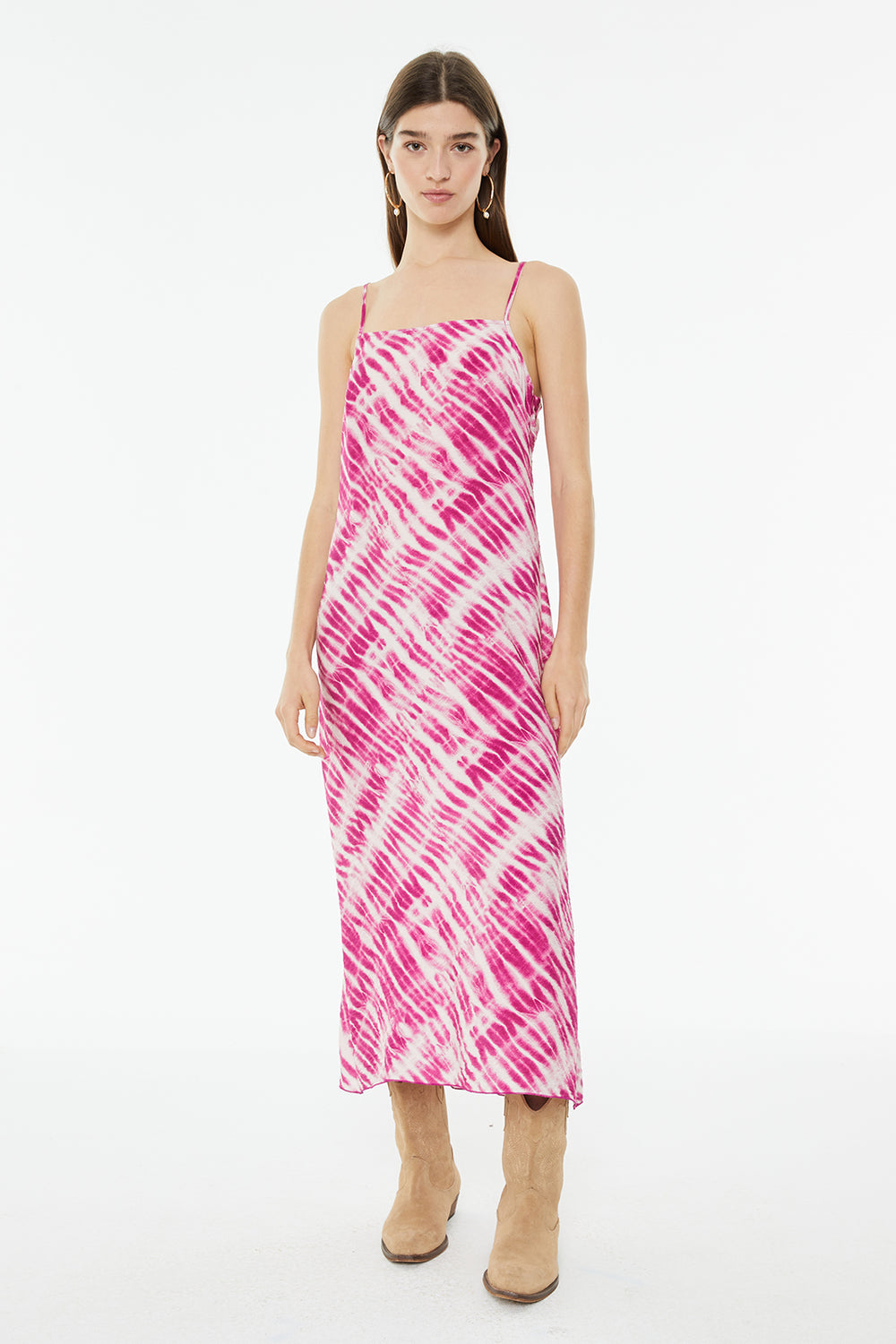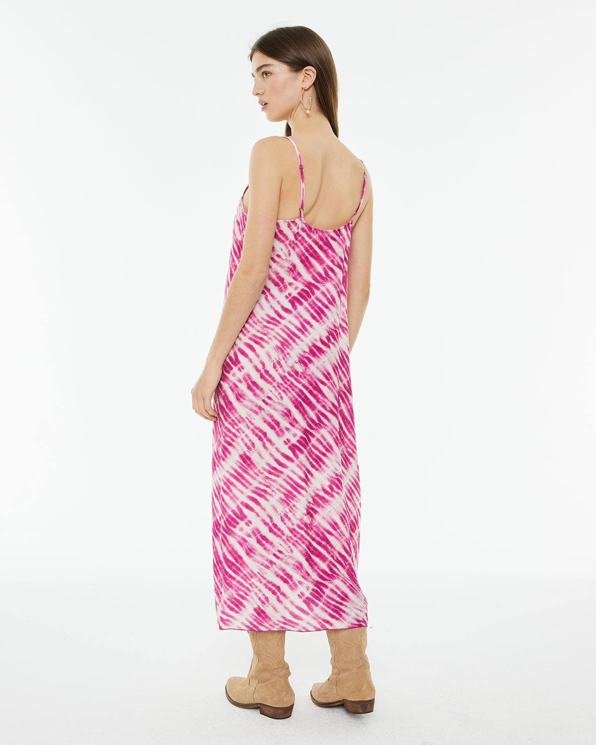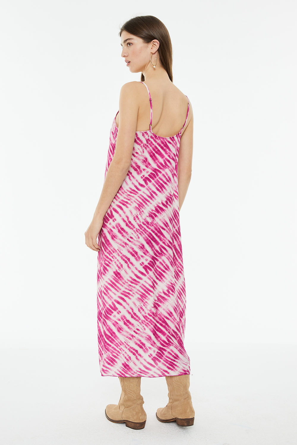 Vestido largo de mujer con un estampado tie dye, de tirantes y escote. Prenda sostenible.