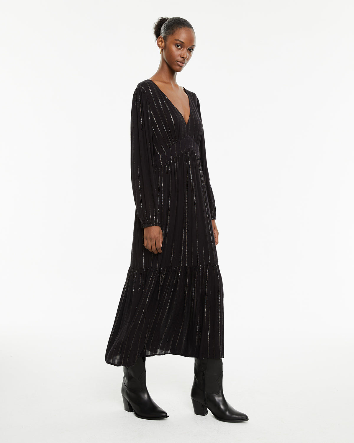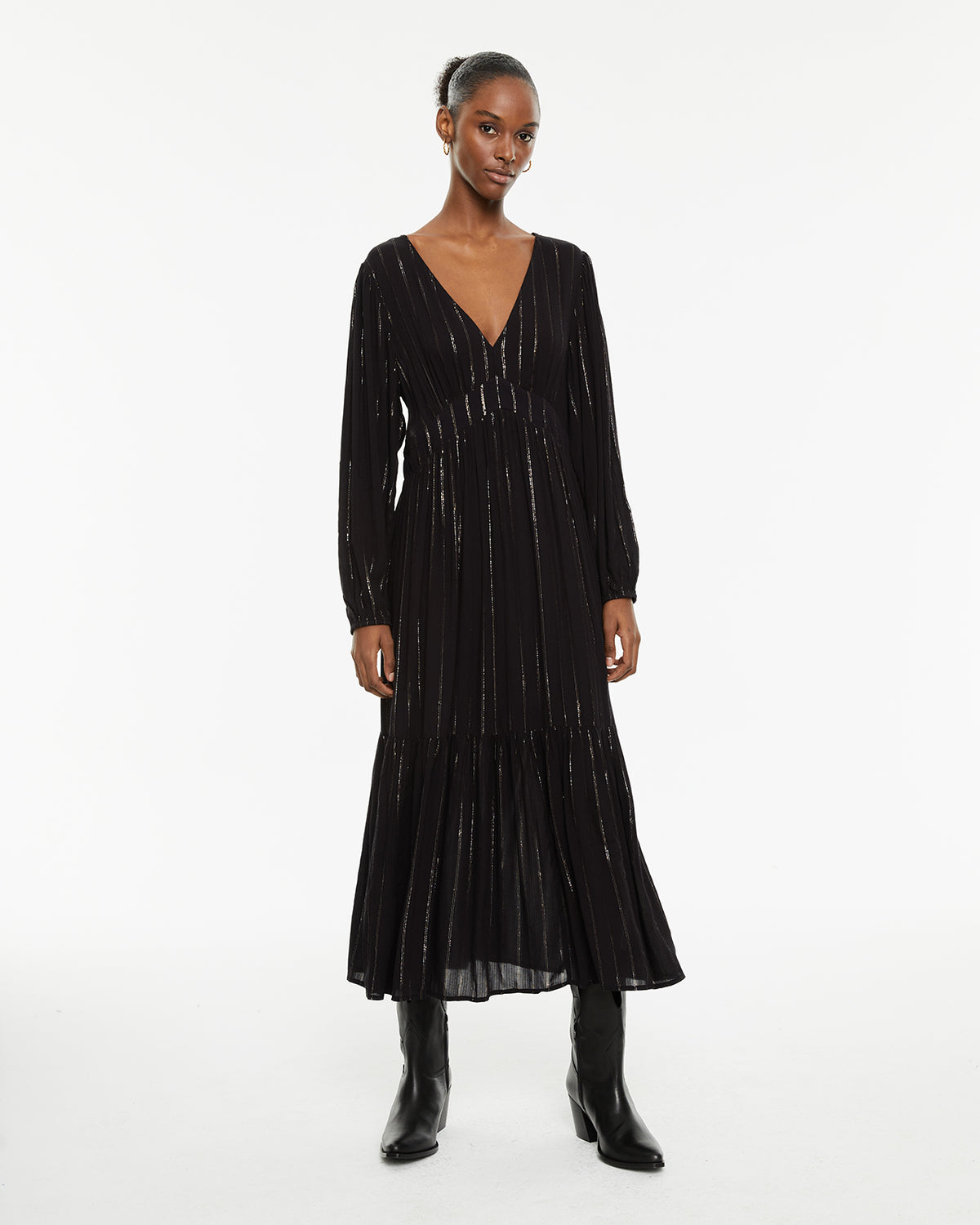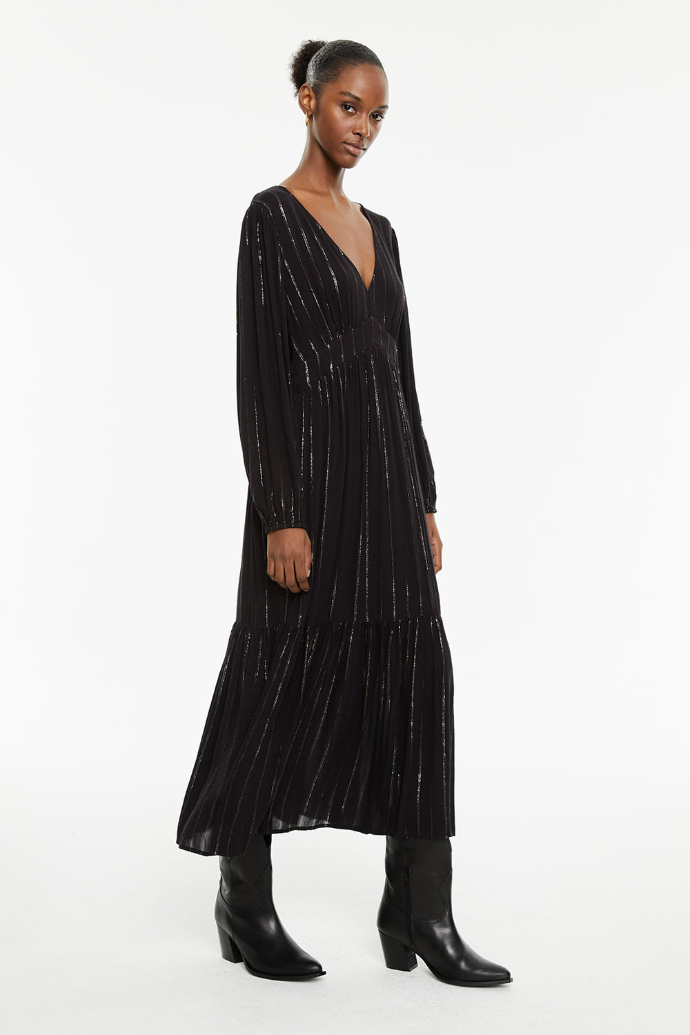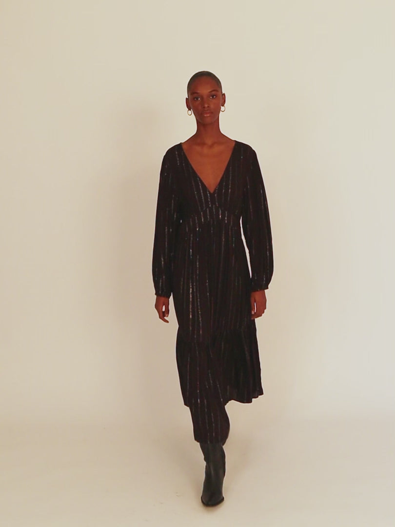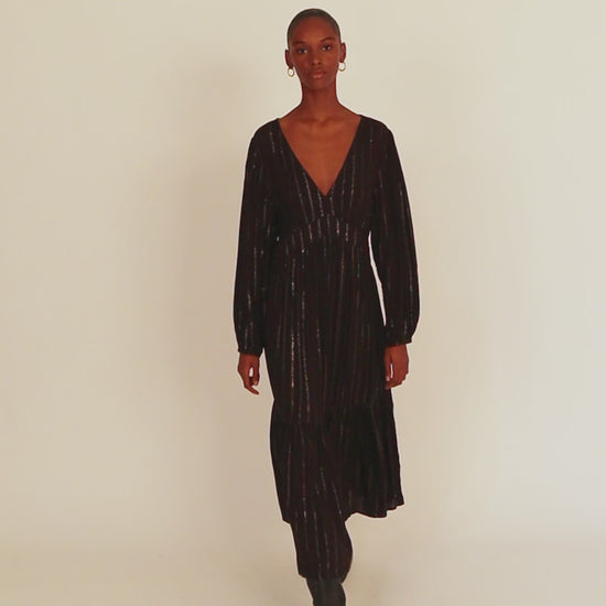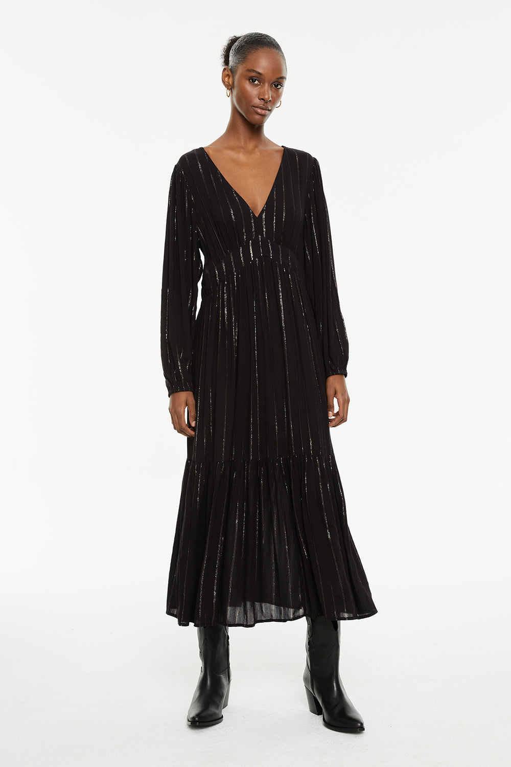 Vestido largo con detalles de lúrex de manga larga y cuello pico
