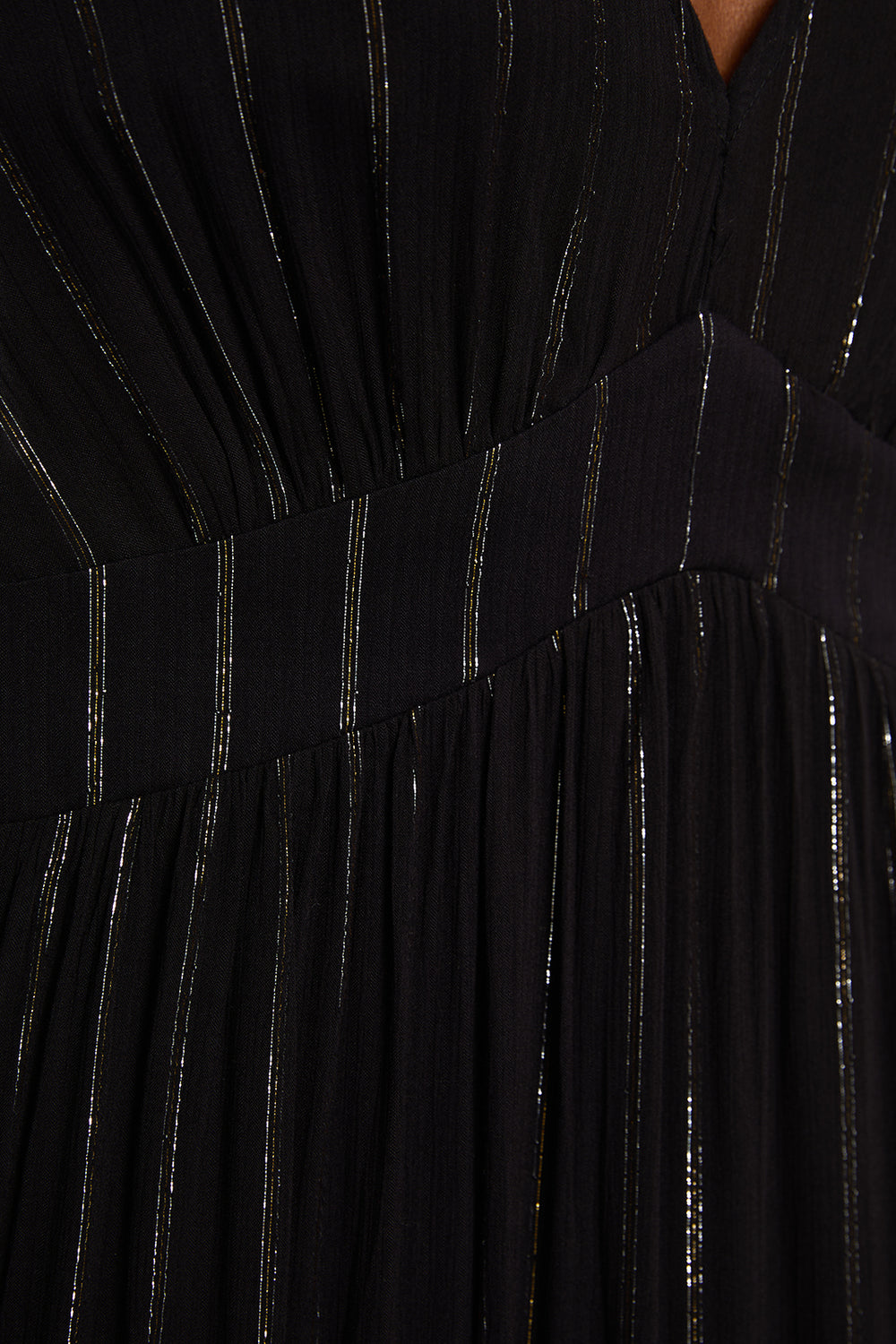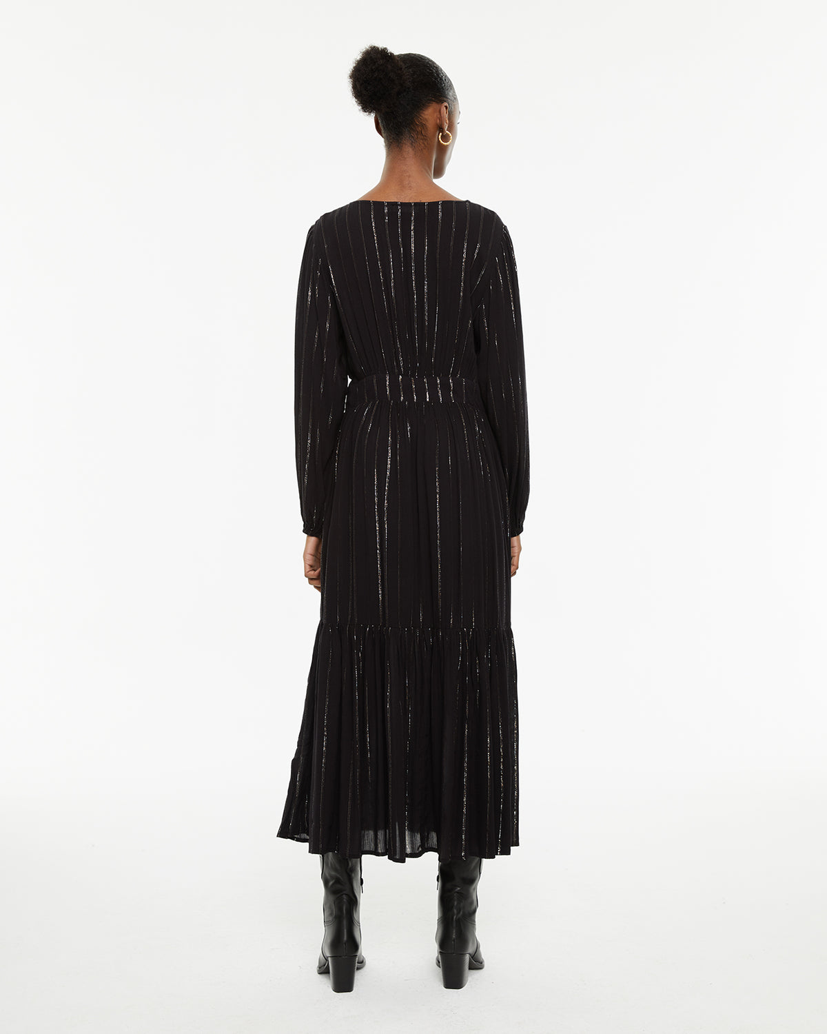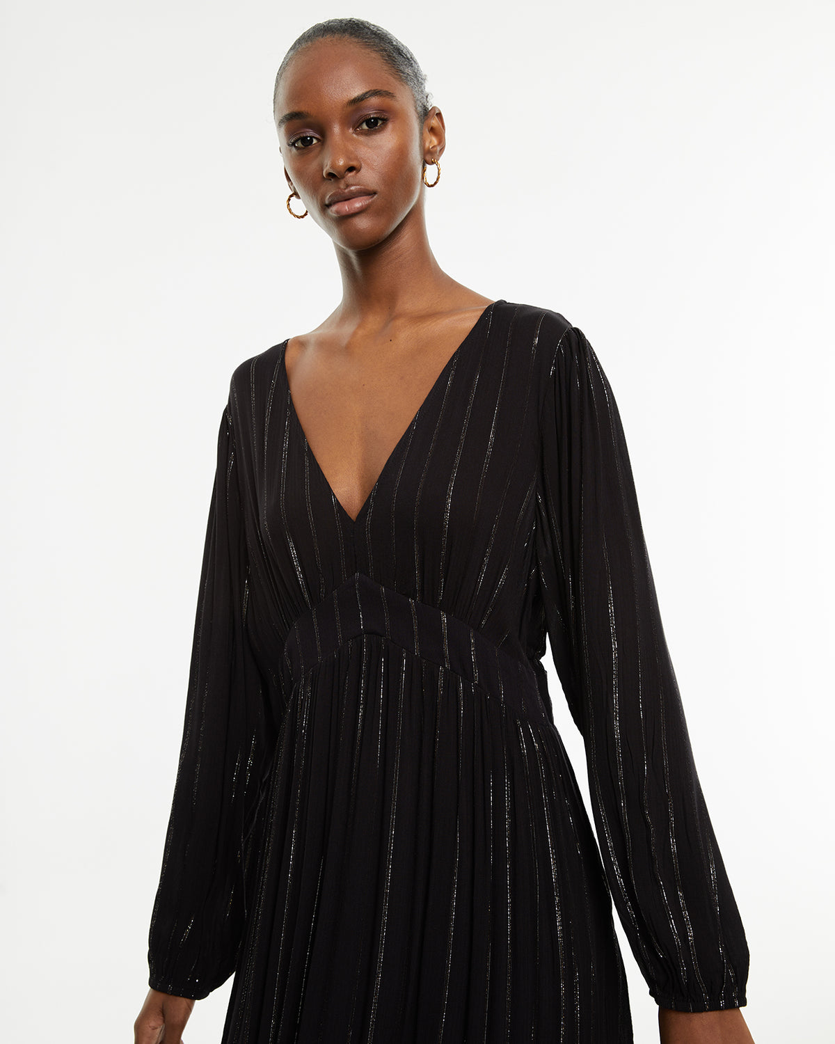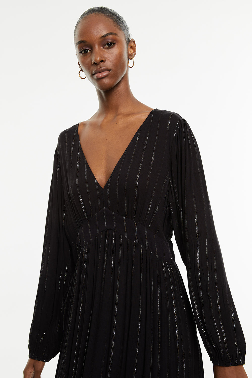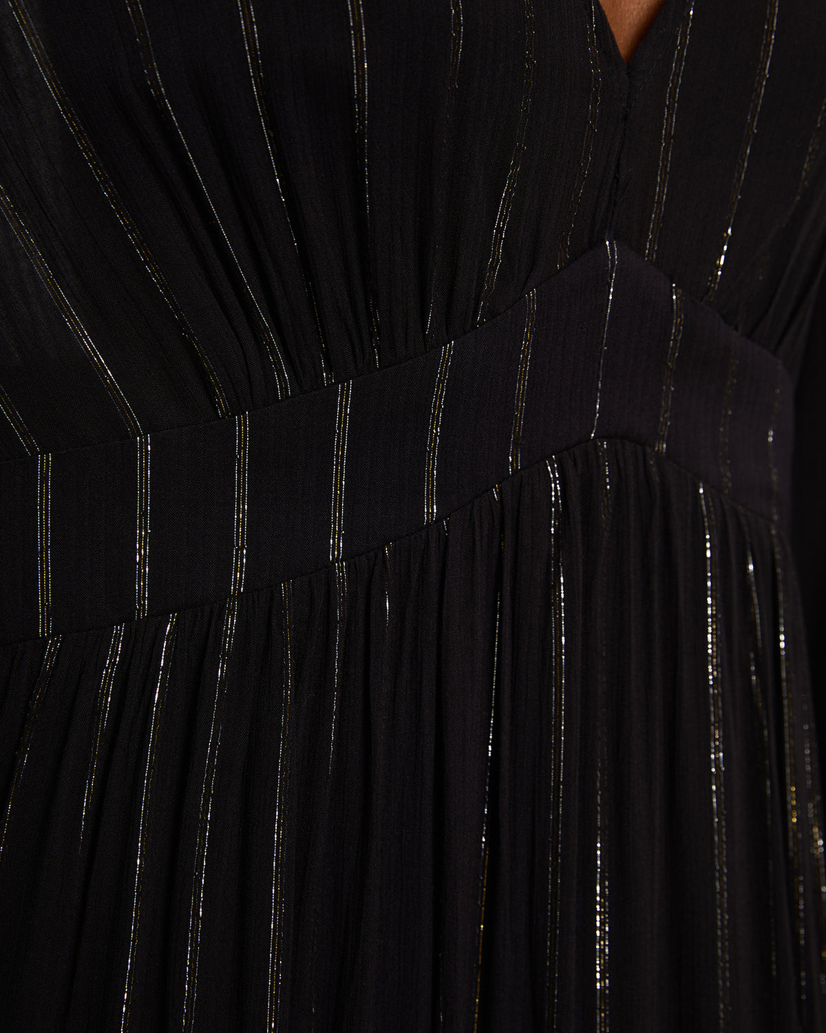 Vestido largo con detalles de lúrex de manga larga y cuello pico