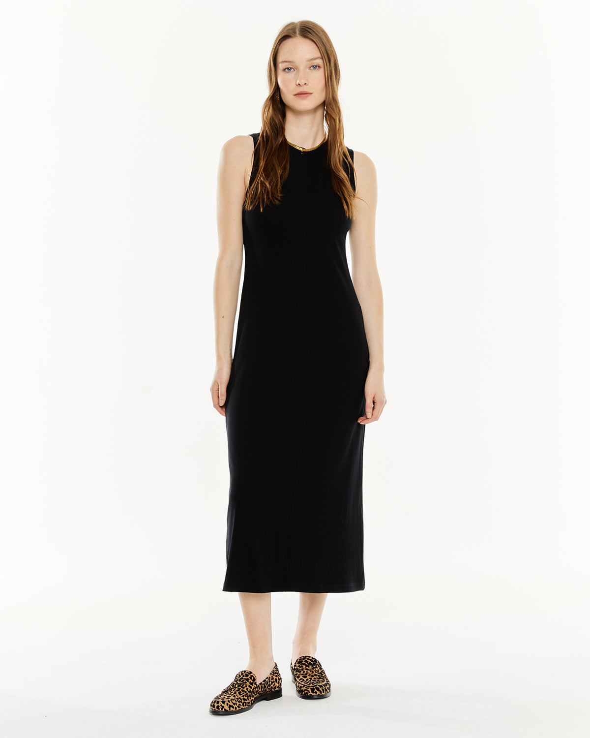 Vestido largo de mujer, sin mangas y escote redondo. Prenda sostenible.