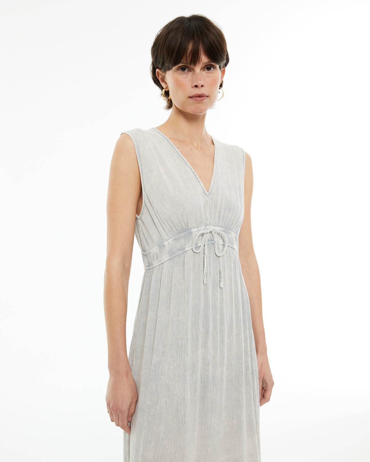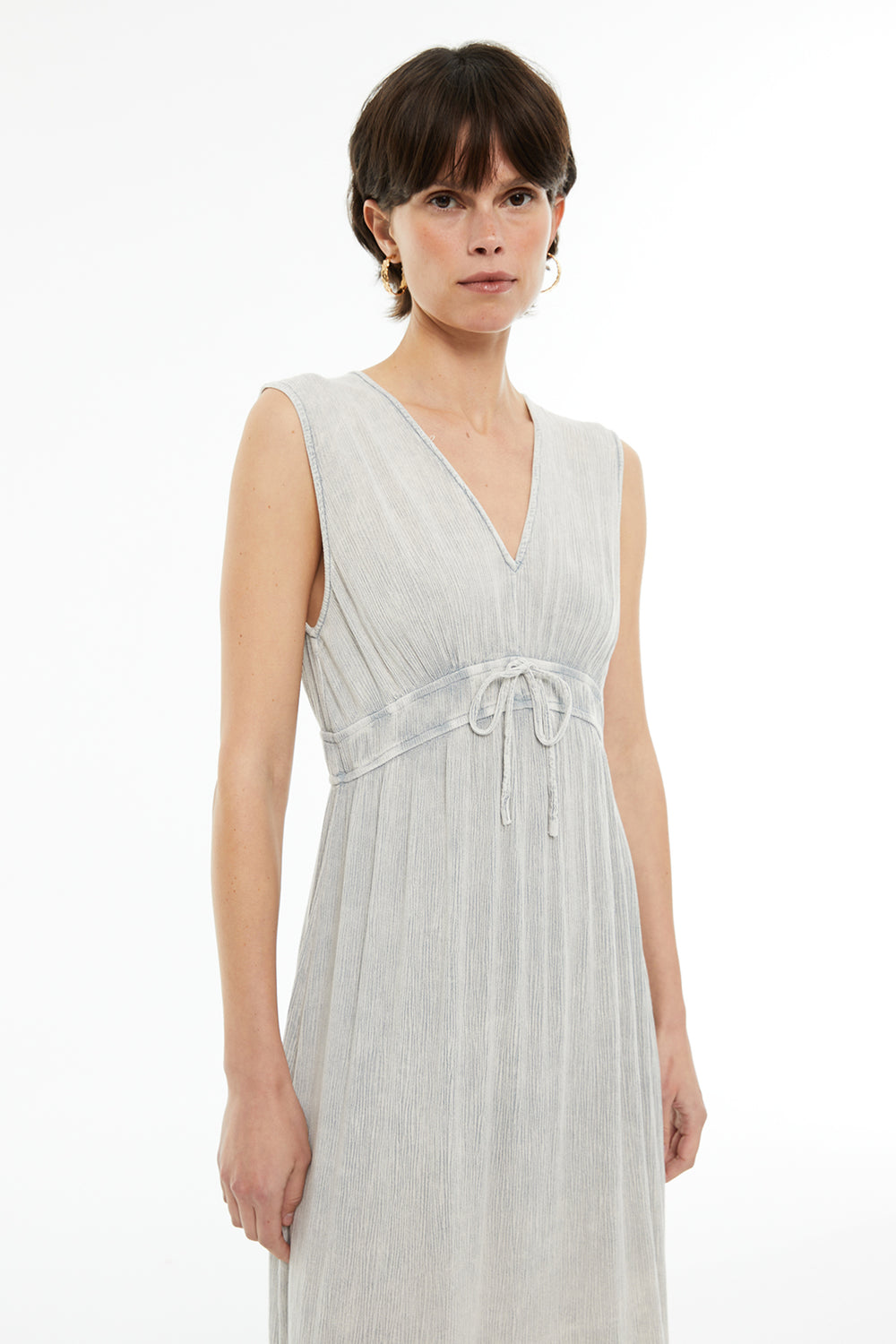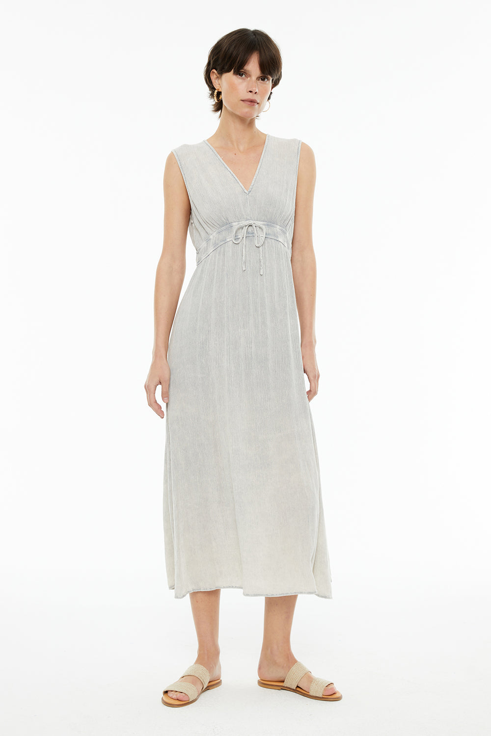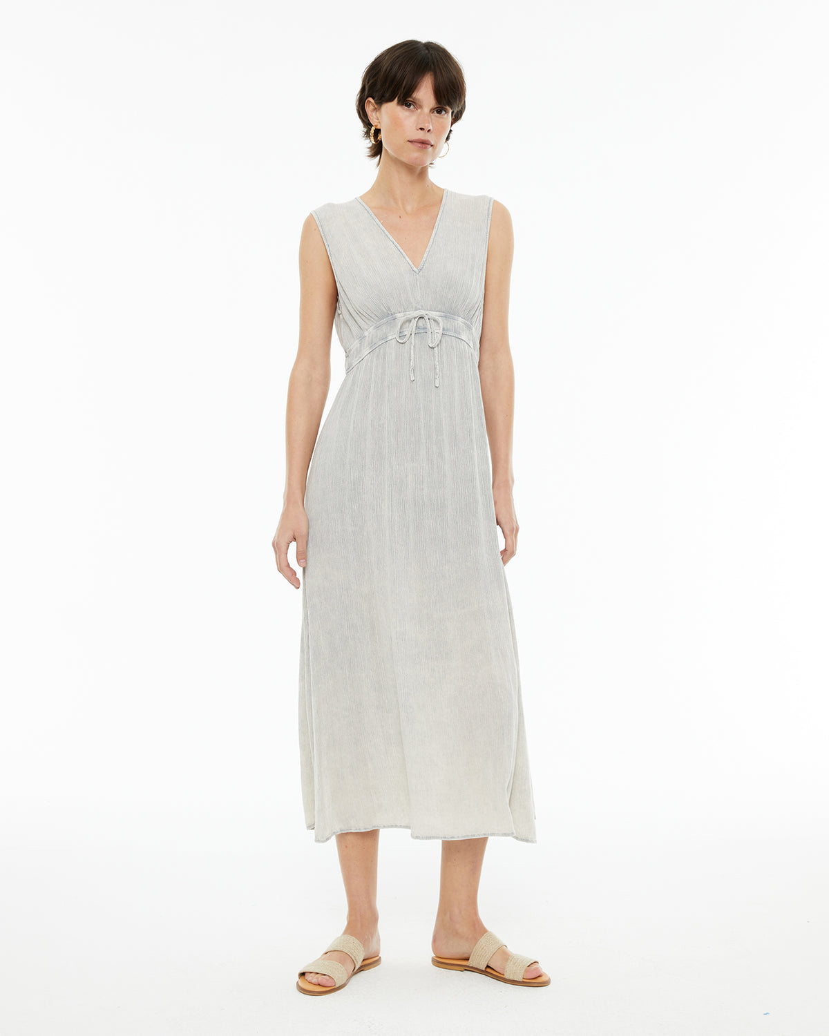 Vestido de mujer midi de bambula, con el cuello pico, sin mangas, con corte en cintura con goma. Bajo acabado en línea evasé. Prenda sostenible.