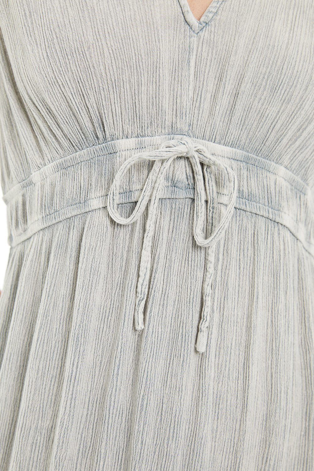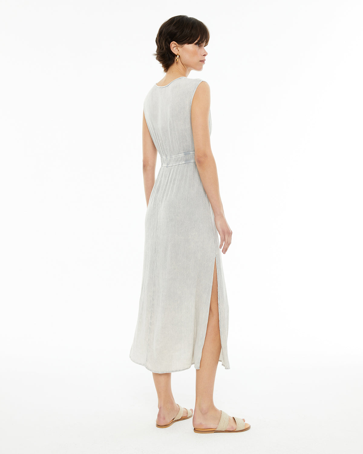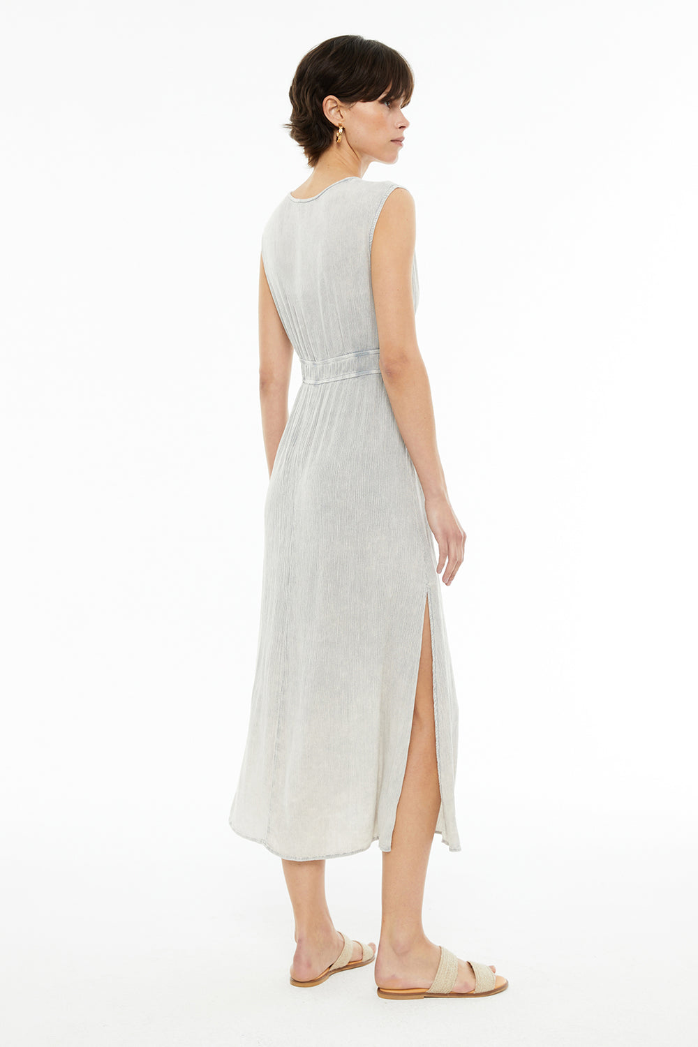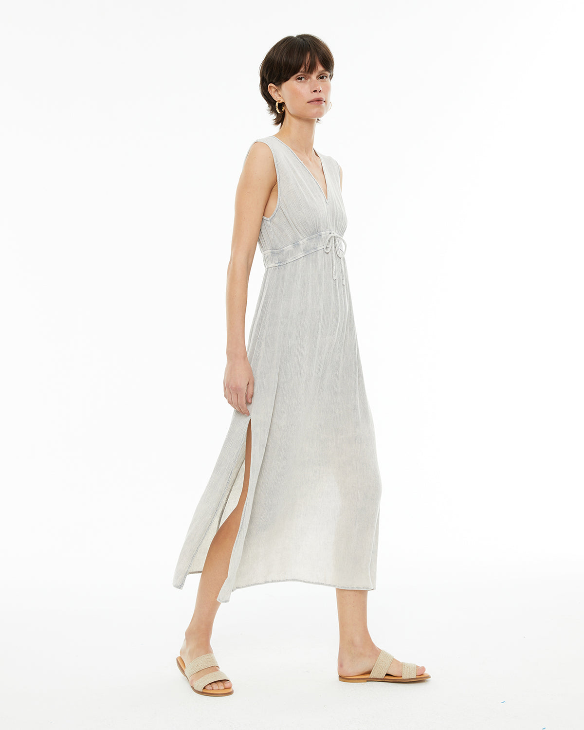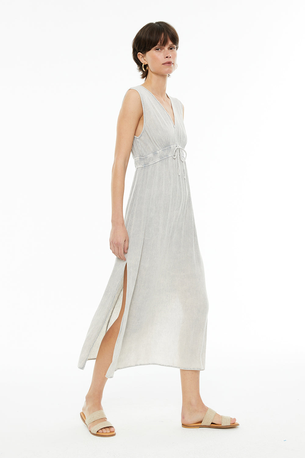 Vestido de mujer midi de bambula, con el cuello pico, sin mangas, con corte en cintura con goma. Bajo acabado en línea evasé. Prenda sostenible.