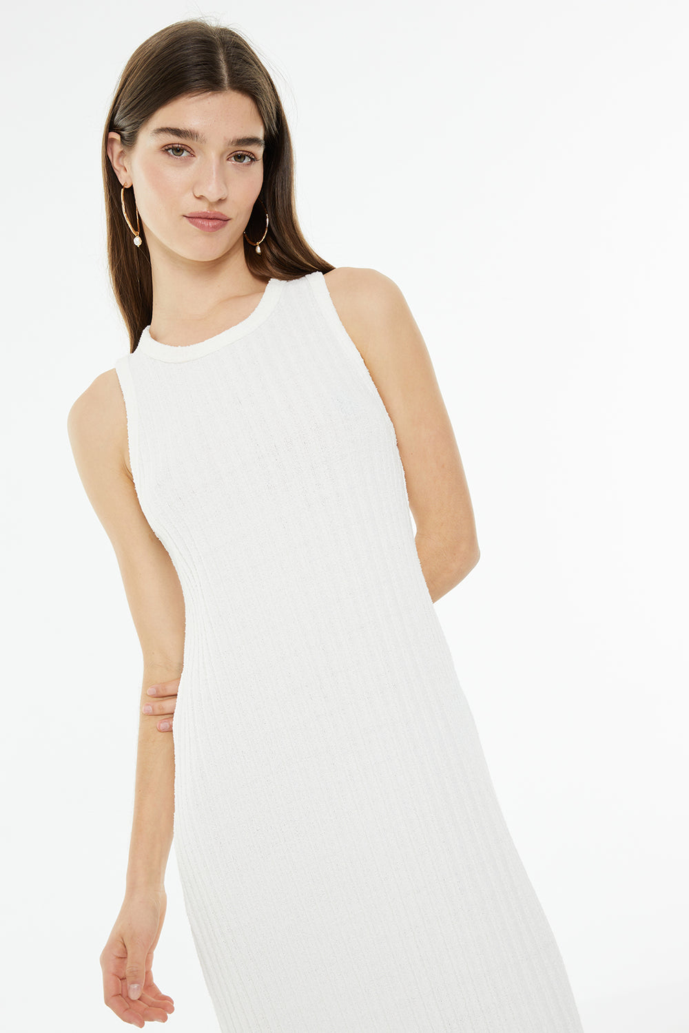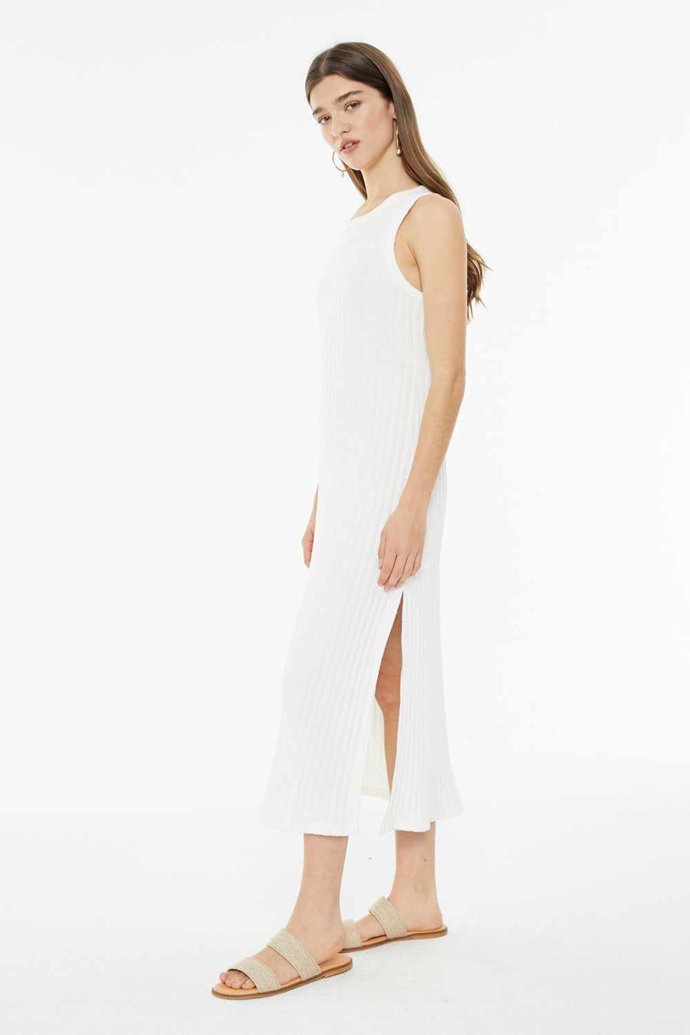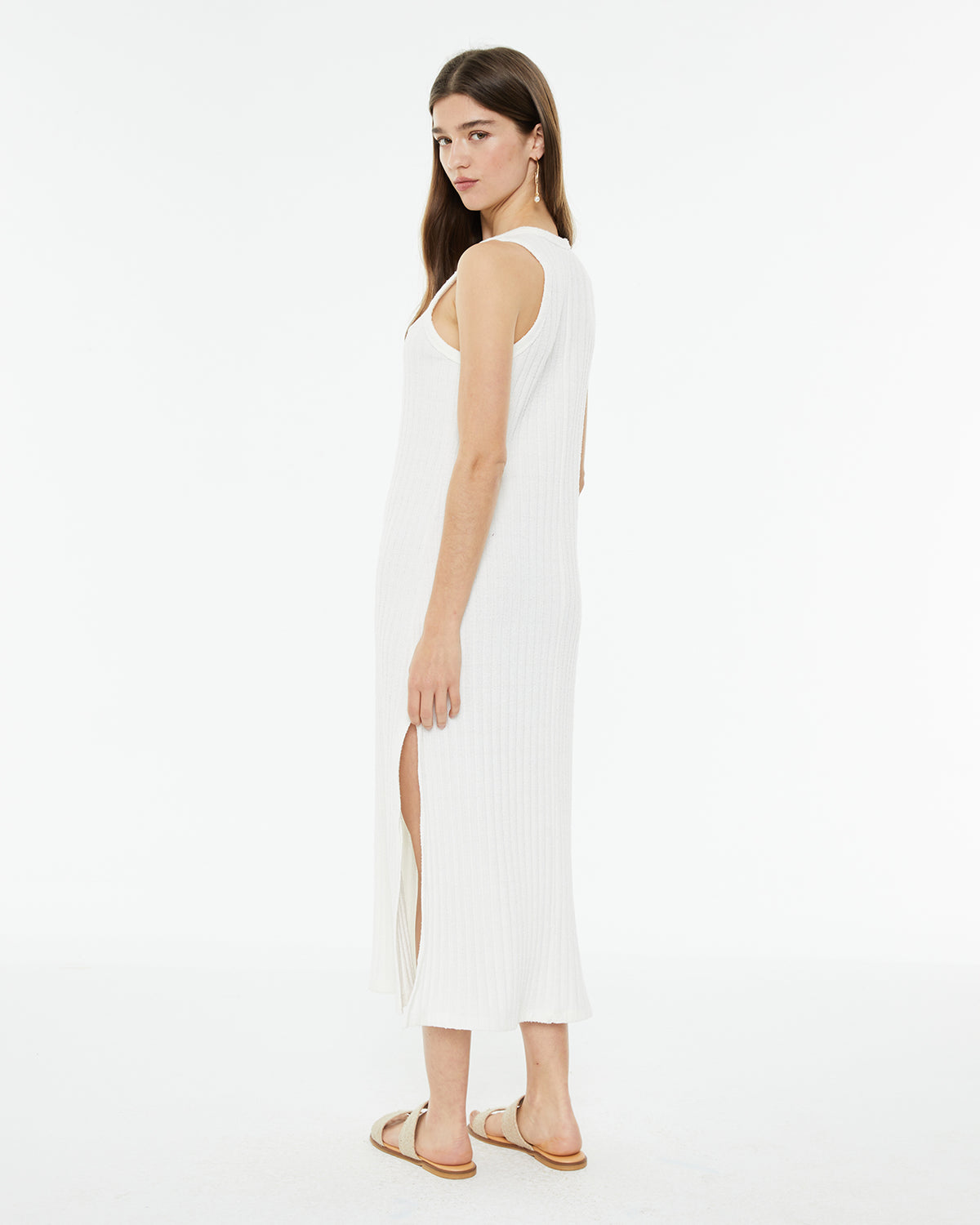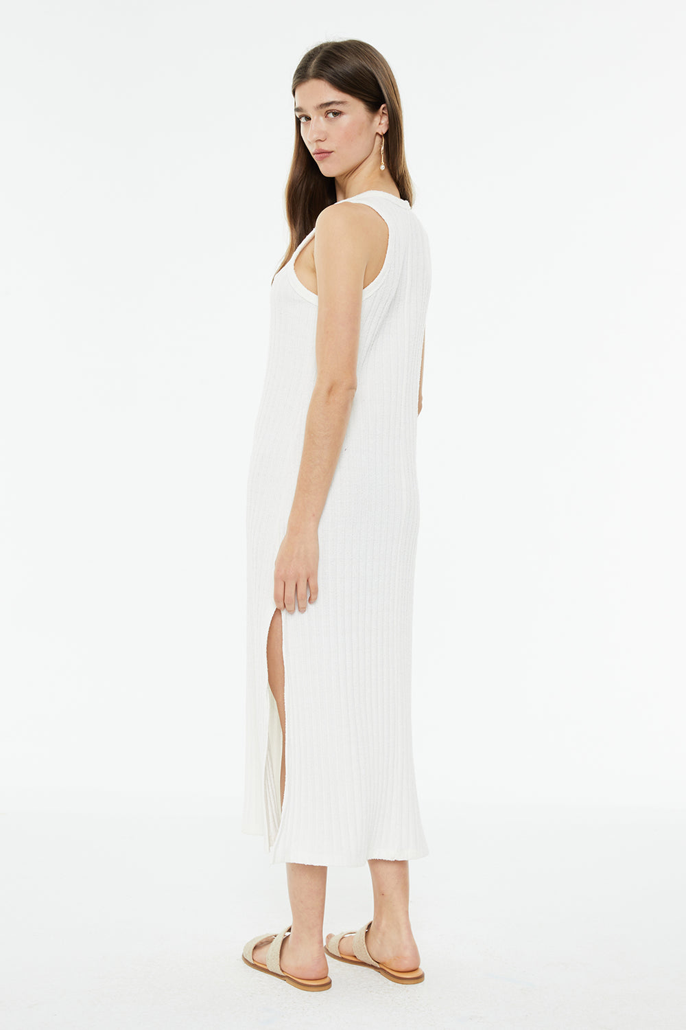 Vestido de mujer confort, talle midi, con escote redondo, de tirantes y detalle de abertura en el lateral. Prenda sostenible.