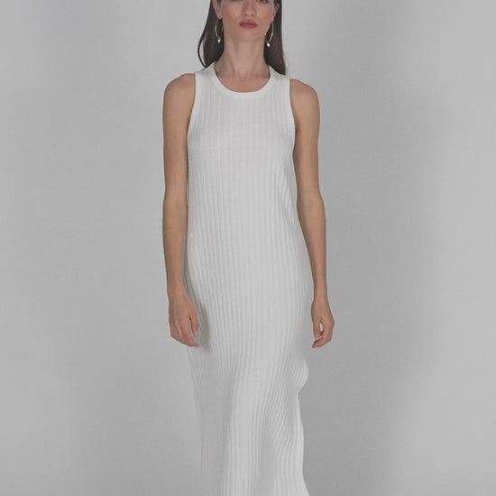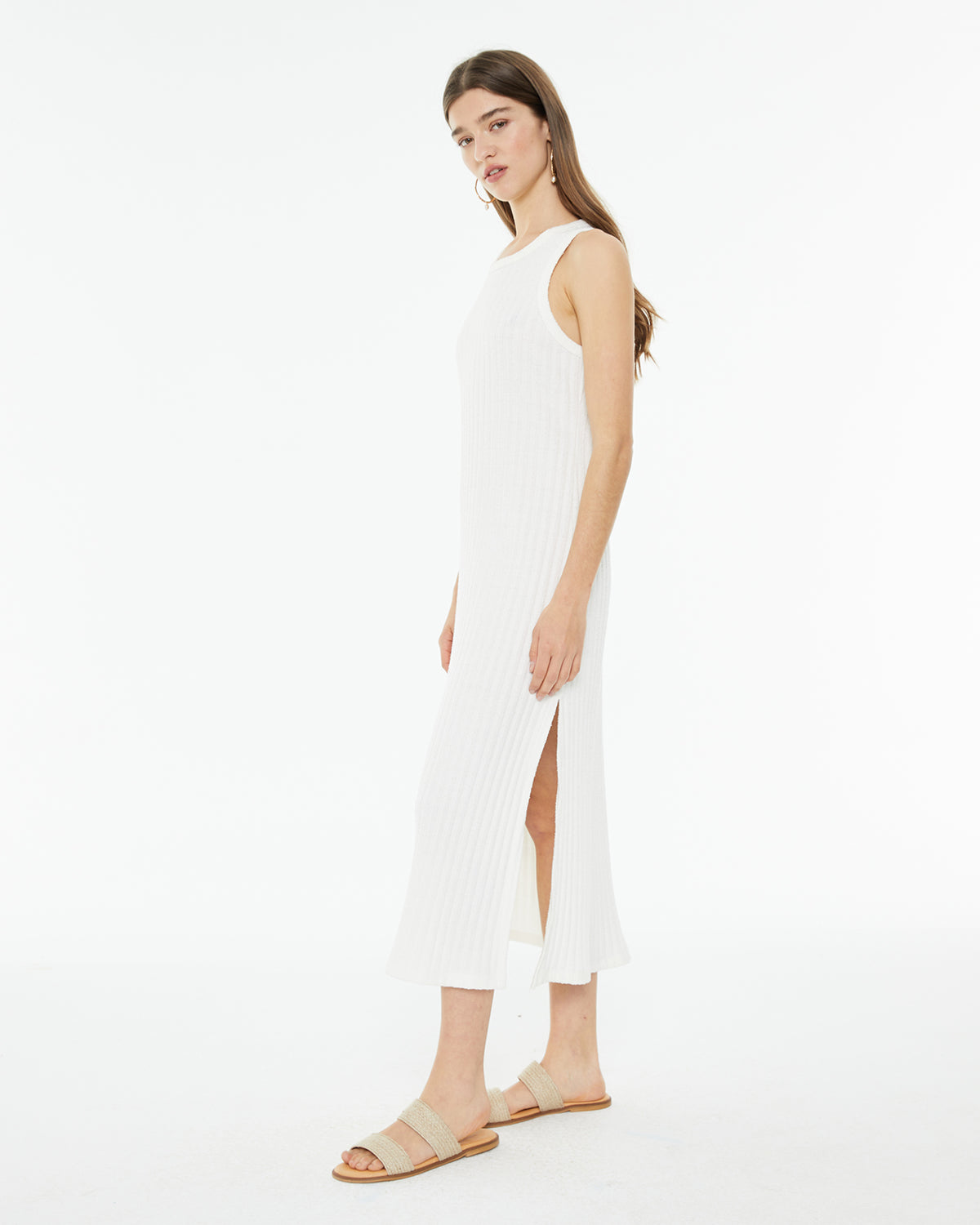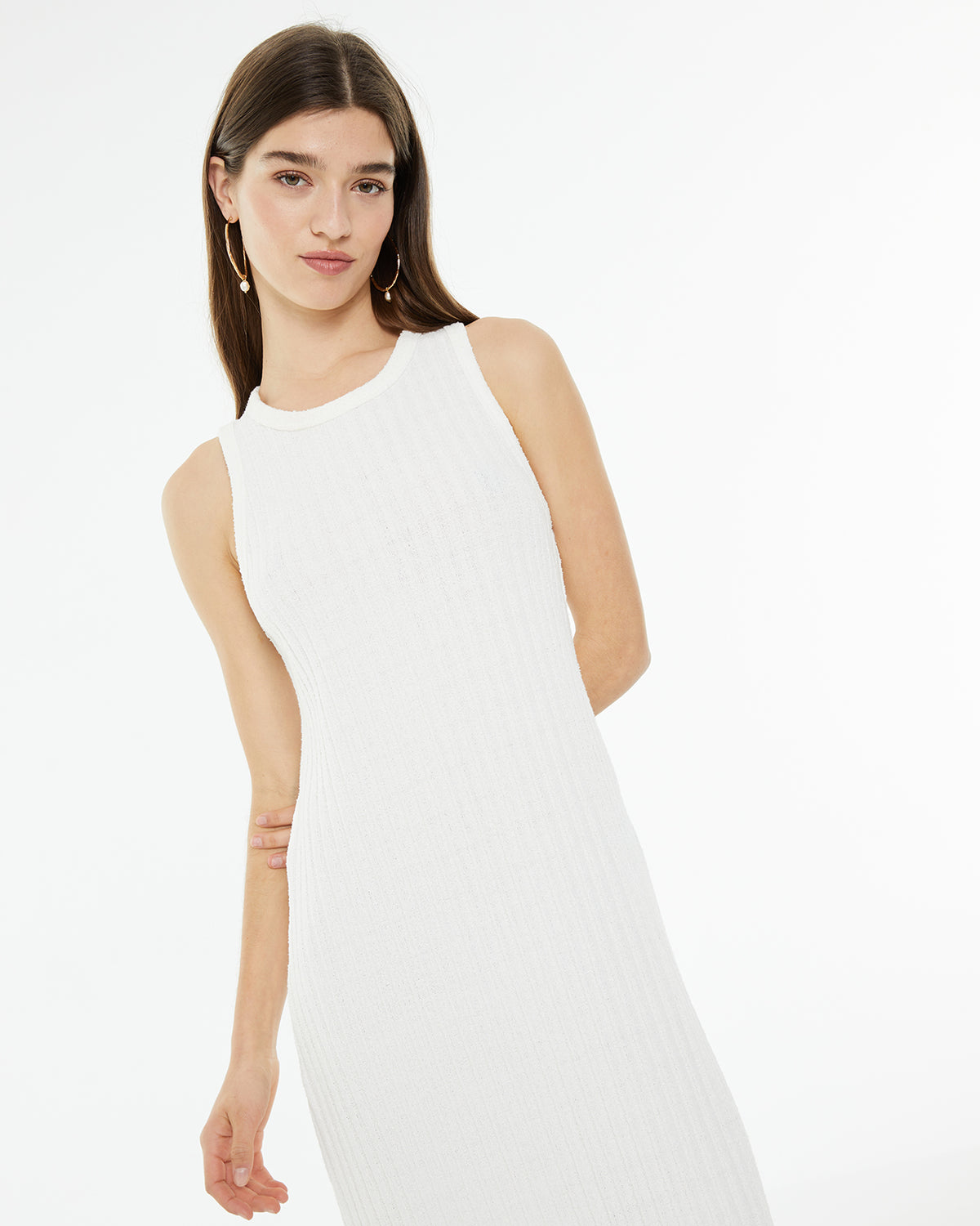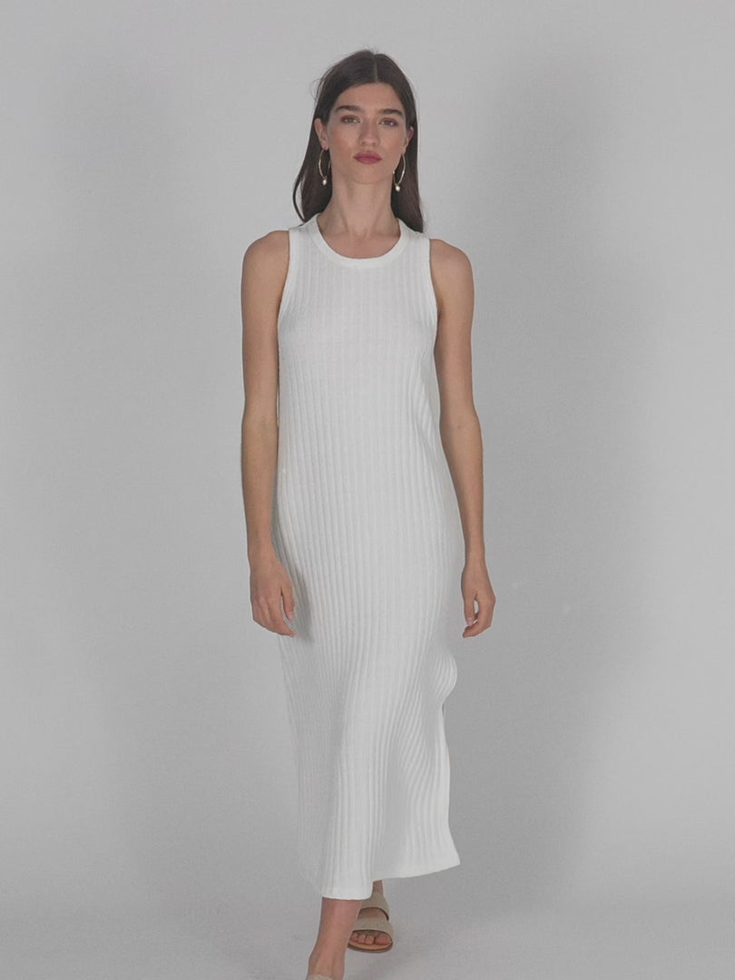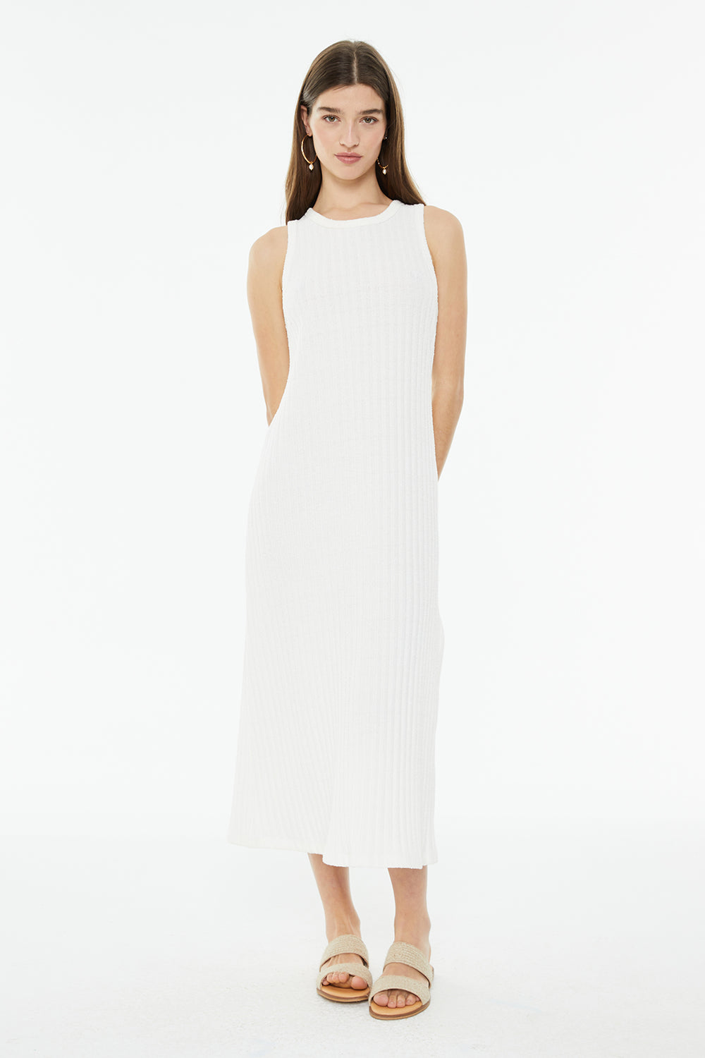 Vestido de mujer confort, talle midi, con escote redondo, de tirantes y detalle de abertura en el lateral. Prenda sostenible.