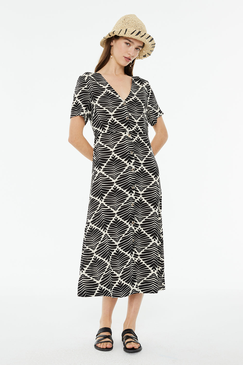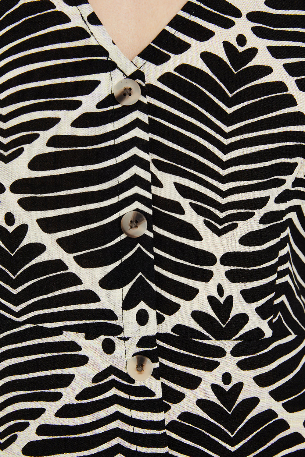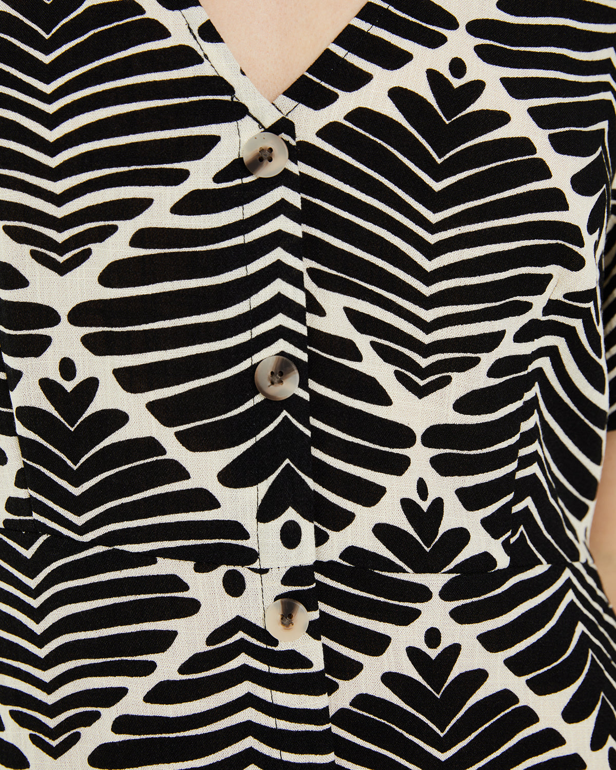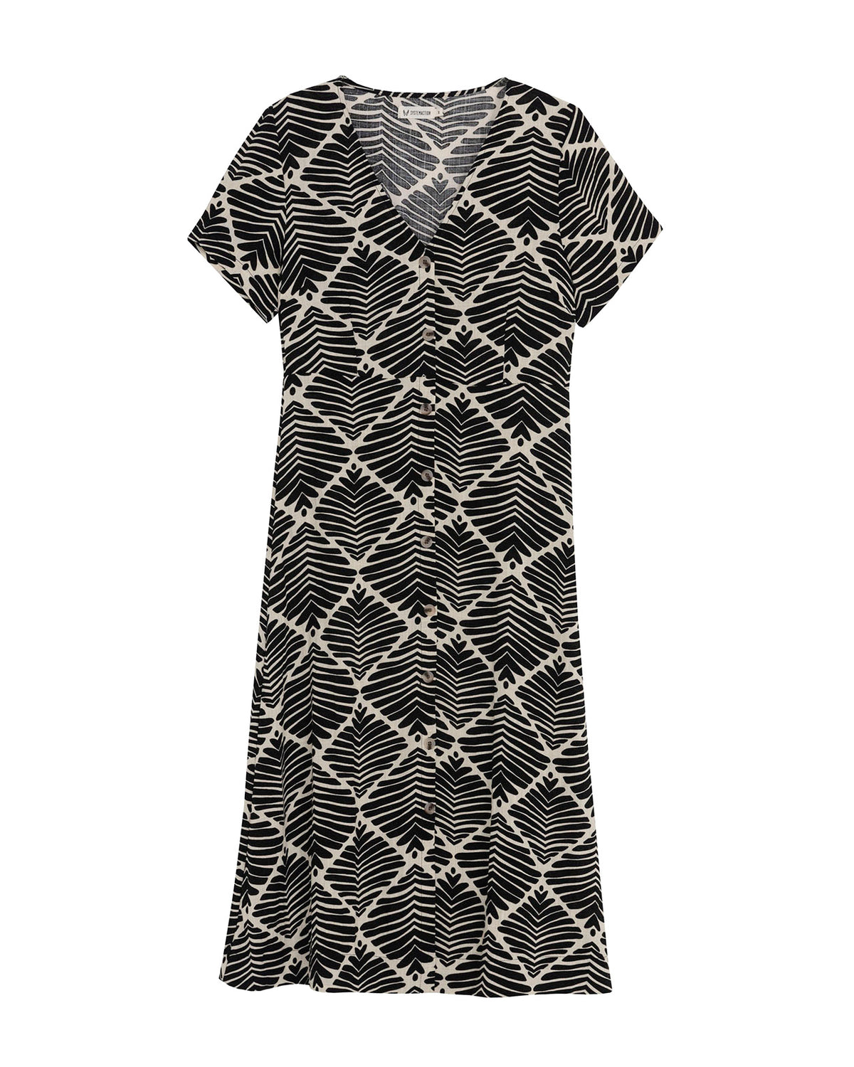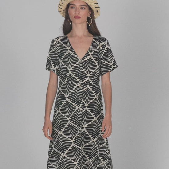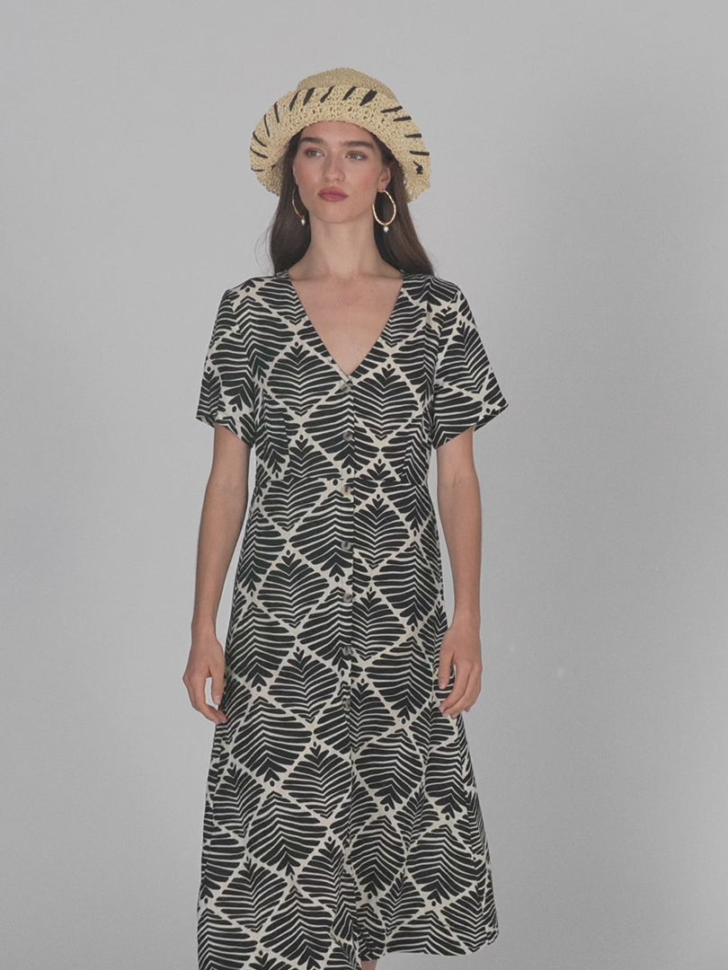 Vestido de mujer con un estampado geométrico bicolor. Con cuello pico y cierre frontal con botones. Manga corta y ancha.