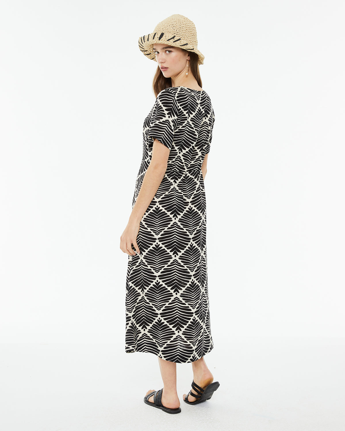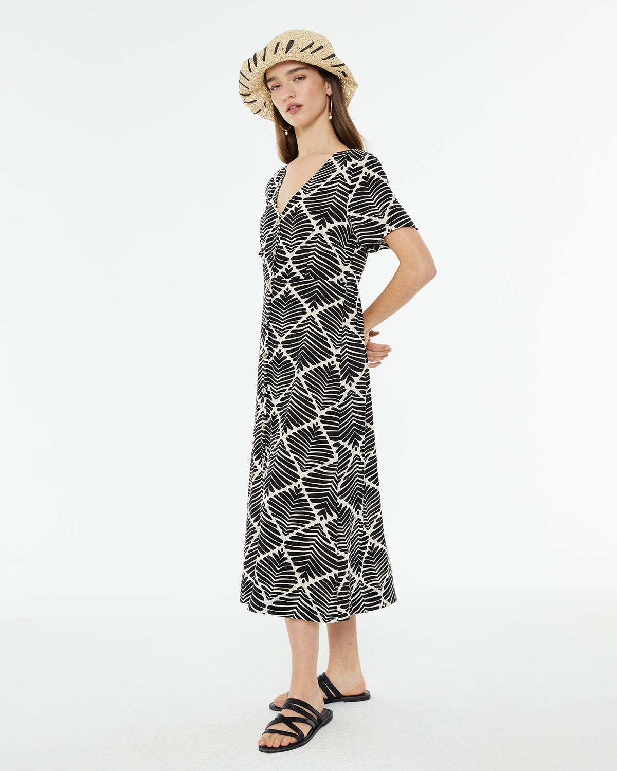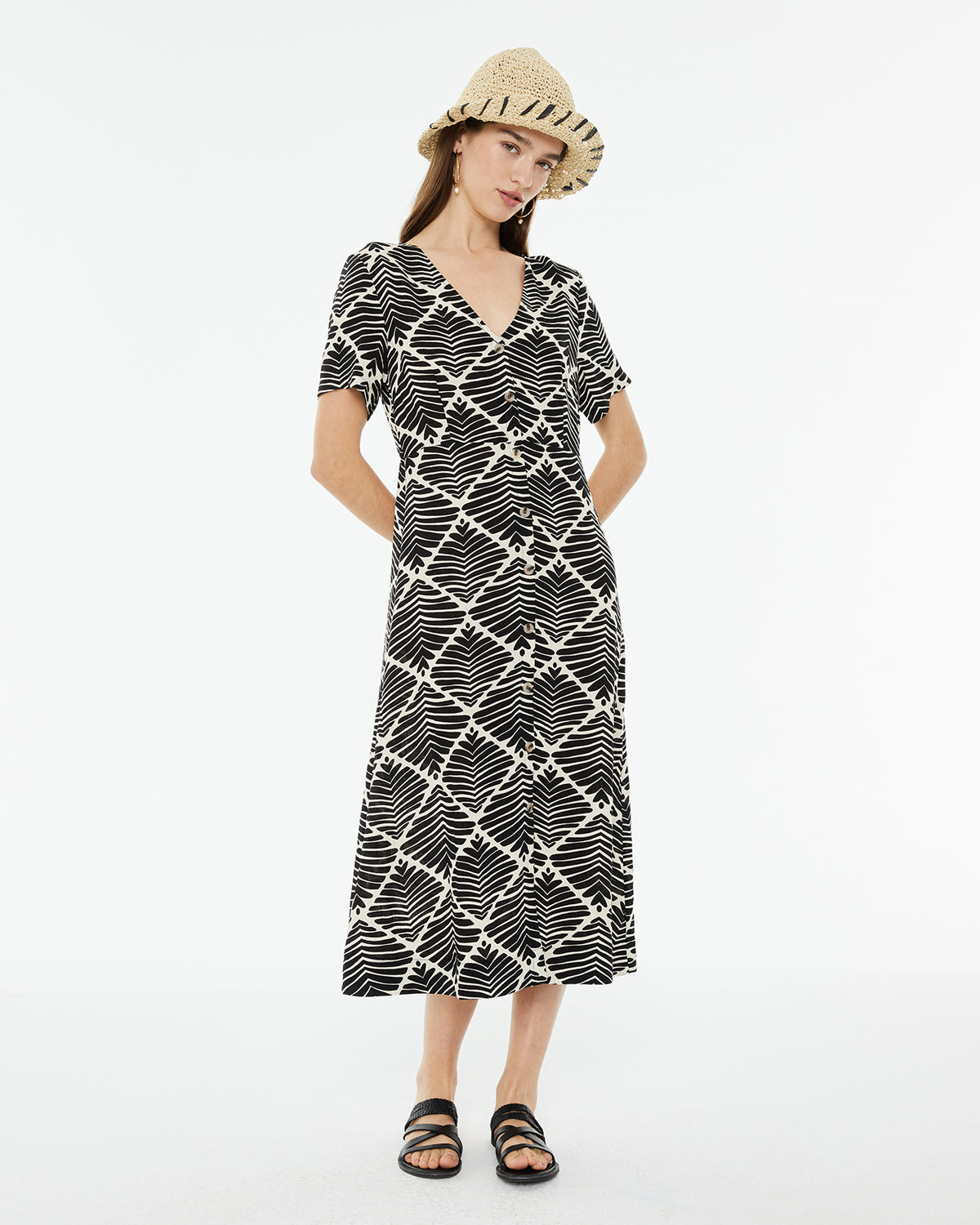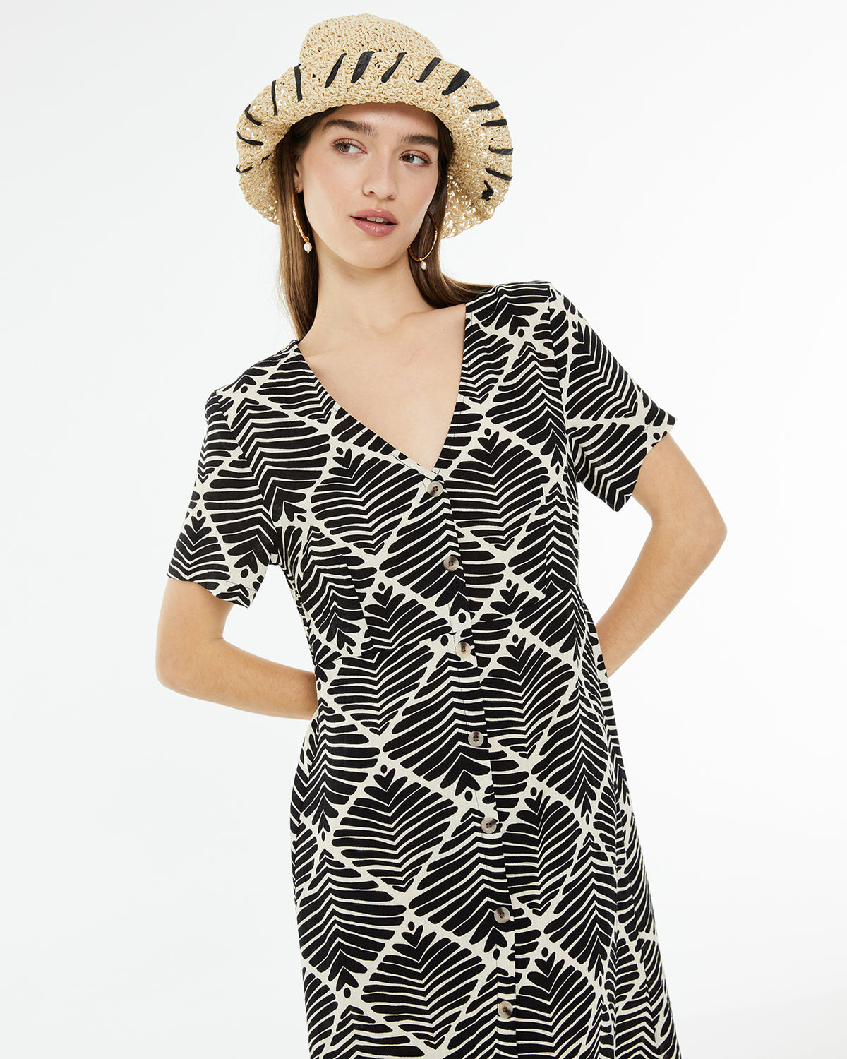 Vestido de mujer con un estampado geométrico bicolor. Con cuello pico y cierre frontal con botones. Manga corta y ancha.