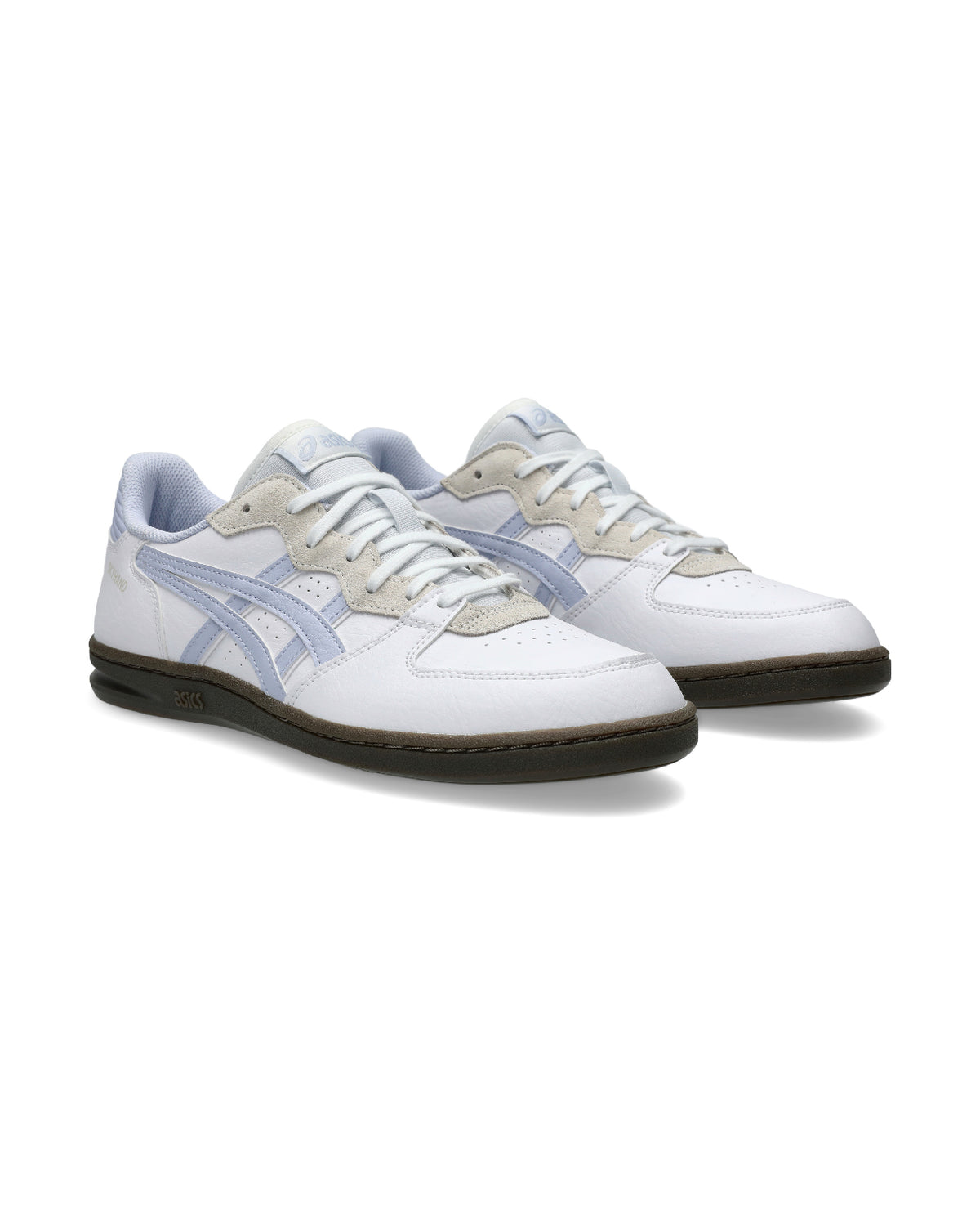 Zapatilla Asics Skyhand OG blanco y azul claro. Cuenta con paneles de cuero sintético y ante y la suela de goma.