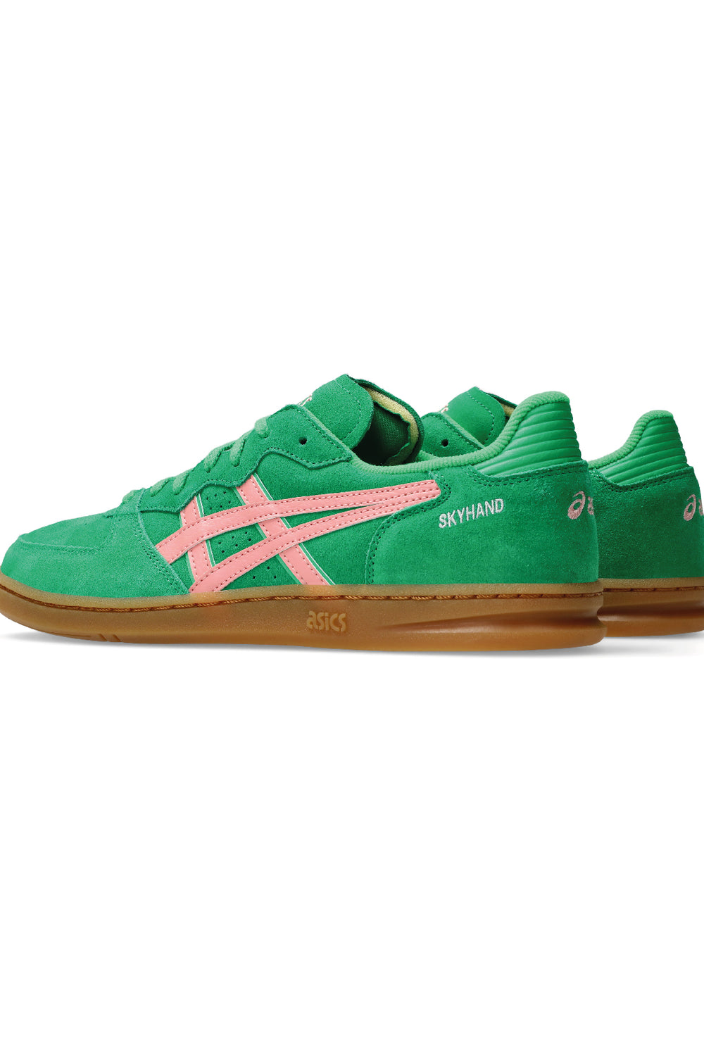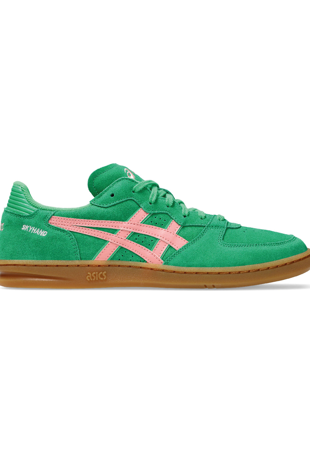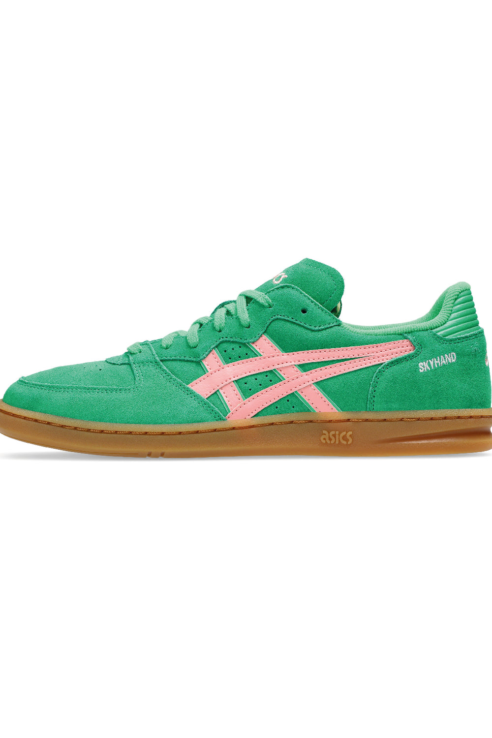 Zapatilla Asics verde y rosa modelo Skyhand OG. Cuenta con paneles de ante, suela de goma y cuña del talón con amortiguación EVA.