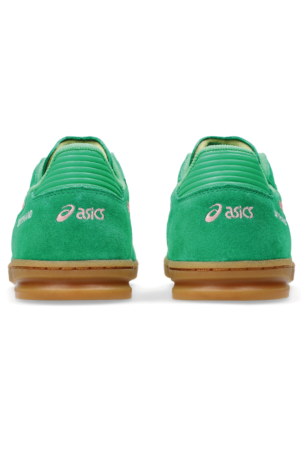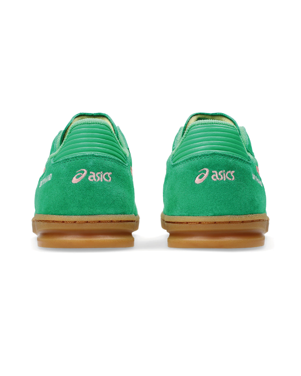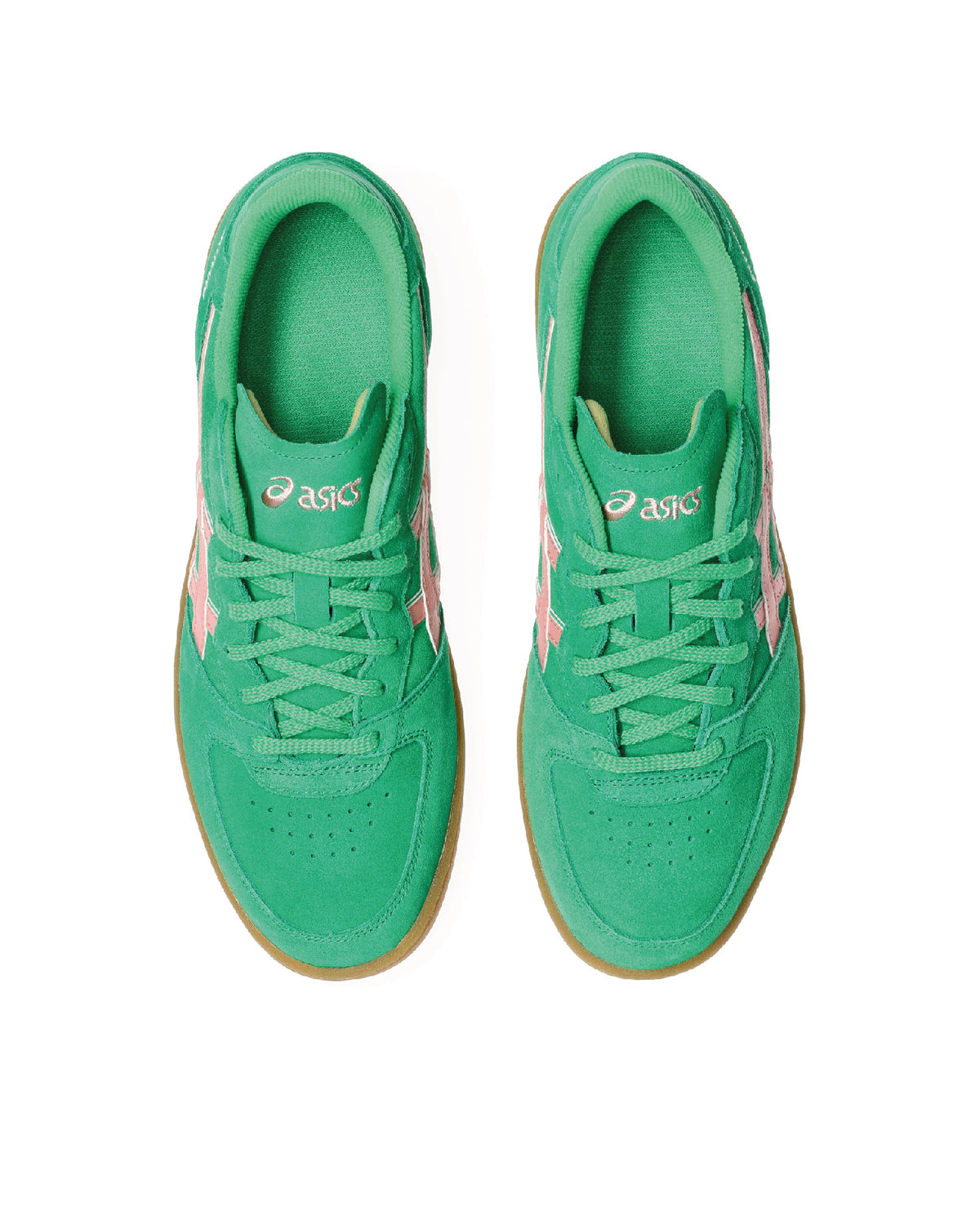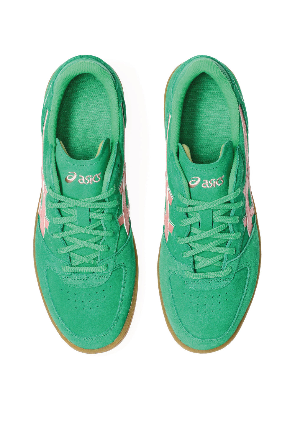 Zapatilla Asics verde y rosa modelo Skyhand OG. Cuenta con paneles de ante, suela de goma y cuña del talón con amortiguación EVA.